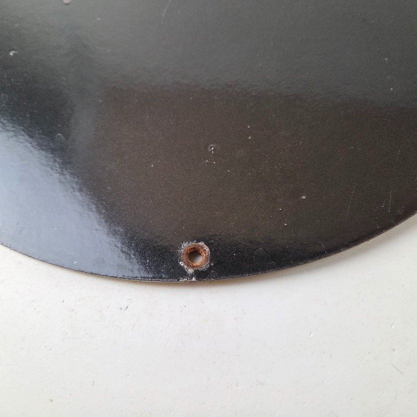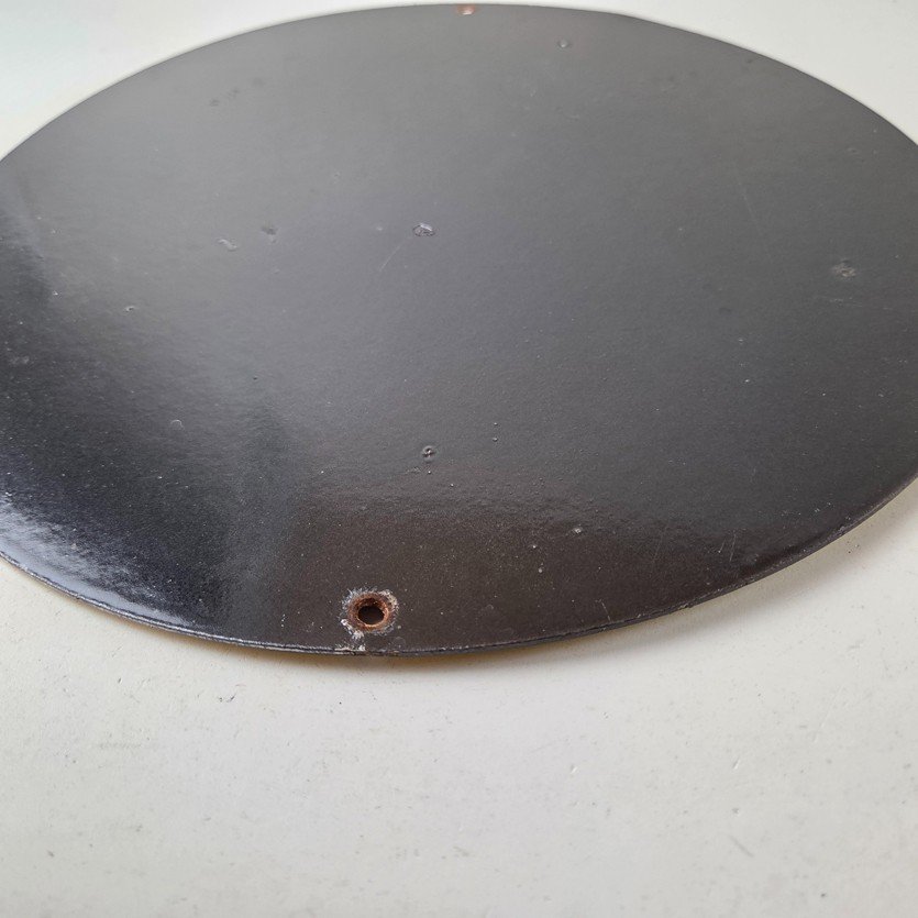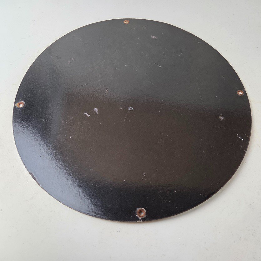 Made of porcelain enamel on steel with patina and wear: rust spotting around the mounting holes, minor edge chips, light surface scratches, and minimal discoloration. This is a porcelain enamel advertising sign in excellent condition, exactly as shown in the photos.