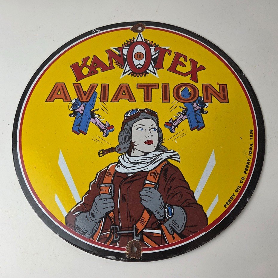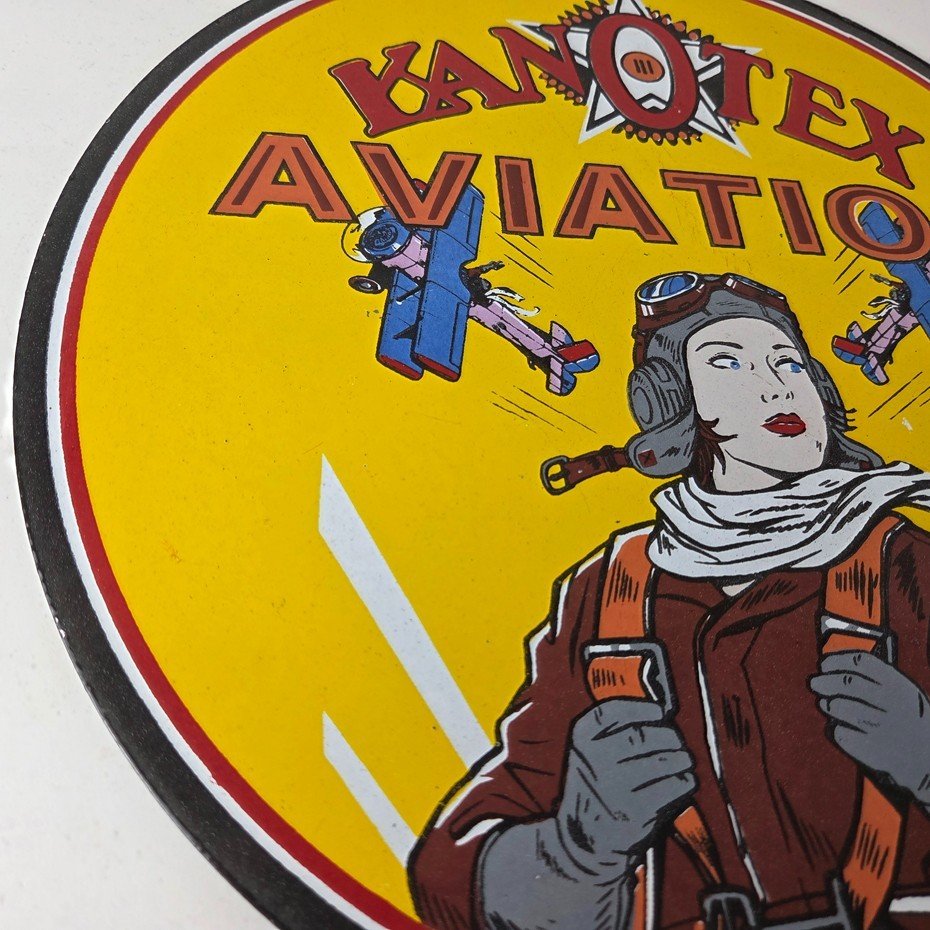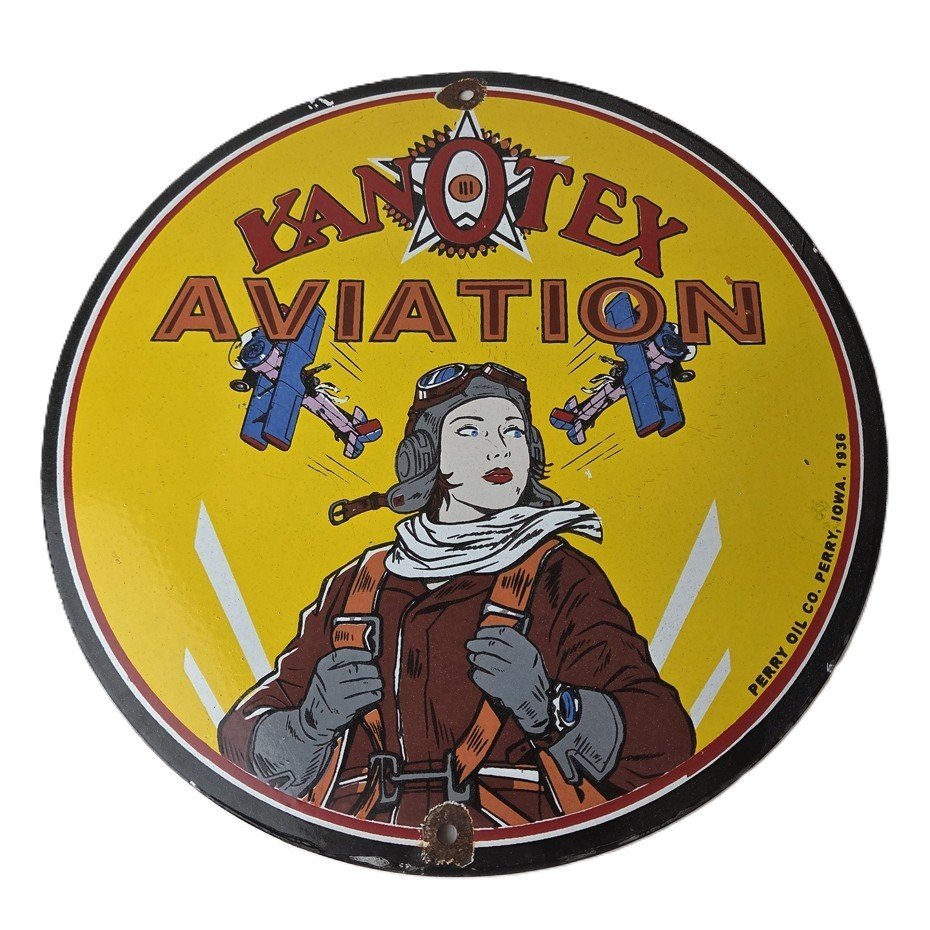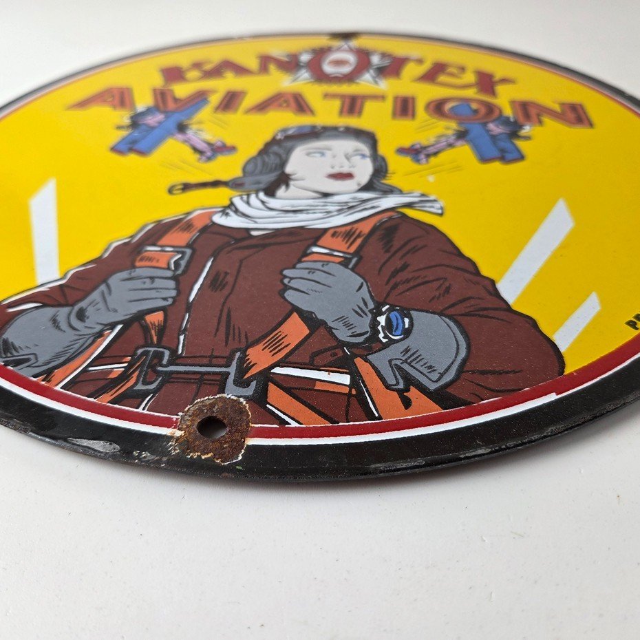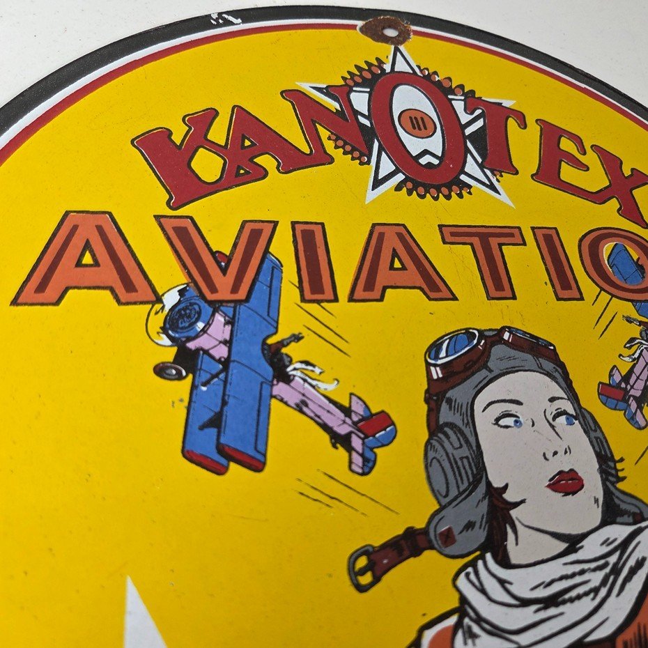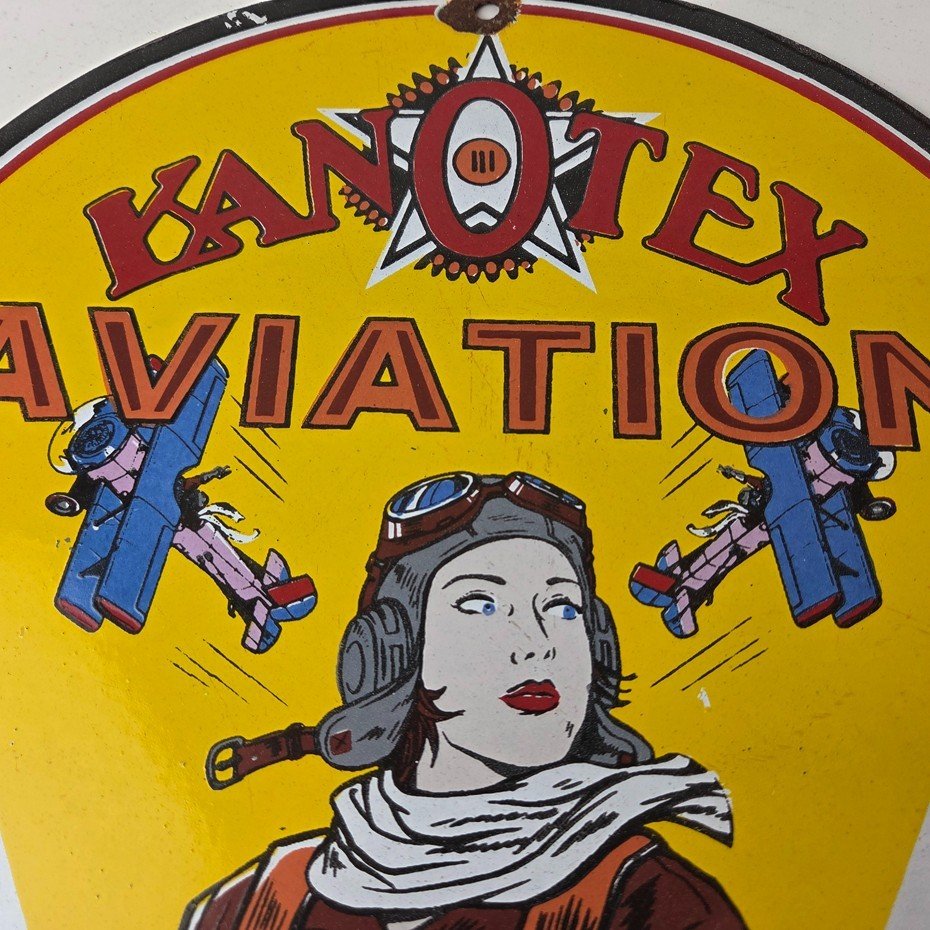 This vintage Kanotex Motor Oil porcelain sign featuring the Military pin-up aviator girl. This has vibrant colors of red, yellow and blue with excellent porcelain and measures 12″ across.