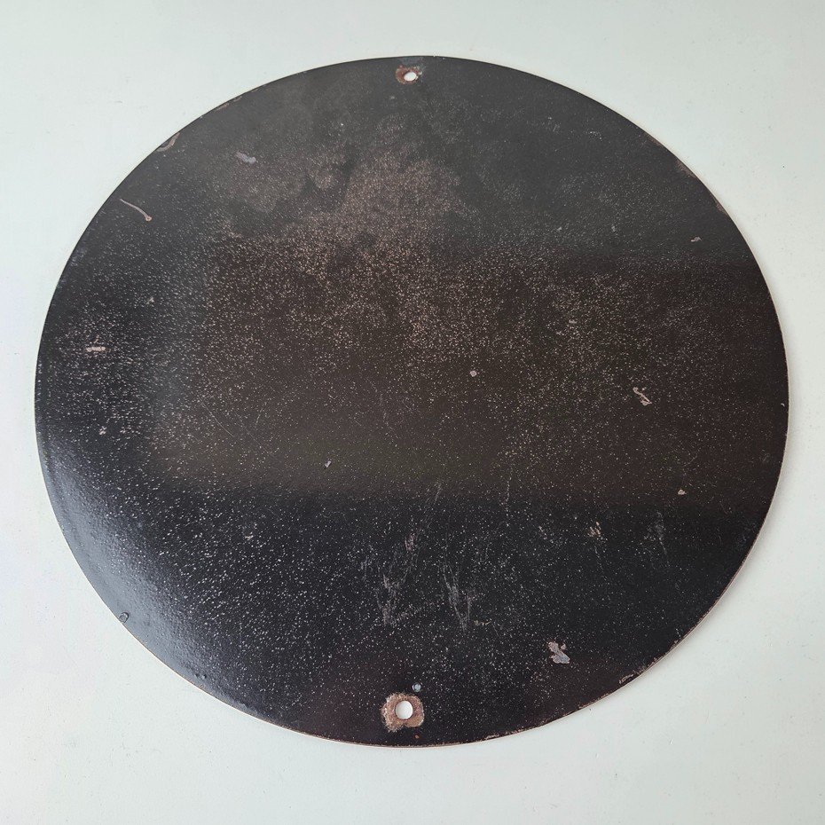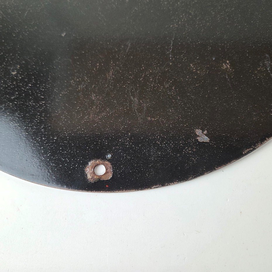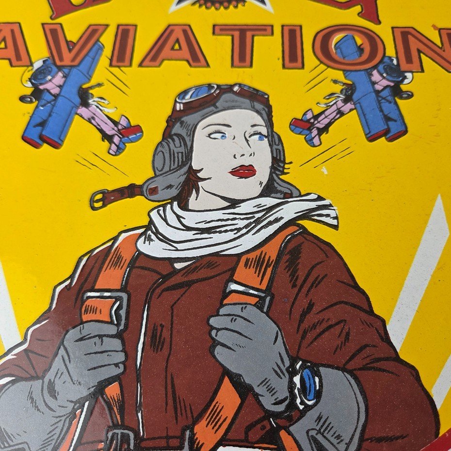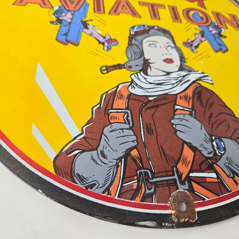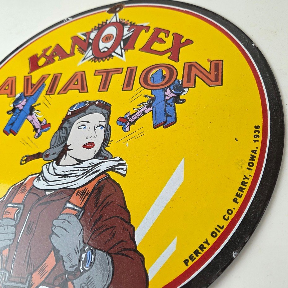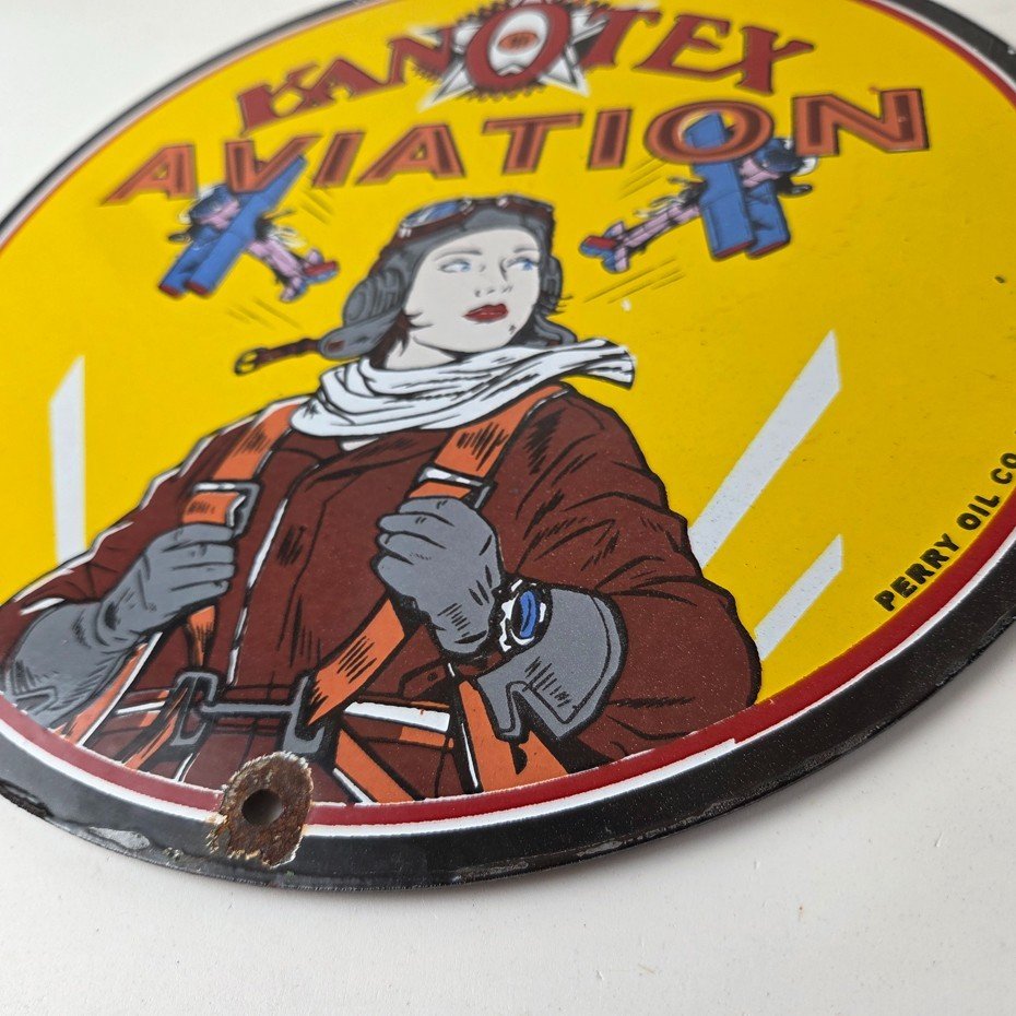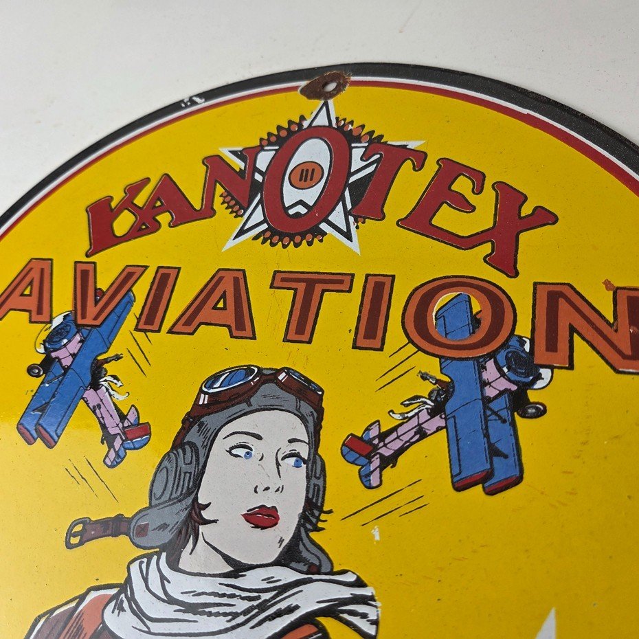 This vintage Kanotex Motor Oil porcelain sign featuring the Military pin-up aviator girl. This has vibrant colors of red, yellow and blue with excellent porcelain and measures 12″ across.