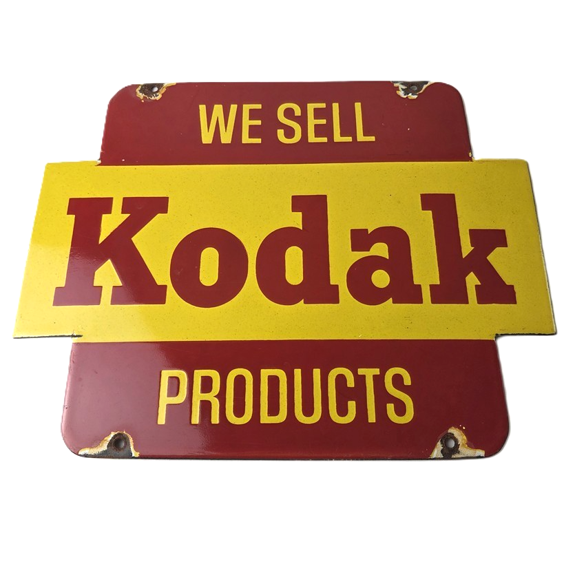 Featuring the iconic Photography sign “We Sell Kodak Products”. Measuring 12″ by 9 1/2″, it is the perfect size for display in a garage, man cave, or game room. It features the Kodak logo with large lettering. This porcelain gas sign is unique and would make a great addition to any collection.