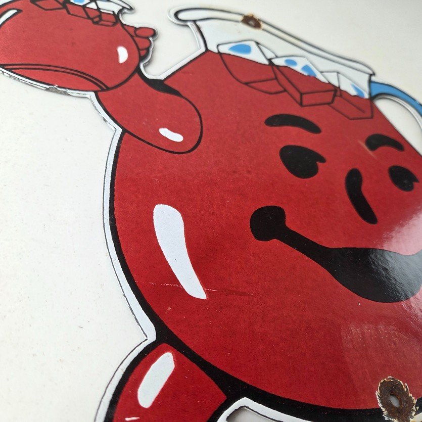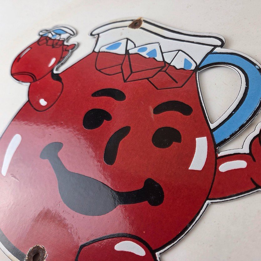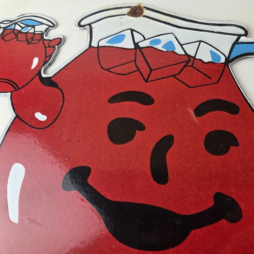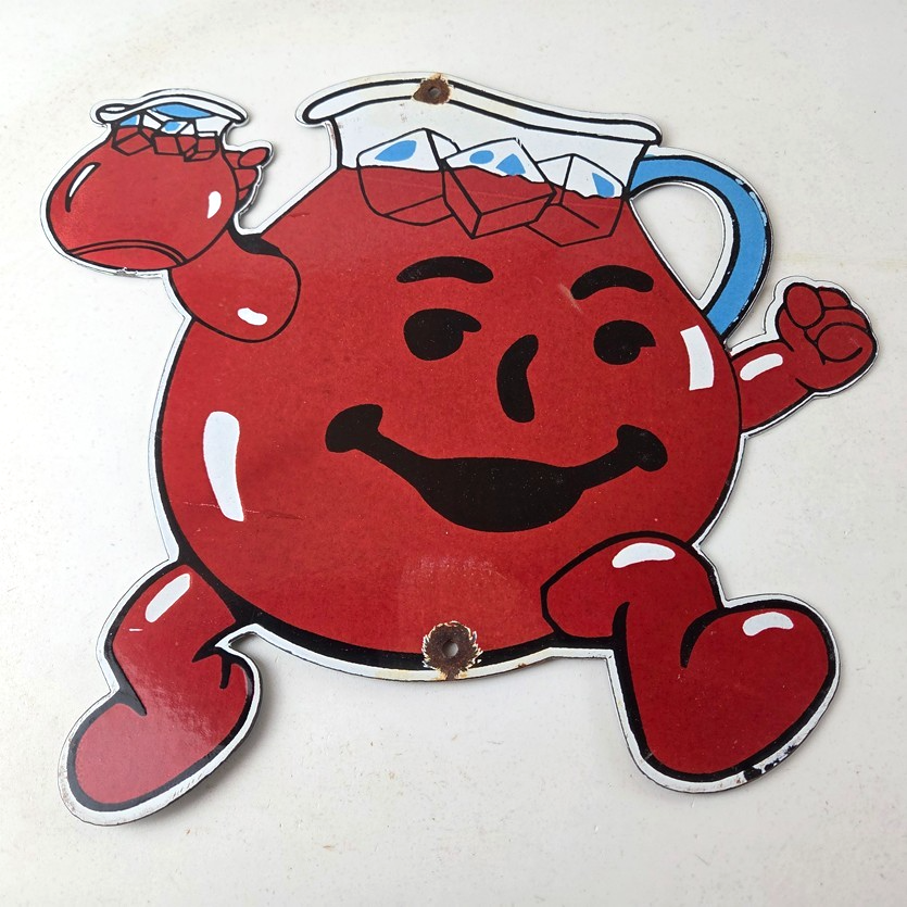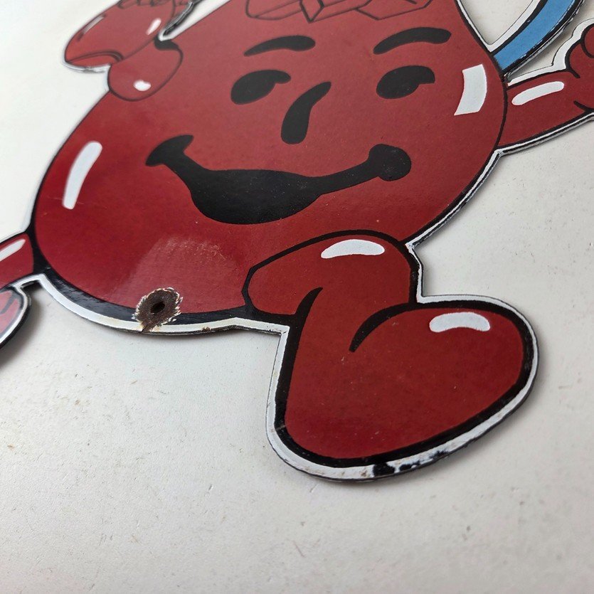 This vintage Kool-Aid Fruit Drink porcelain sign features the iconic Kool-Aid Man, with the shape of the Kool Aid man holding a pitcher of the fruit drink. Add a vintage touch to your gas station or soda beverage collection with this Kool-Aid sign. Measuring 10″ x 11″, this sign has excellent colors and porcelain.