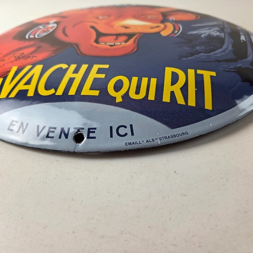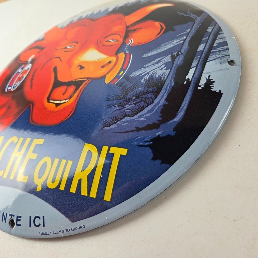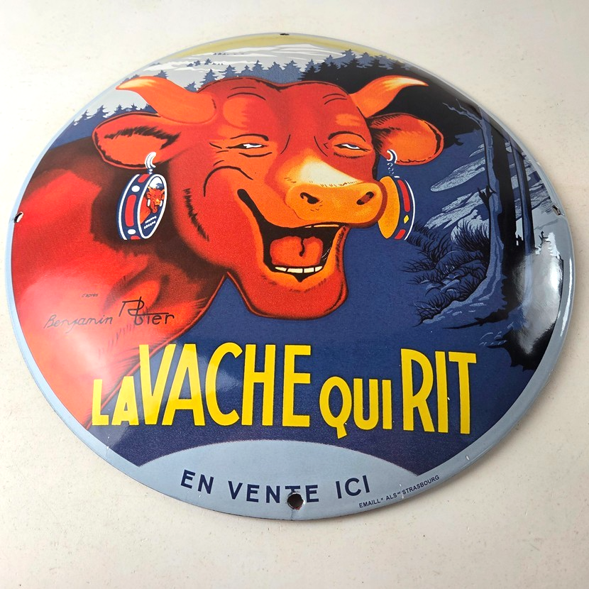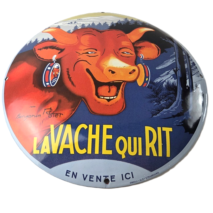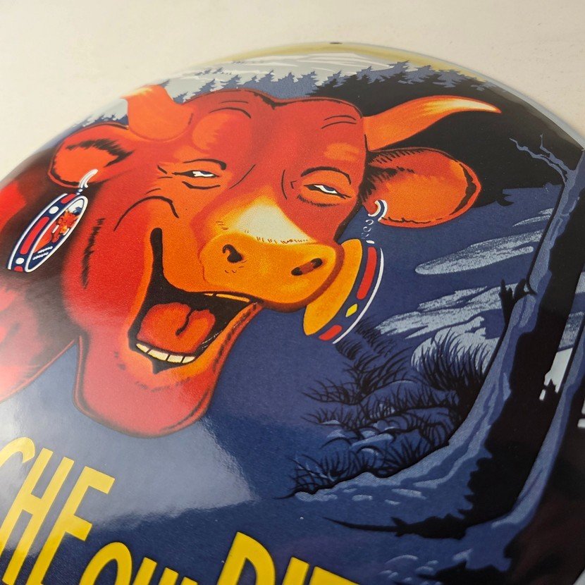 This vintage LaVache Qui Rit porcelain dome shaped sign features the iconic Cow, advertising for Dairy Cheese. Add a vintage touch to your gas station or soda beverage collection with this Borden’s sign. Measuring 11″, this sign has excellent colors and porcelain.
