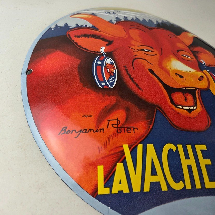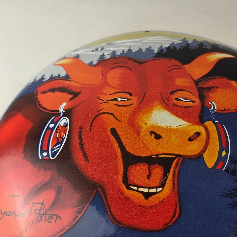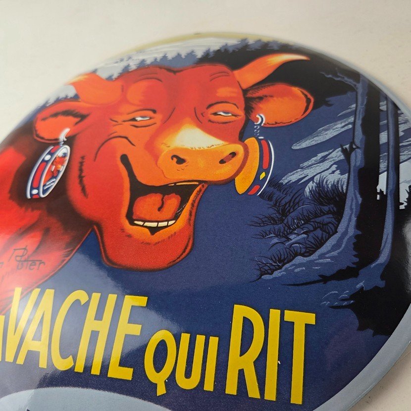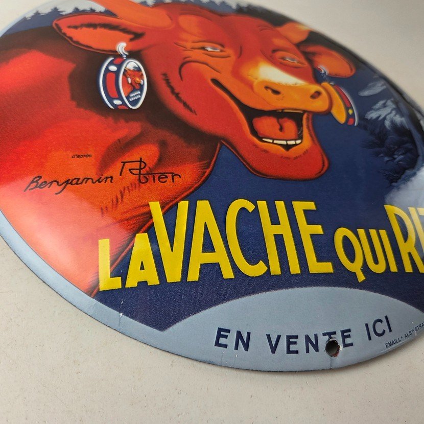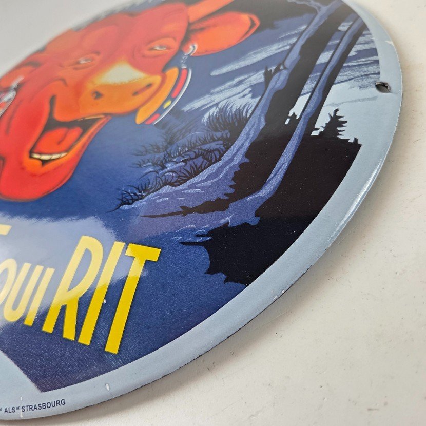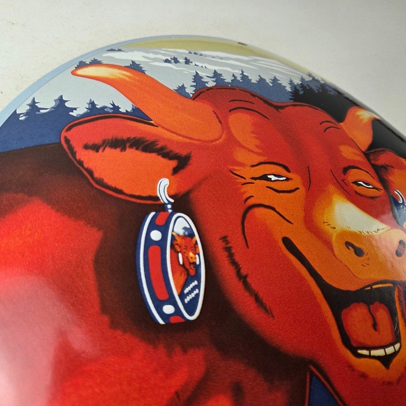 This vintage LaVache Qui Rit porcelain dome shaped sign features the iconic Cow, advertising for Dairy Cheese. Add a vintage touch to your gas station or soda beverage collection with this Borden’s sign. Measuring 11″, this sign has excellent colors and porcelain.