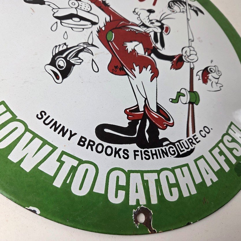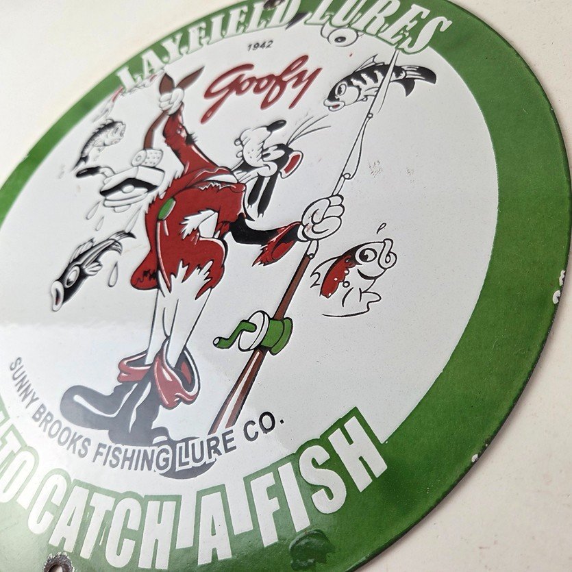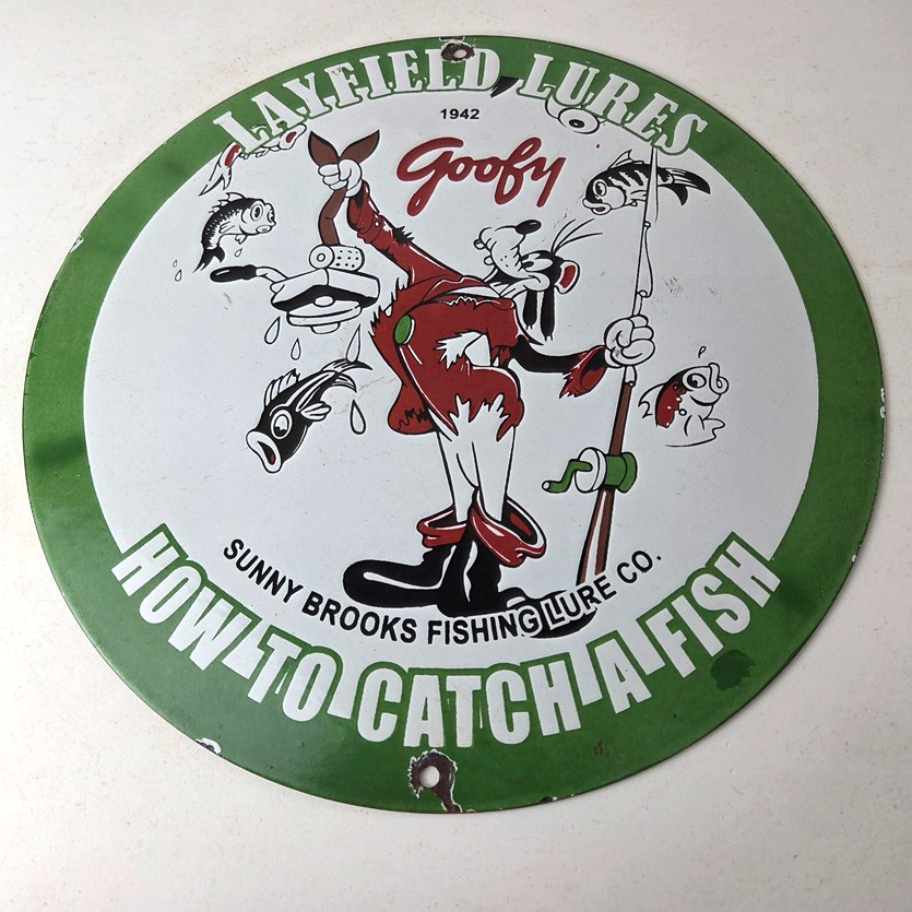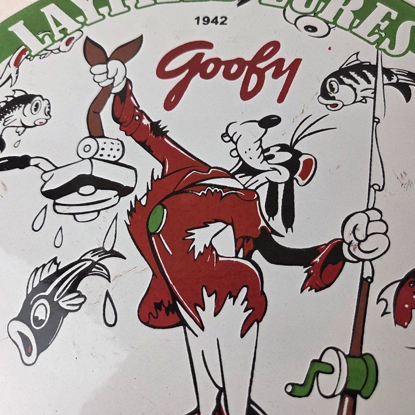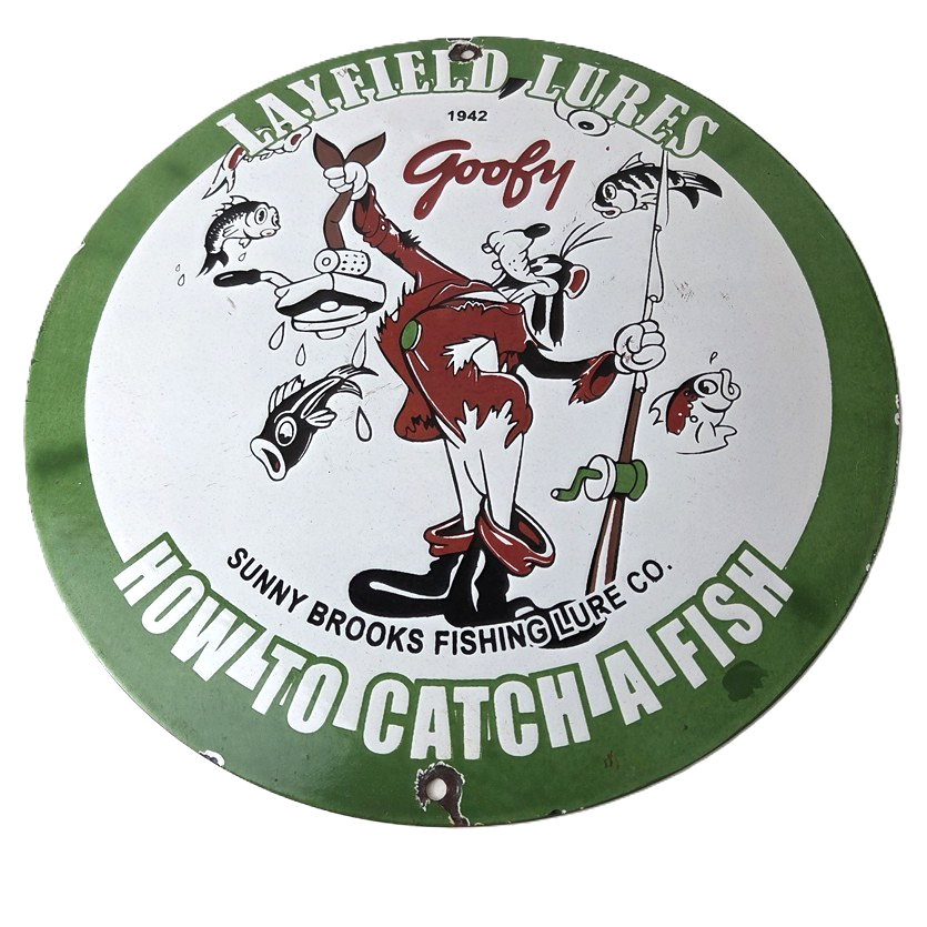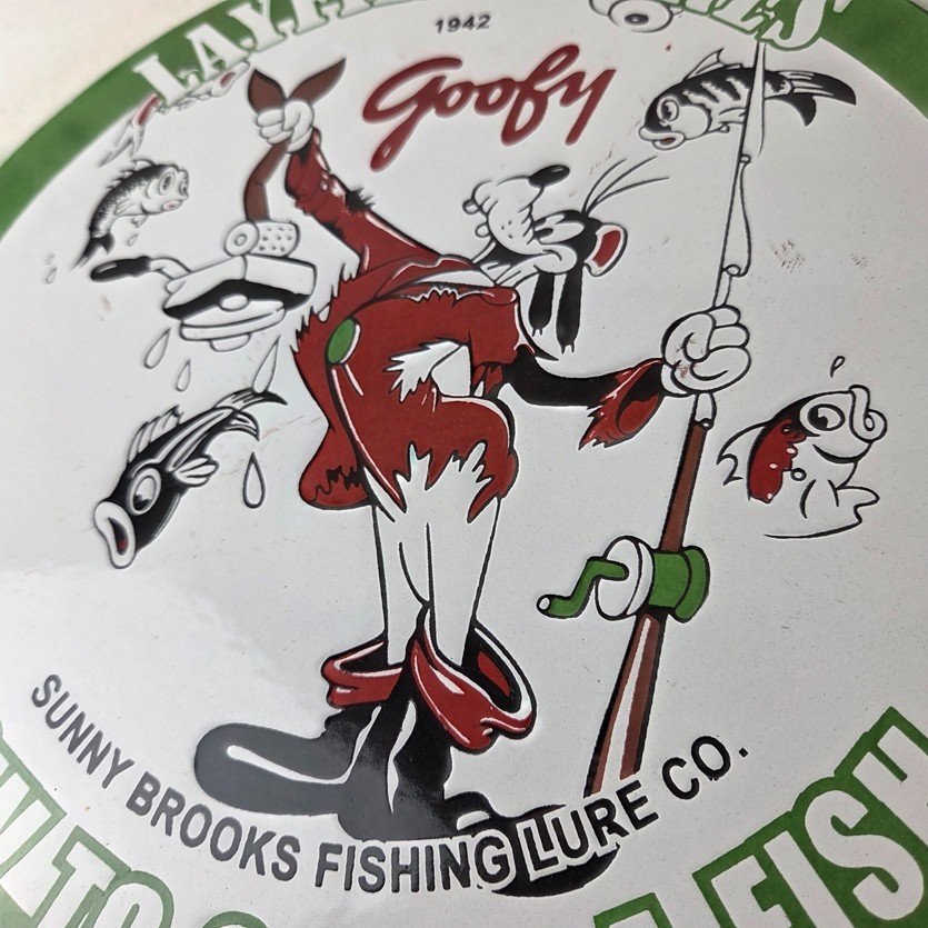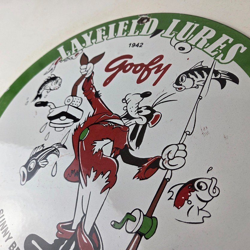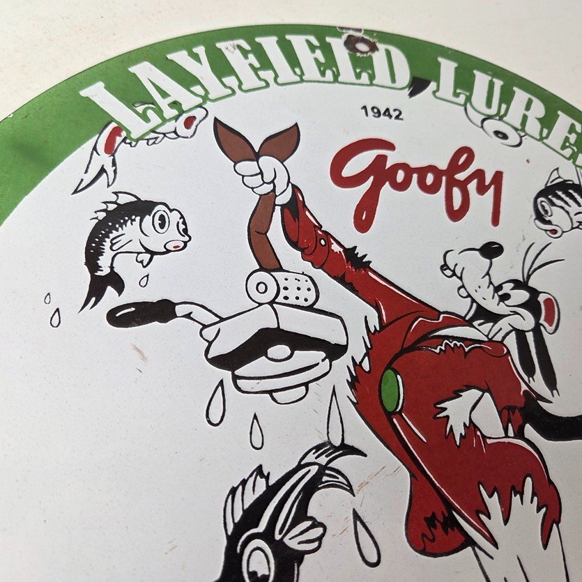 This vintage Layfield Lures porcelain sign features the large bold lettering around the outside with the Walt Disney Character in the center, Goofy. The sign measures 12 inches and features vibrant colors with excellent porcelain.