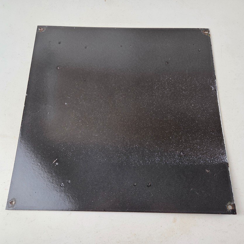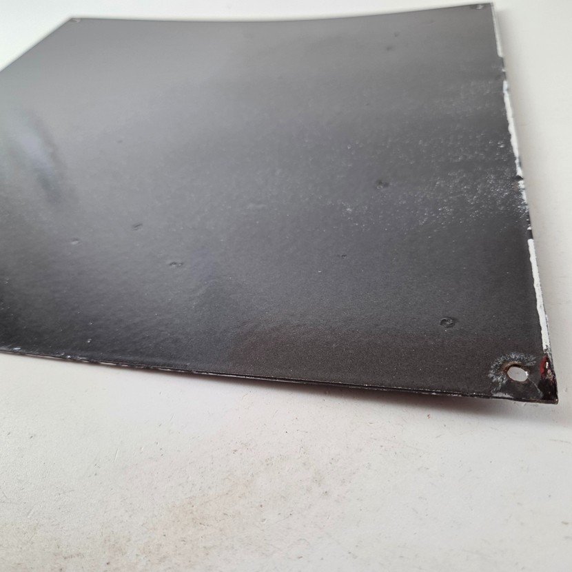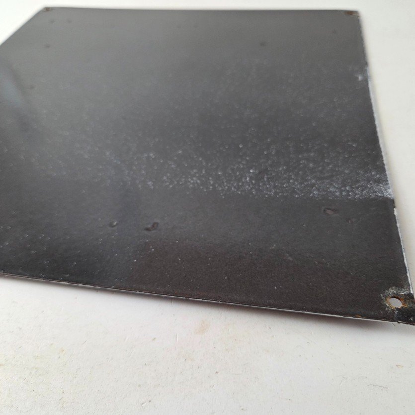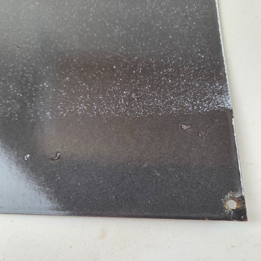 Made of porcelain enamel on steel with patina and wear: rust spotting around the mounting holes, minor edge chips, light surface scratches, and minimal discoloration. This is a porcelain enamel advertising sign in excellent condition, exactly as shown in the photos.