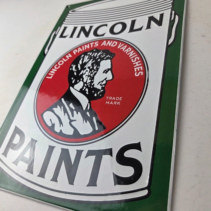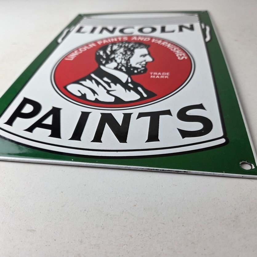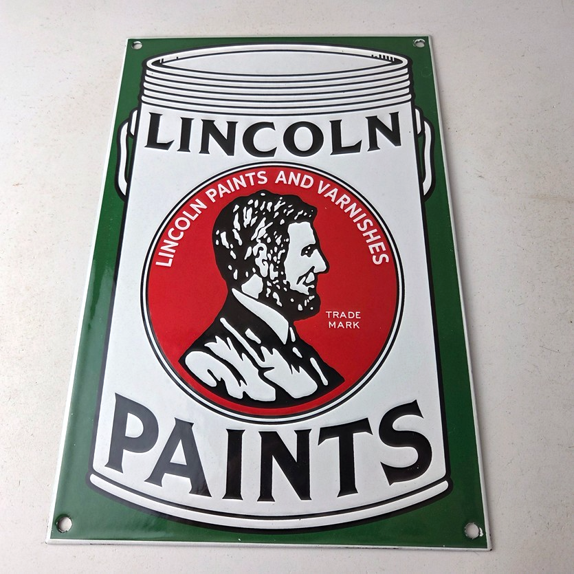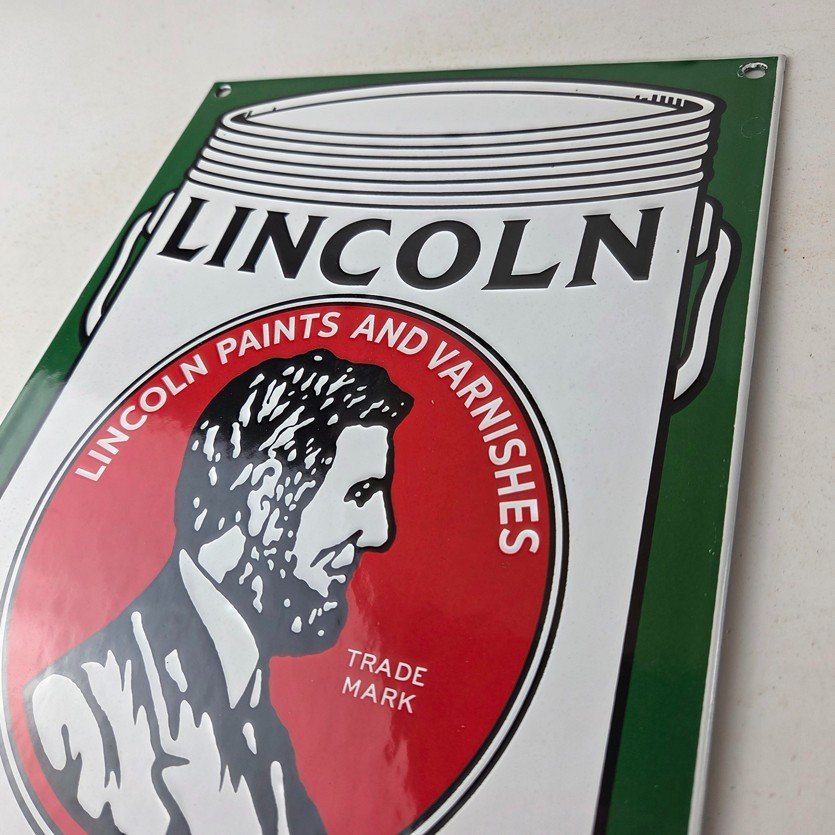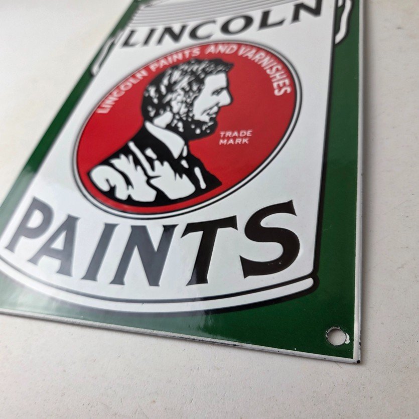 This vintage Lincoln Paints porcelain sign features the iconic Lincoln brand; this porcelain sign showcases the large lettering with the red center and Abraham Lincon. The colors make the sign pop, perfect for adding to a gas and oil or advertising collection.