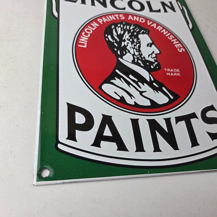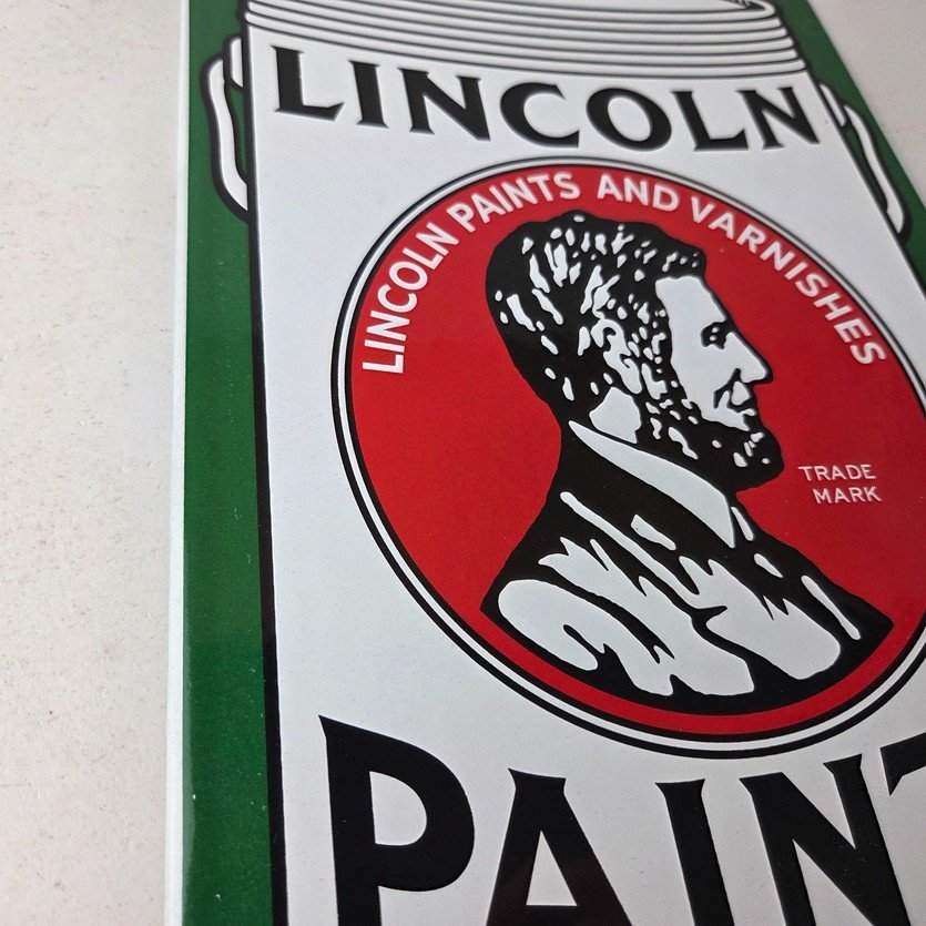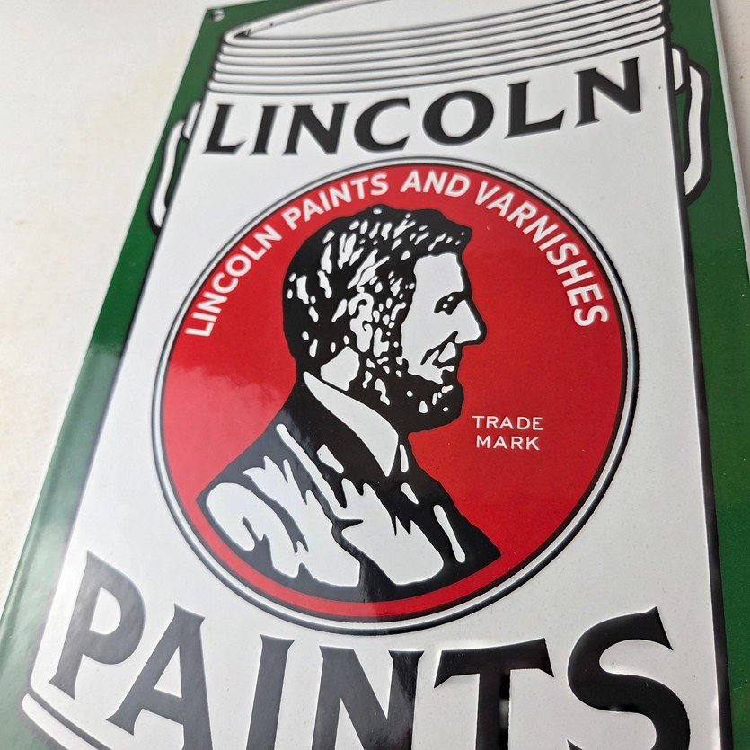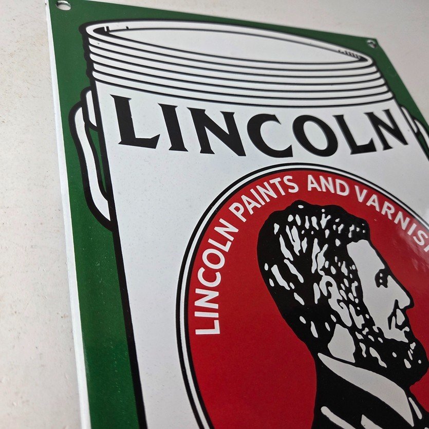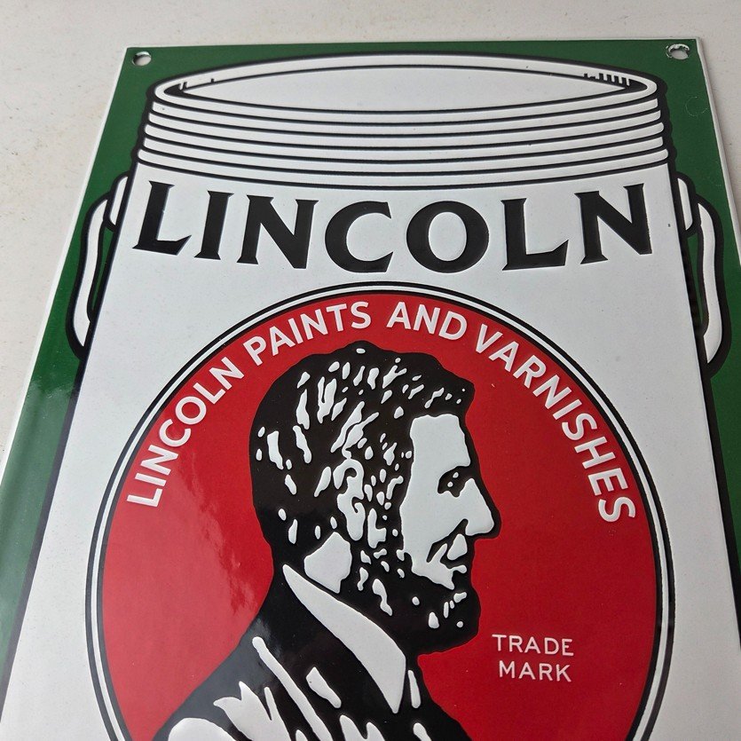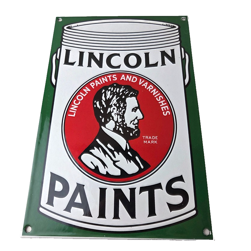 This vintage Lincoln Paints porcelain sign features the iconic Lincoln brand; this porcelain sign showcases the large lettering with the red center and Abraham Lincon. The colors make the sign pop, perfect for adding to a gas and oil or advertising collection.