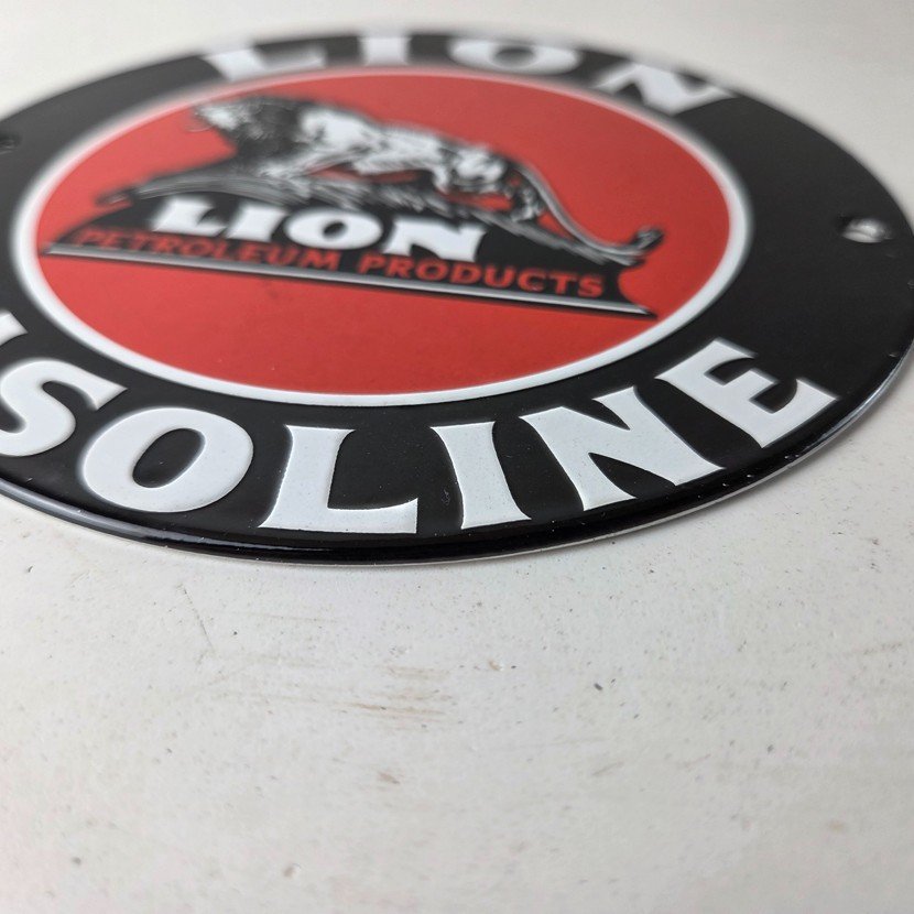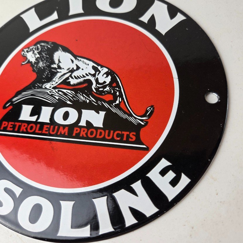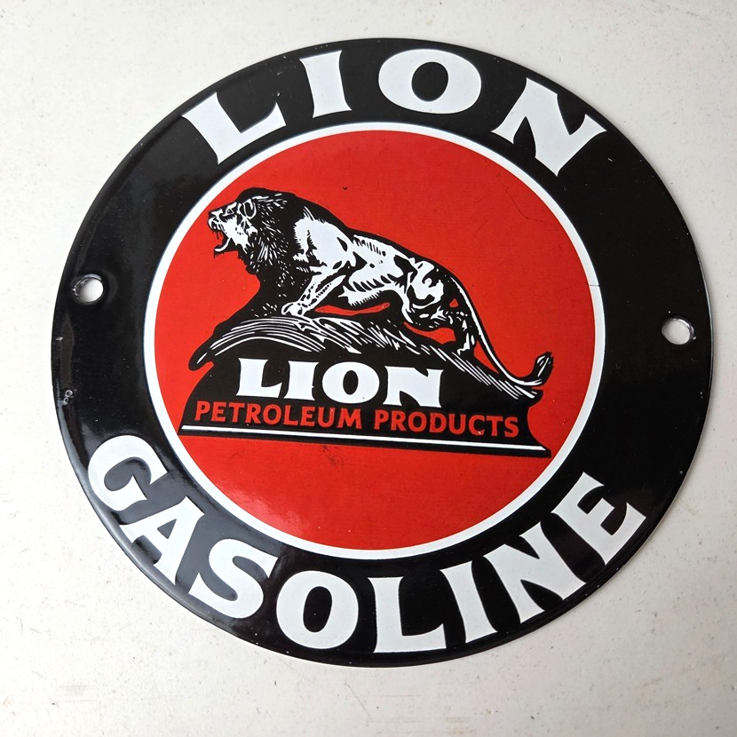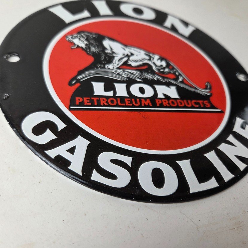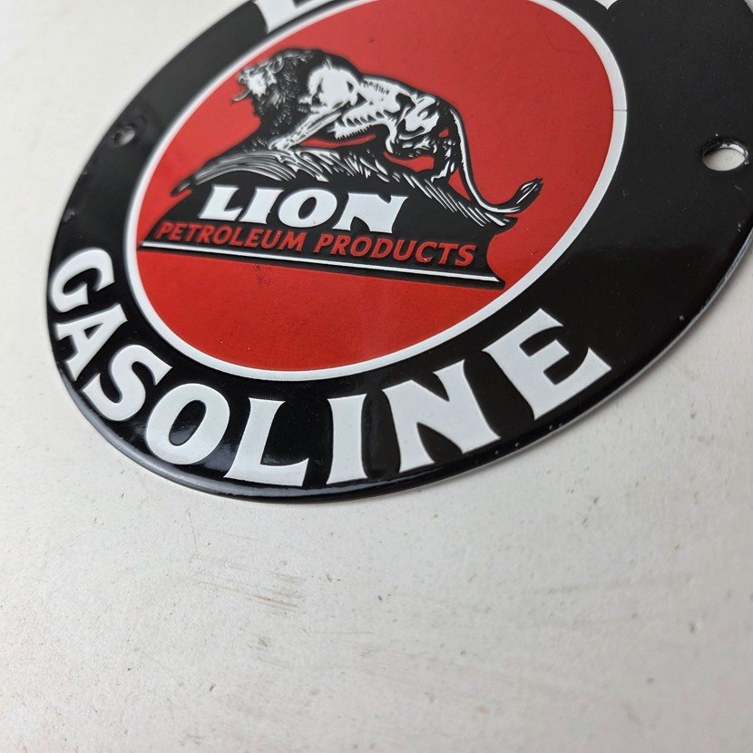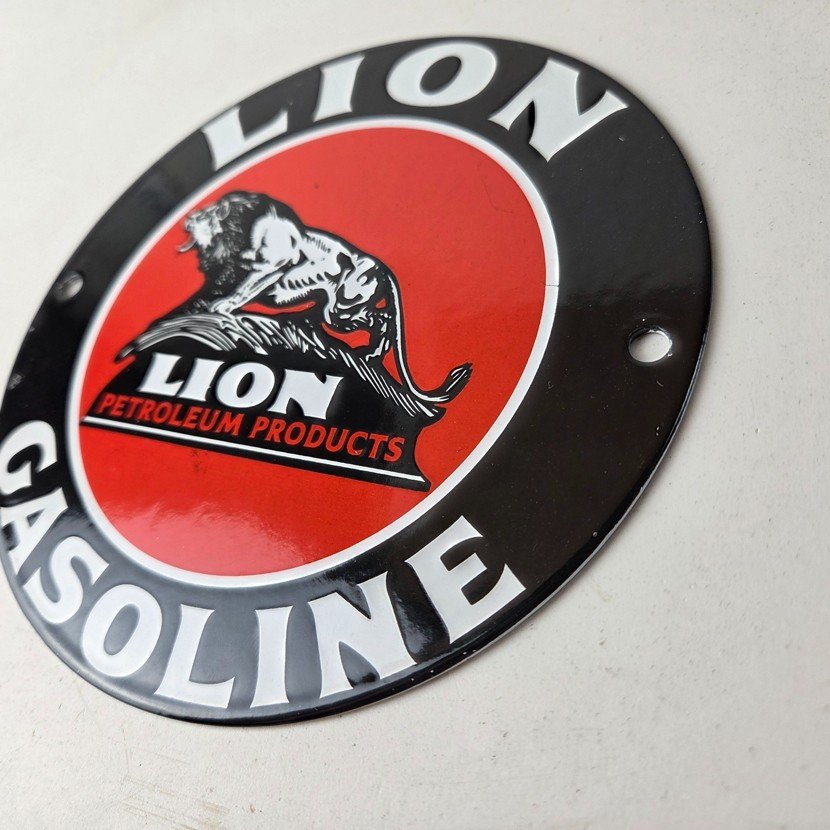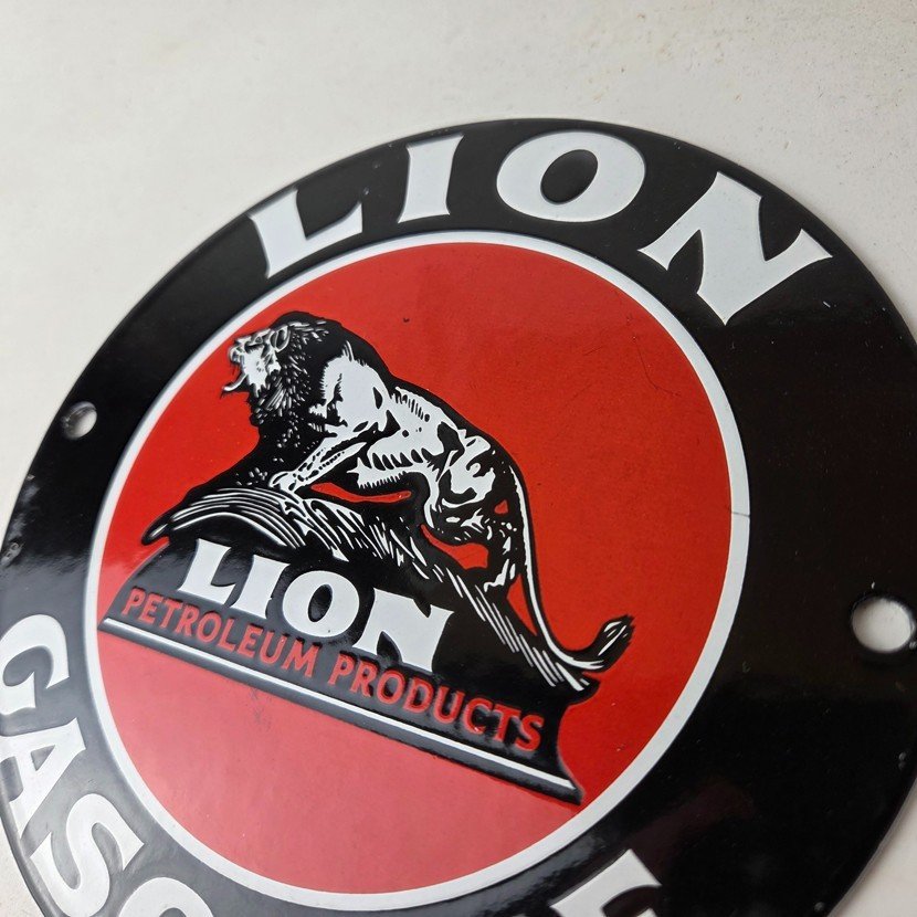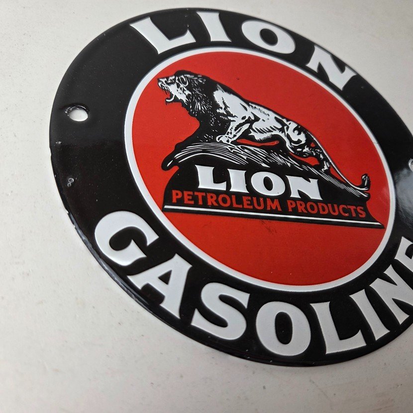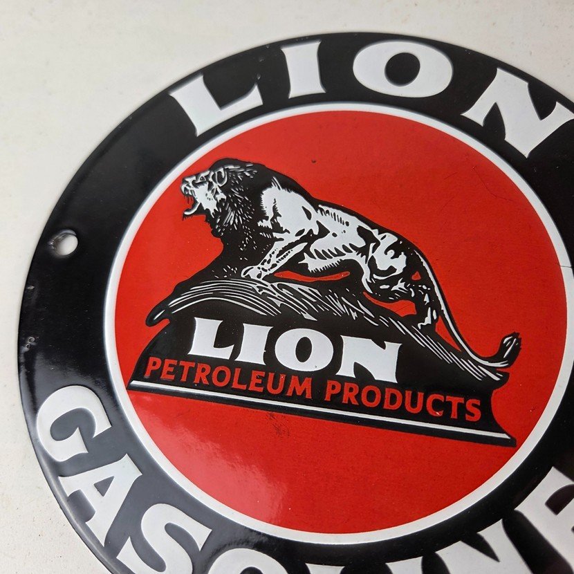 This vintage Lion Gasoline porcelain sign features the iconic logo of Lion Gasoline. This sign has excellent large lettering and porcelain. The sign measures 5 7/8 inches across.