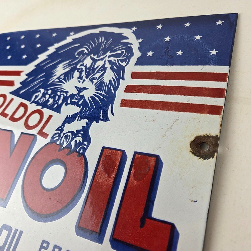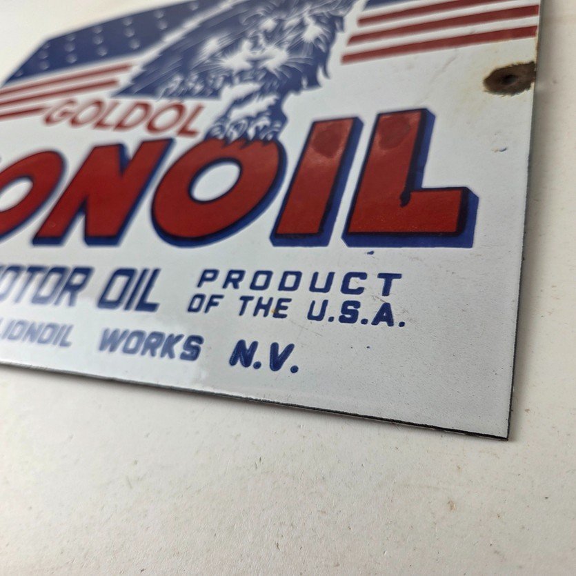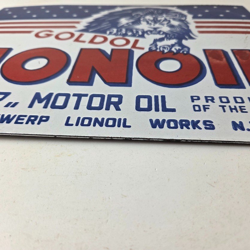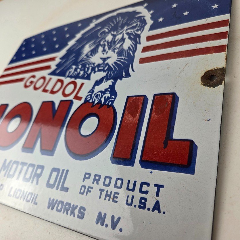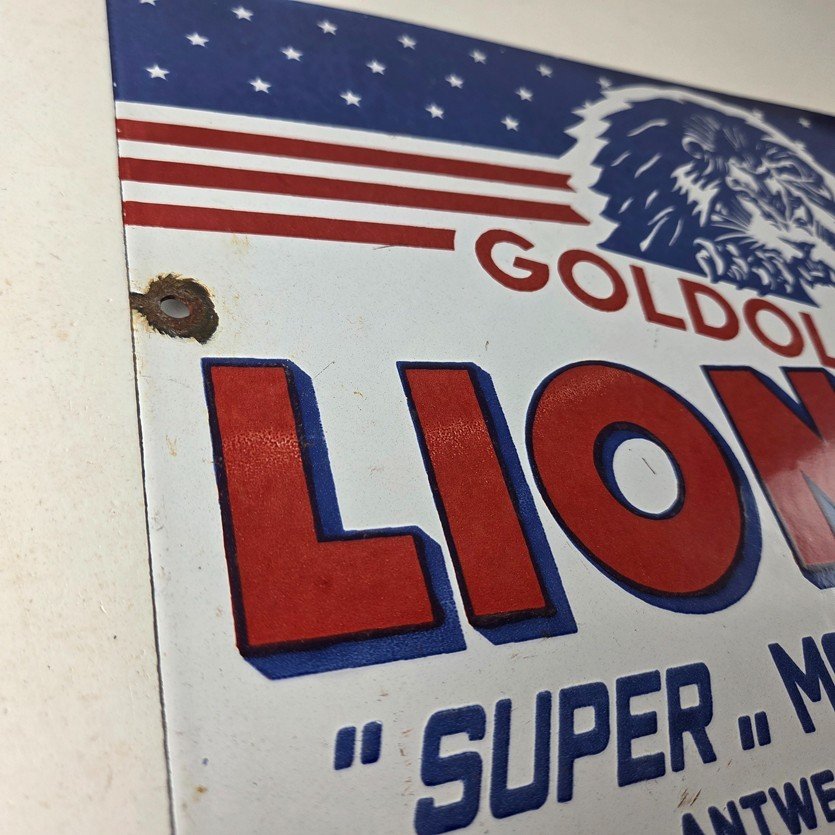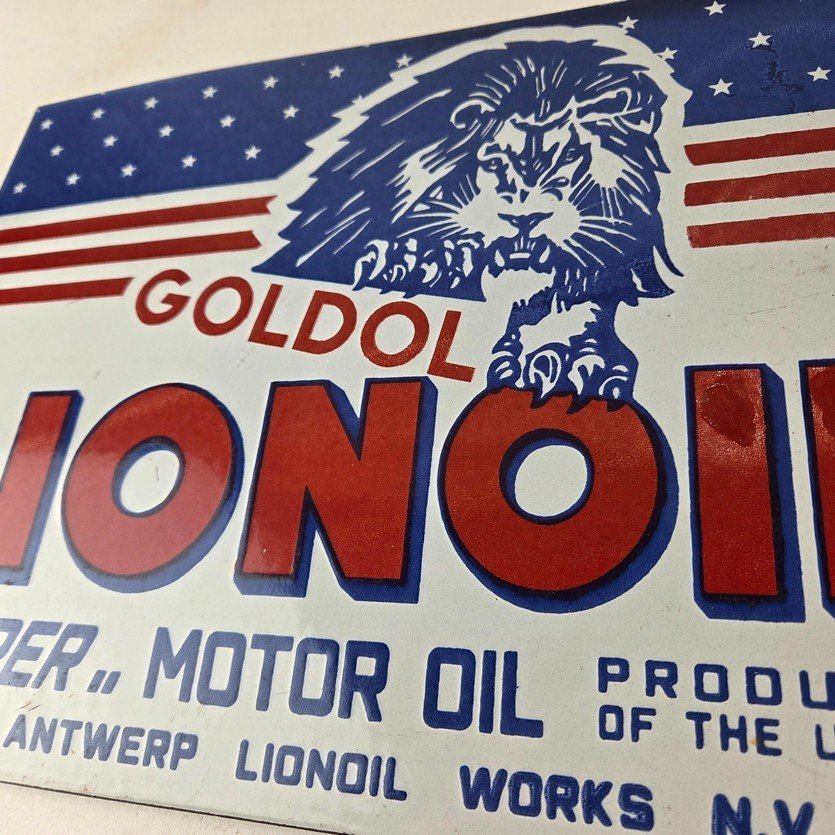 This vintage Lionoil Super Motor Oil porcelain sign features the iconic Goldol lion at the top. This sign has excellent large “LIONOIL” lettering and porcelain. The sign measures 12″ by 9″.