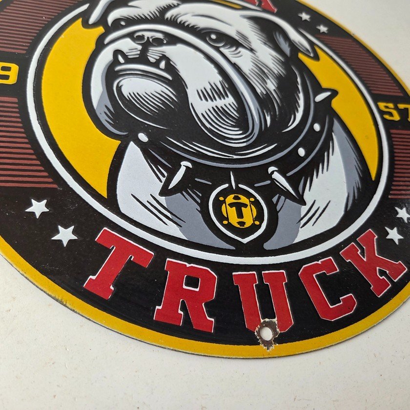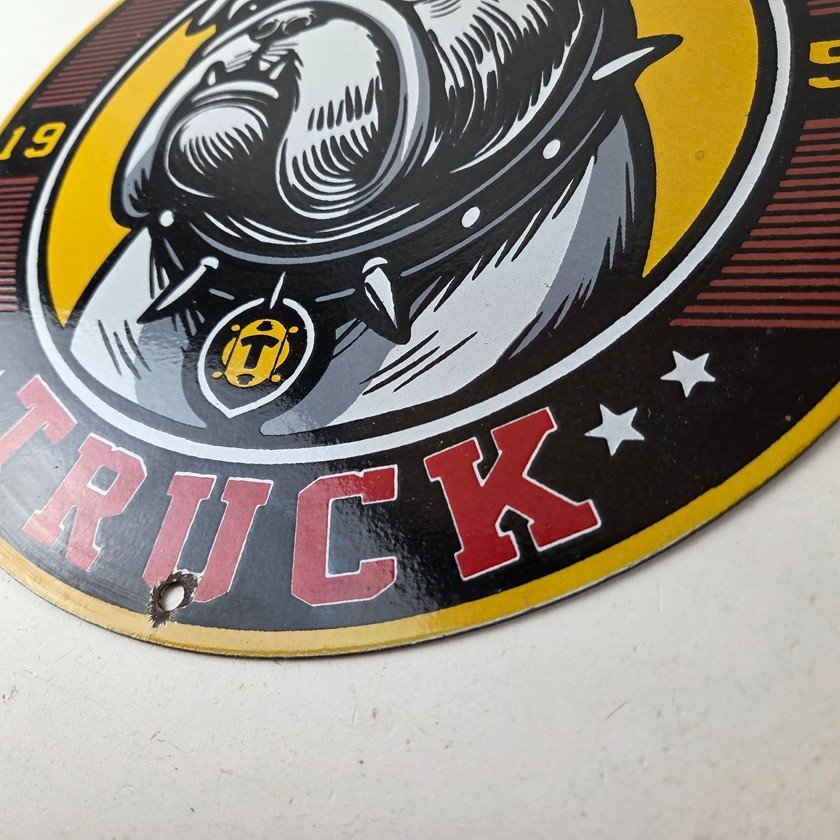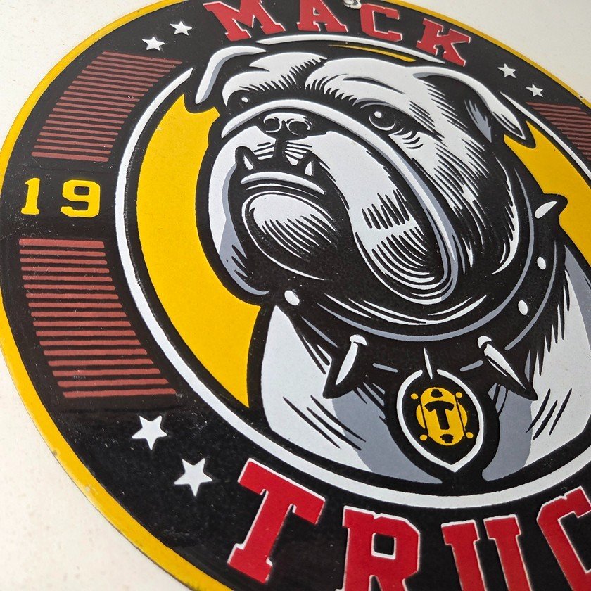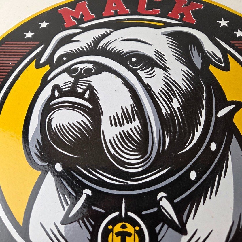 This vintage Mack Trucks porcelain sign features the iconic Mack Trucks bulldog. Measuring 12 inches, it is made of porcelain and would make a great addition to any display of gas and oil memorabilia. The sign is perfect for advertising your love of vintage trucks and/or bulldogs or adding a touch of retro charm to your home or garage. This sign is a must-have for fans of Mack Trucks and is sure to be a conversation starter.