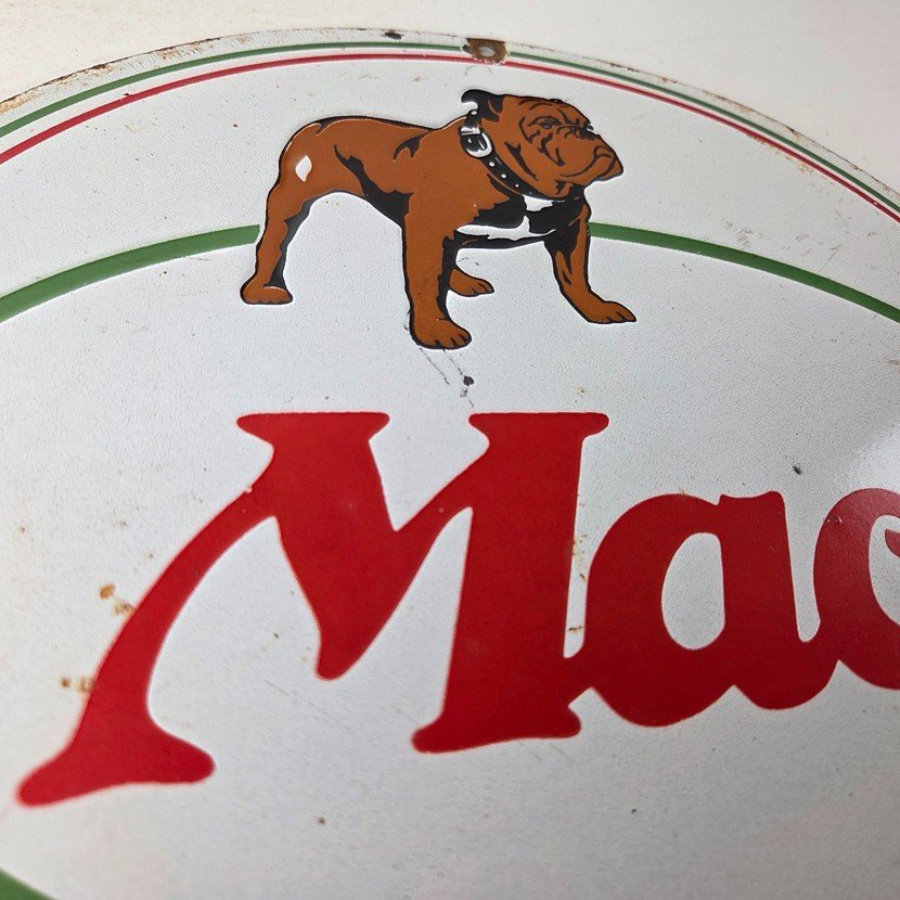 This is a vintage Mack Trucks porcelain sign (also known as a Mack porcelain mechanic garage sign), measuring 12 inches round. It features the iconic bulldog mascot: bulldog standing proudly, with Mack in large Red Lettering.