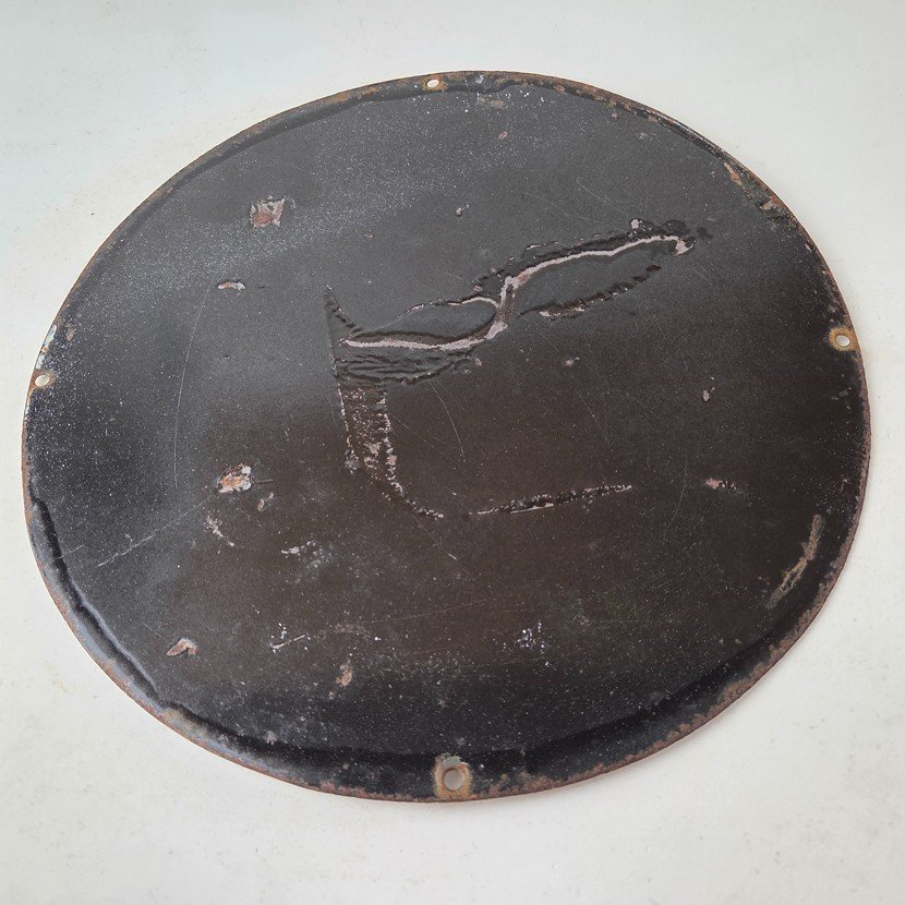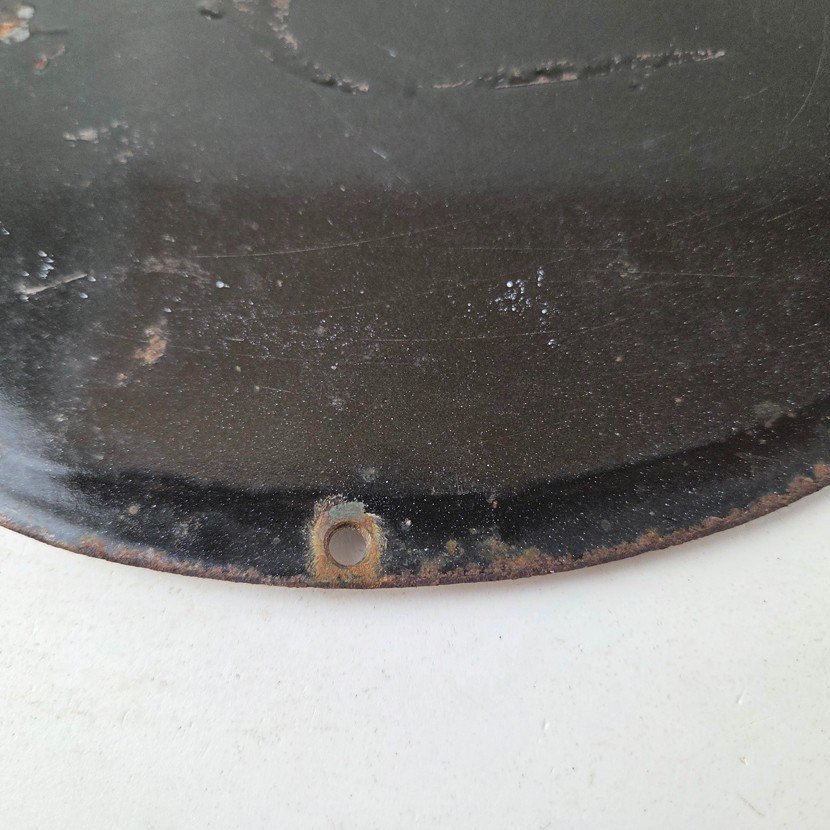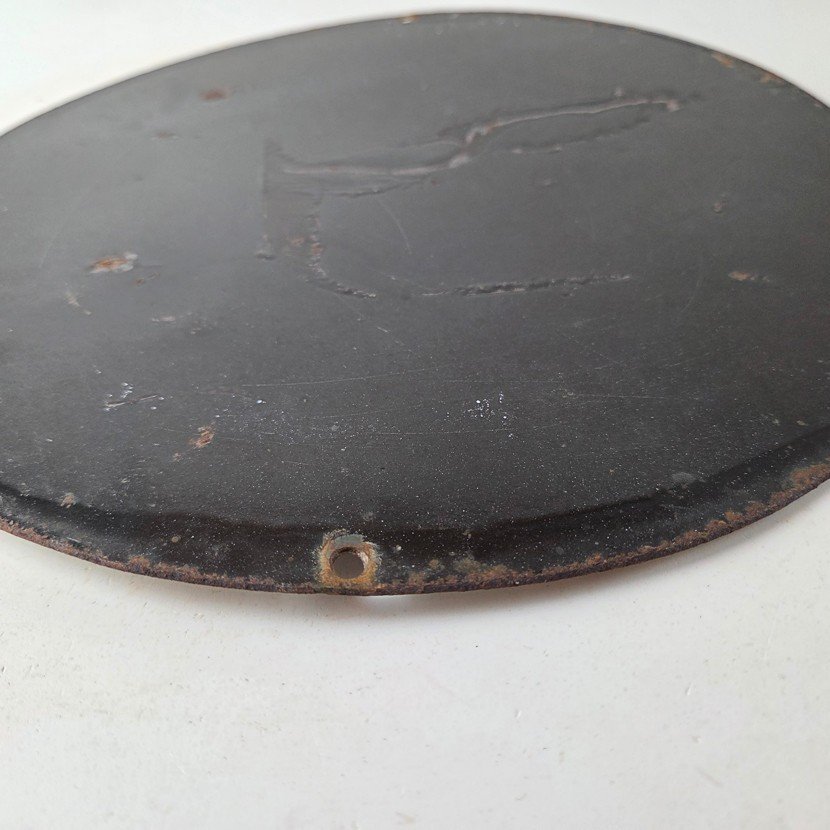 Made of porcelain enamel on steel with patina and wear: rust spotting around the mounting holes, minor edge chips, light surface scratches, and minimal discoloration. This is a porcelain enamel advertising sign in excellent condition, exactly as shown in the photos.