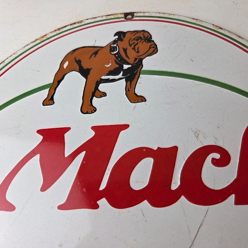 This is a vintage Mack Trucks porcelain sign (also known as a Mack porcelain mechanic garage sign), measuring 12 inches round. It features the iconic bulldog mascot: bulldog standing proudly, with Mack in large Red Lettering.
