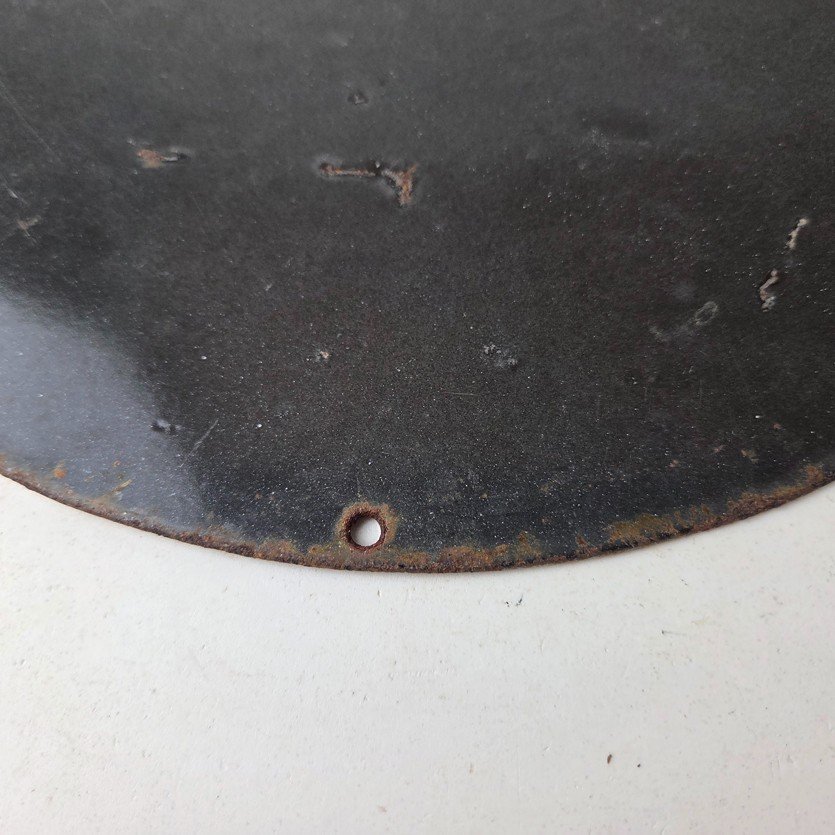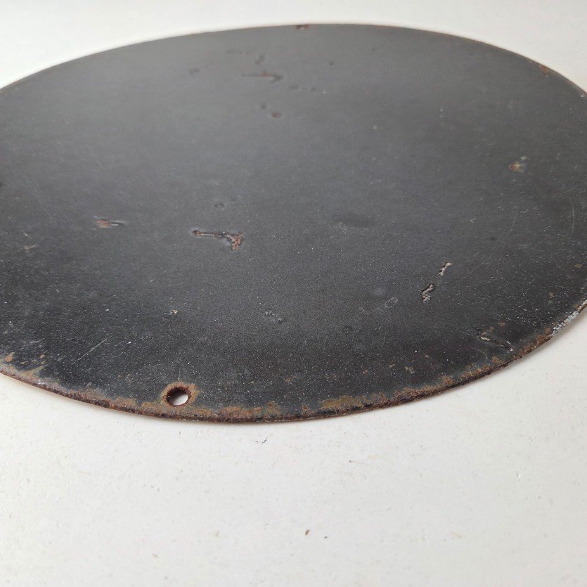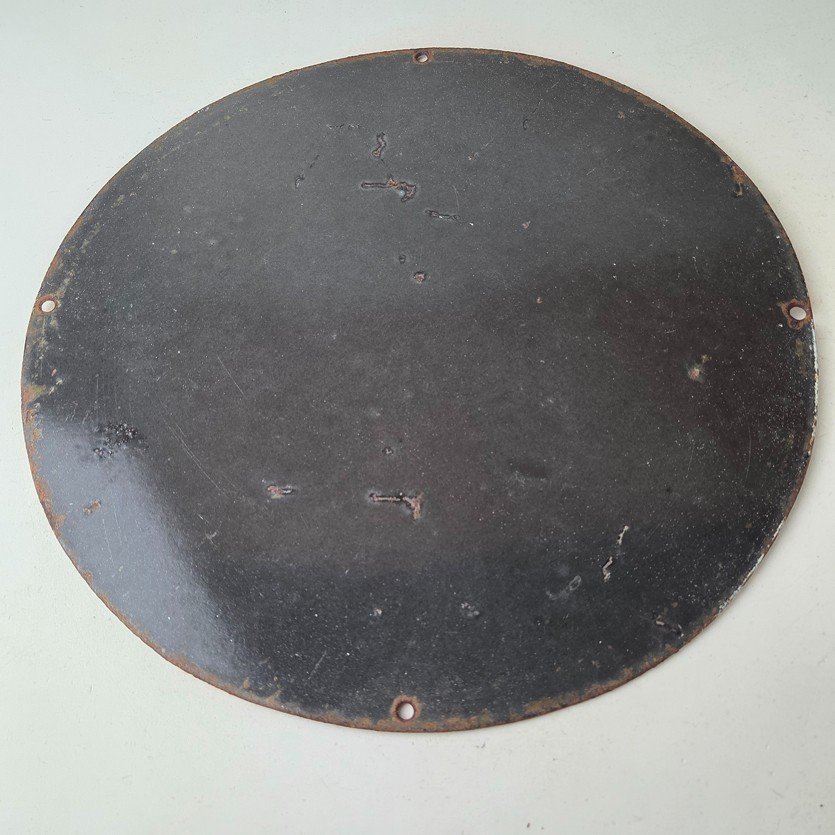 Made of porcelain enamel on steel with patina and wear: rust spotting around the mounting holes, minor edge chips, light surface scratches, and minimal discoloration. This is a porcelain enamel advertising sign in excellent condition, exactly as shown in the photos.