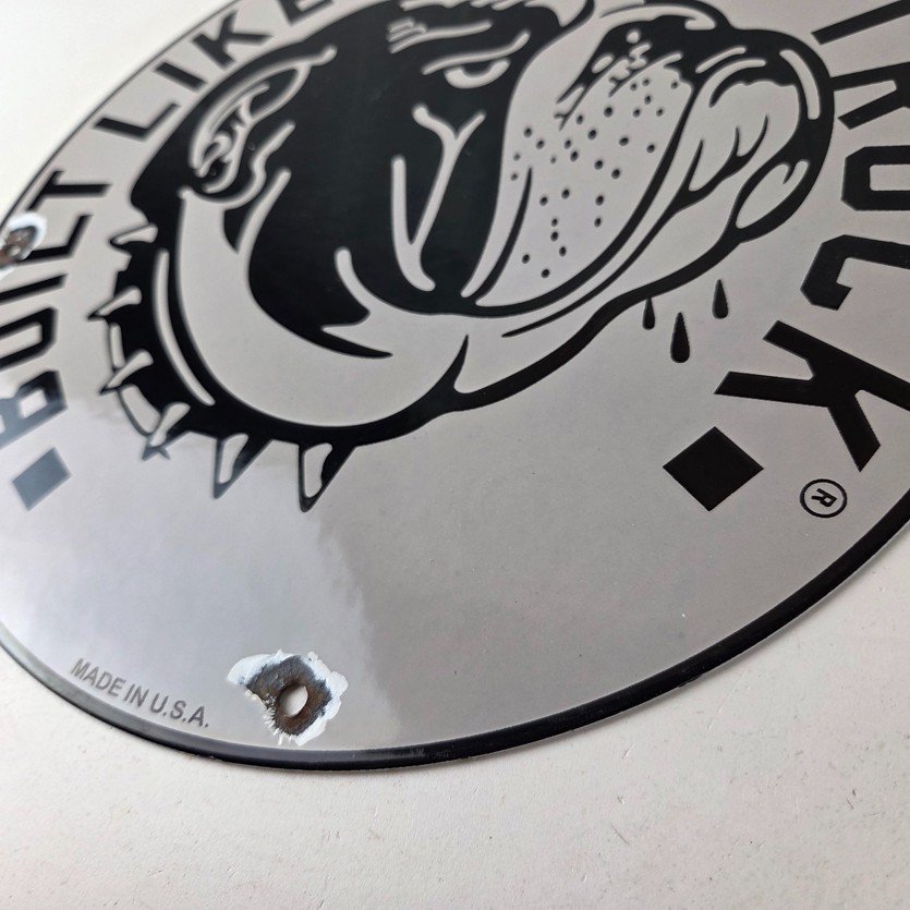 This vintage Mack Trucks porcelain sign features the iconic Mack Trucks logo and slogan, “Built Like A Truck”. Measuring 11 3/4 inches, it is made of porcelain and would make a great addition to any display of gas and oil memorabilia. The sign is perfect for advertising your love of vintage trucks and/or bulldogs or adding a touch of retro charm to your home or garage. This sign is a must-have for fans of Mack Trucks and is sure to be a conversation starter.