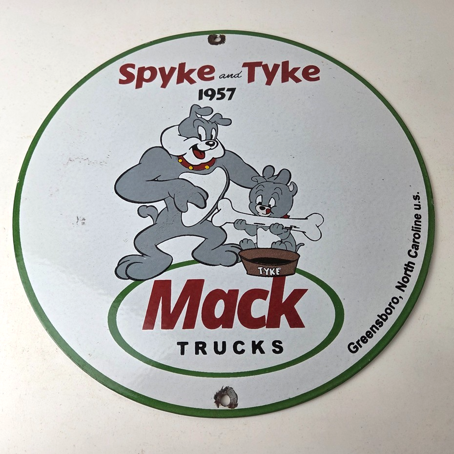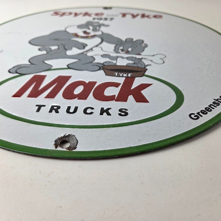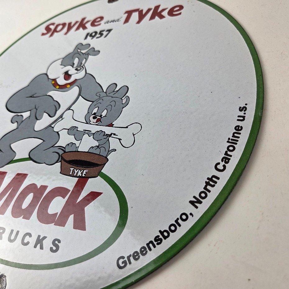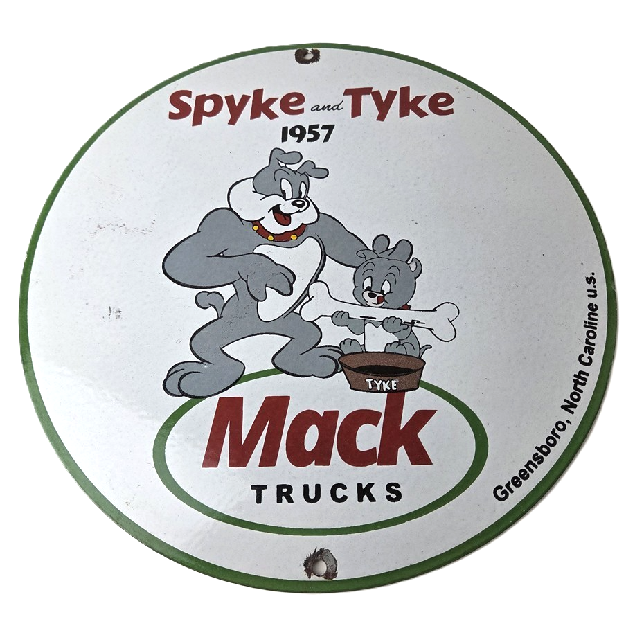 This vintage Mack Trucks porcelain sign features the iconic Mack Trucks with the iconic cartoon characters Spyke and Tyke. Measuring 12 inches, it is made of porcelain and would make a great addition to any display of gas and oil memorabilia. The sign is perfect for advertising your love of vintage trucks and/or bulldogs or adding a touch of retro charm to your home or garage. This sign is a must-have for fans of Mack Trucks and is sure to be a conversation starter.