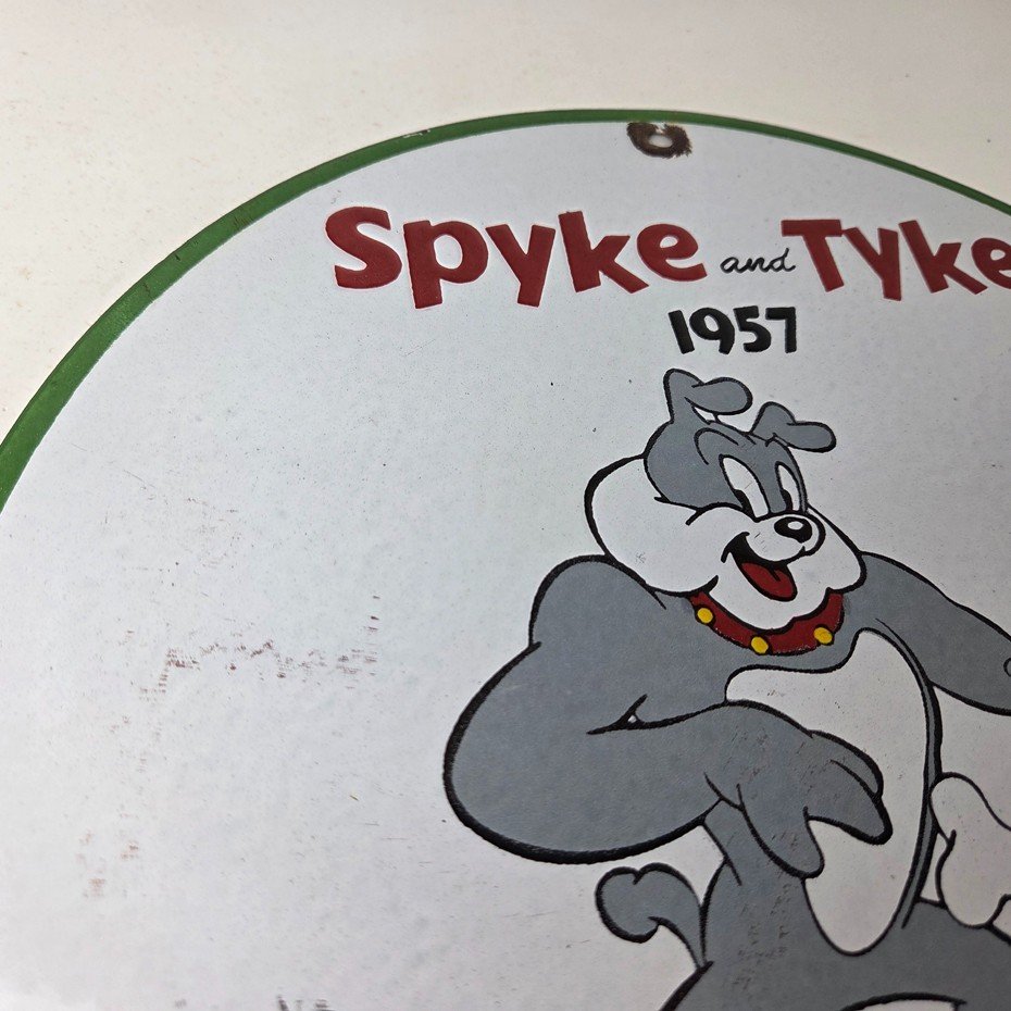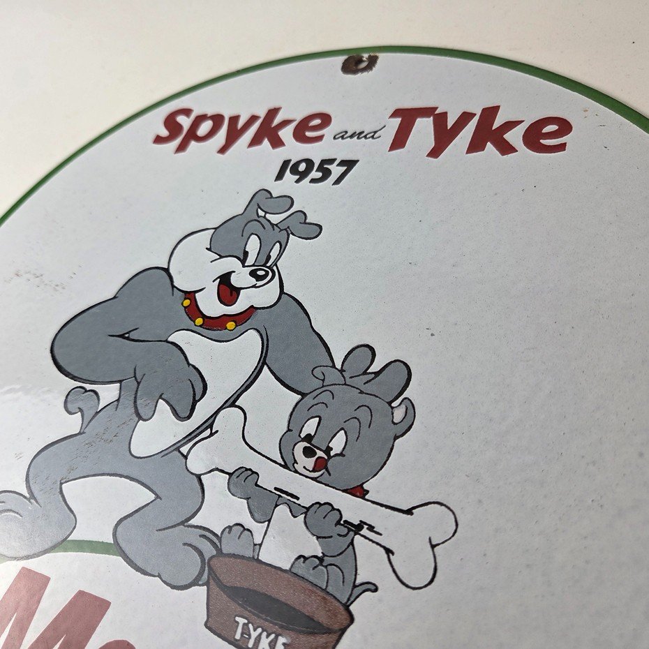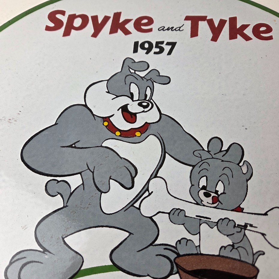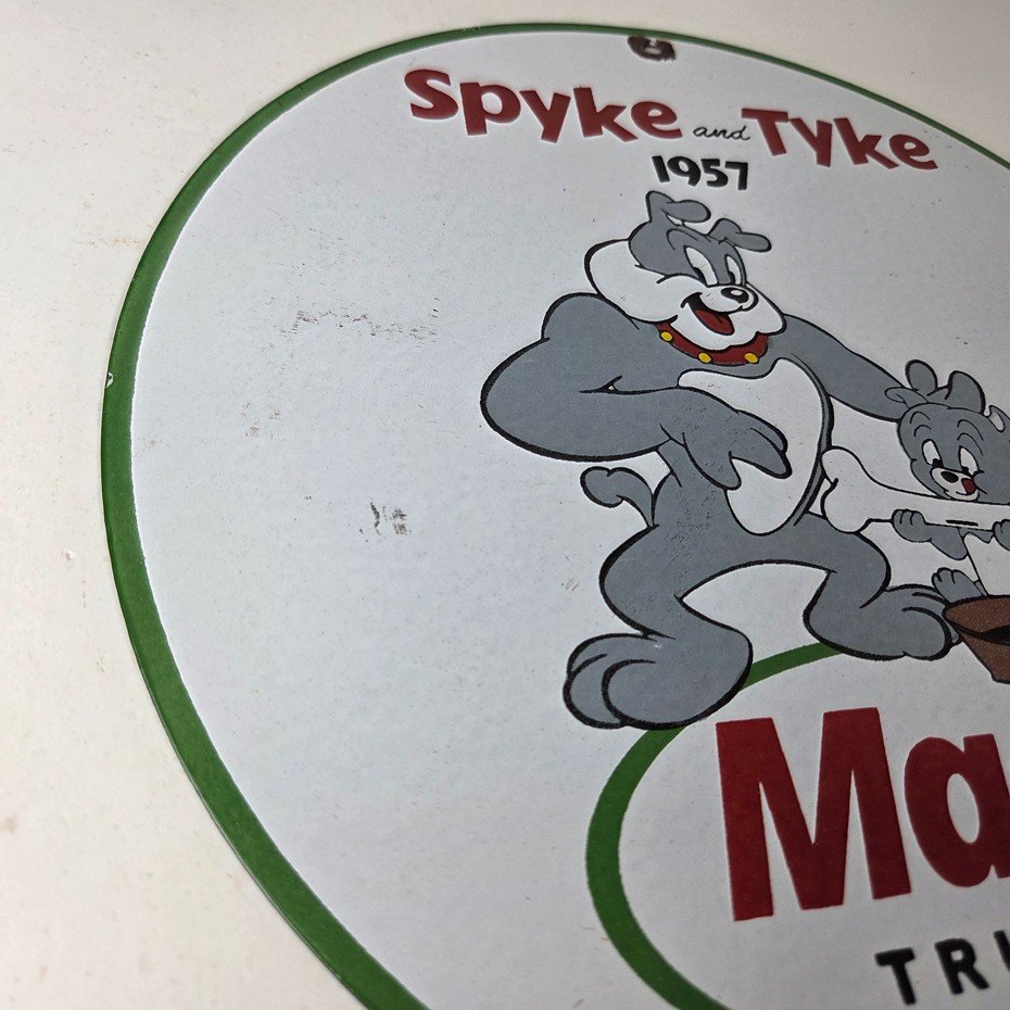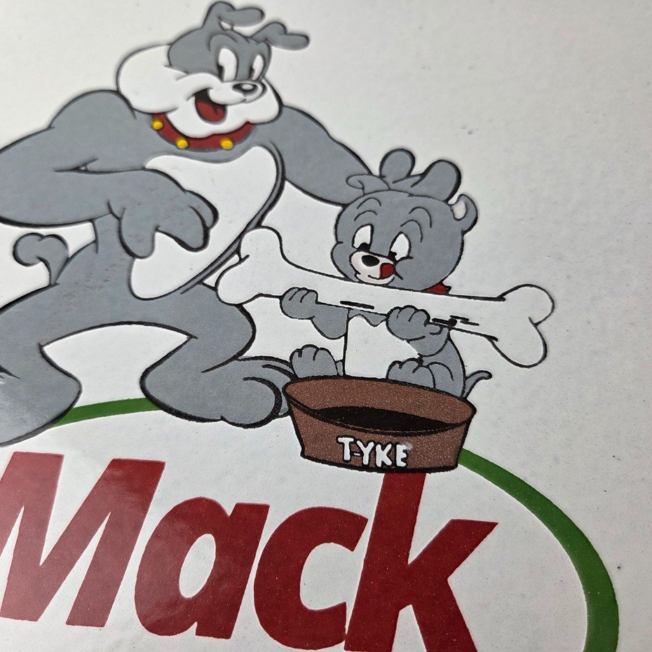 This vintage Mack Trucks porcelain sign features the iconic Mack Trucks with the iconic cartoon characters Spyke and Tyke. Measuring 12 inches, it is made of porcelain and would make a great addition to any display of gas and oil memorabilia. The sign is perfect for advertising your love of vintage trucks and/or bulldogs or adding a touch of retro charm to your home or garage. This sign is a must-have for fans of Mack Trucks and is sure to be a conversation starter.