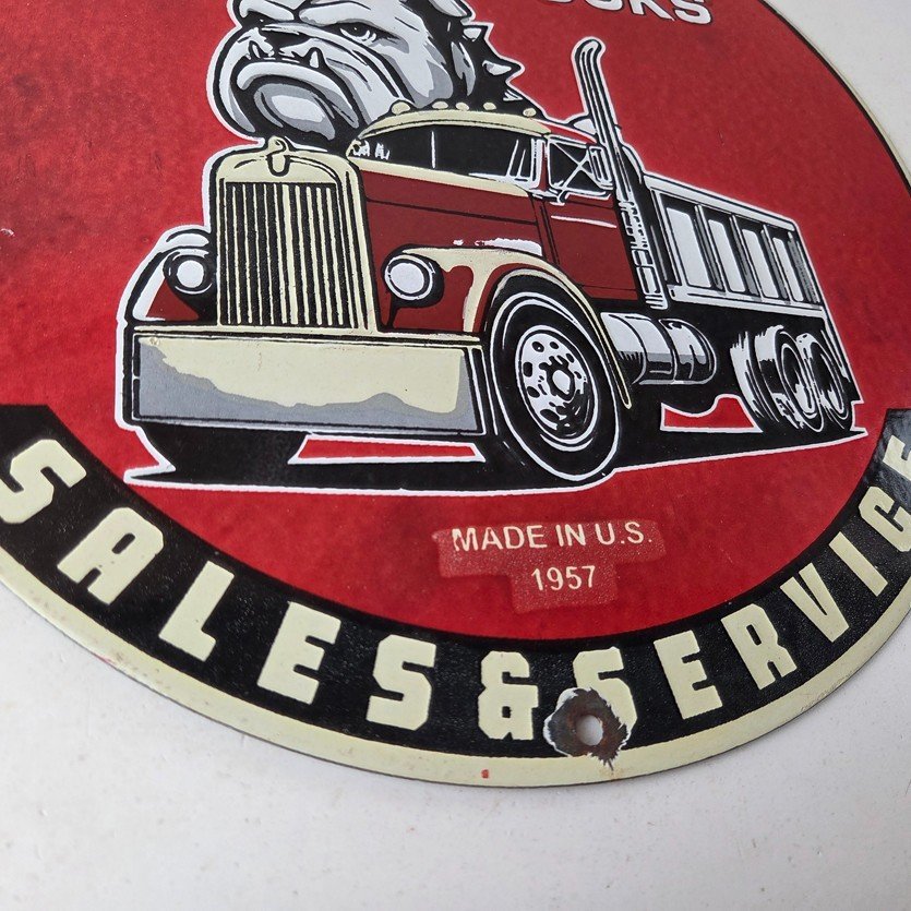 This vintage Mack Trucks porcelain sign features the iconic Mack Trucks bulldog. Measuring 12 inches, it is made of porcelain and would make a great addition to any display of gas and oil memorabilia. The sign is perfect for advertising your love of vintage trucks and/or bulldogs or adding a touch of retro charm to your home or garage. This sign is a must-have for fans of Mack Trucks and is sure to be a conversation starter.