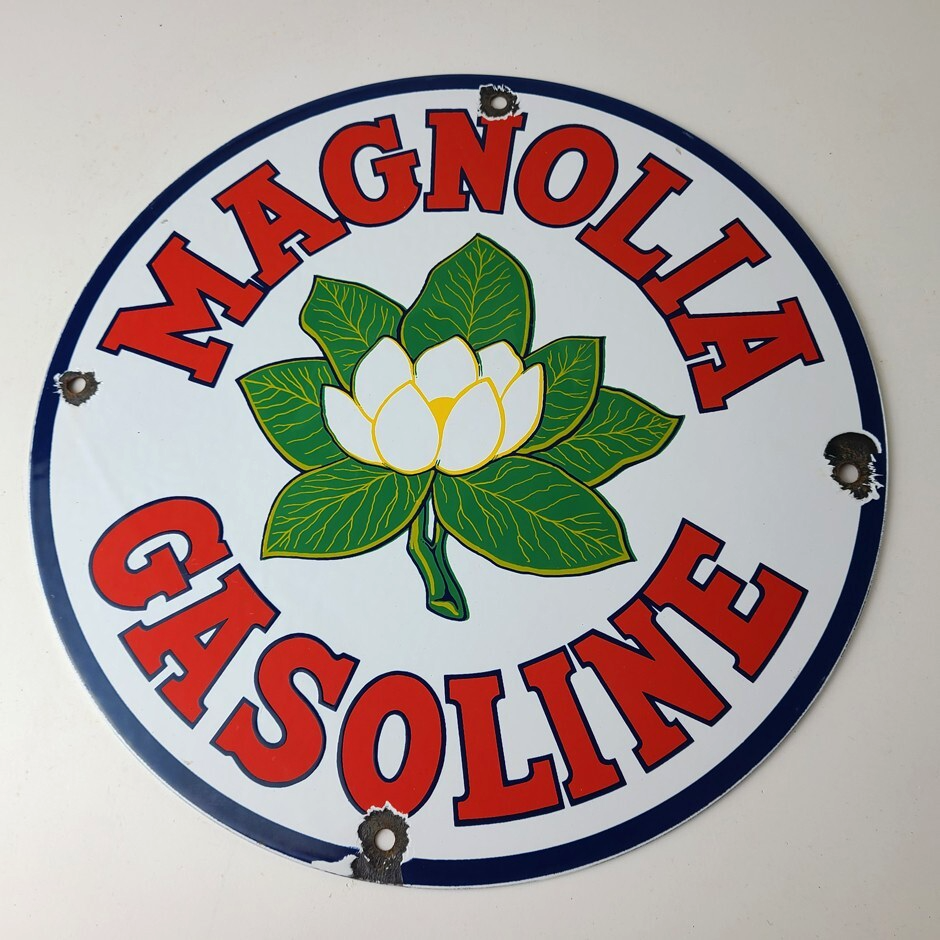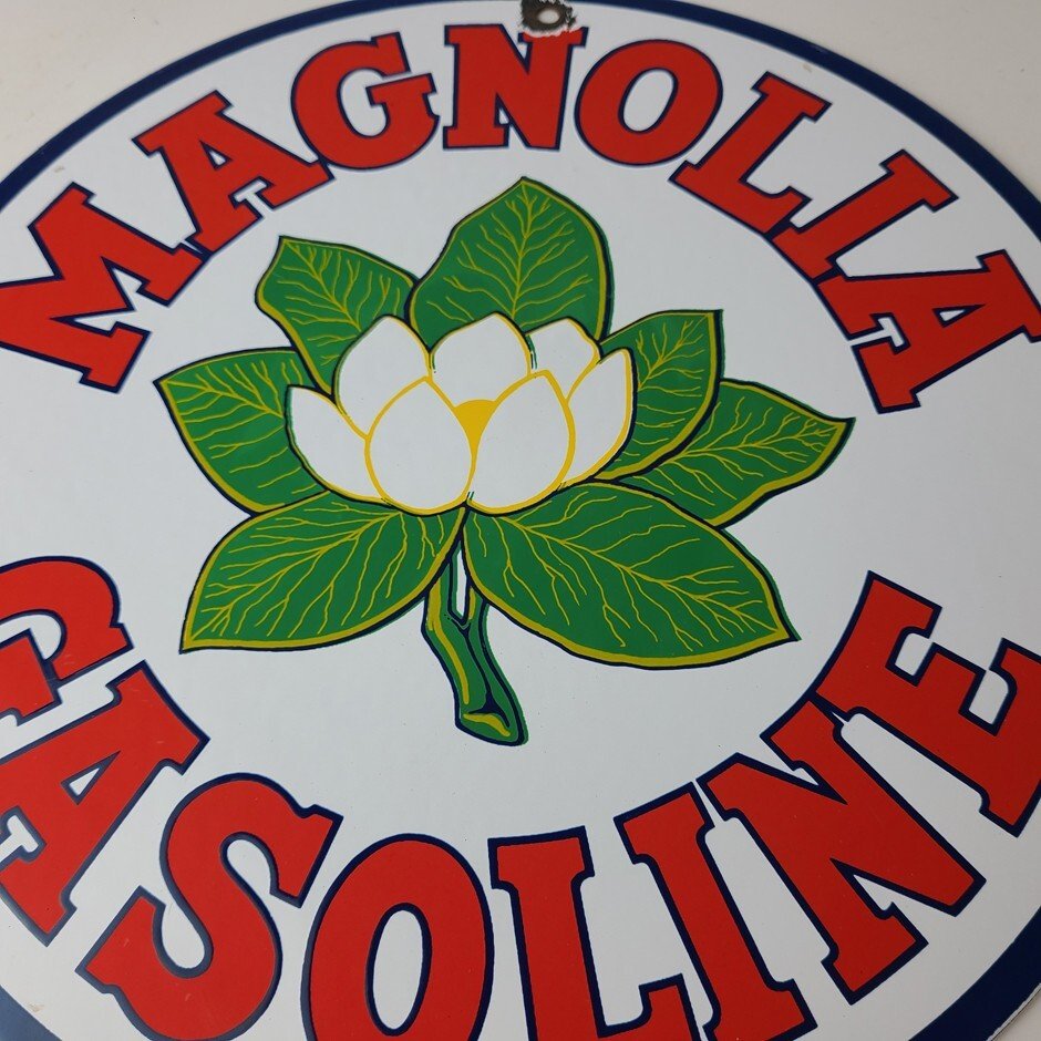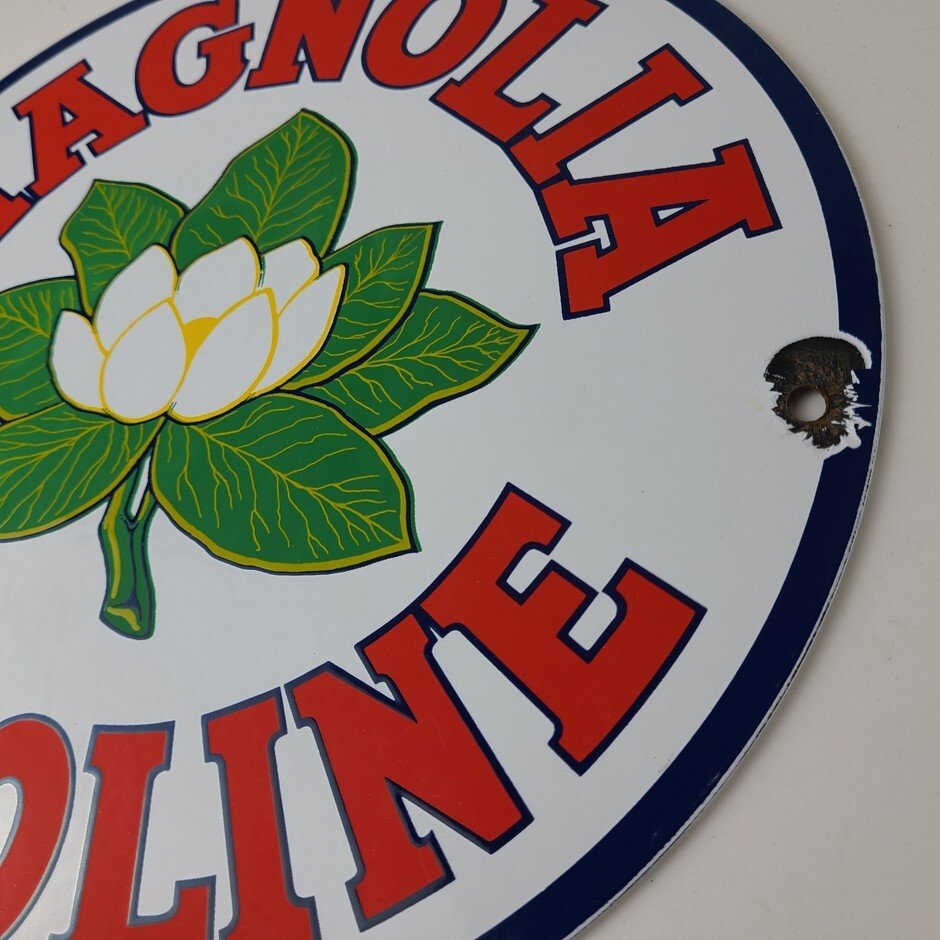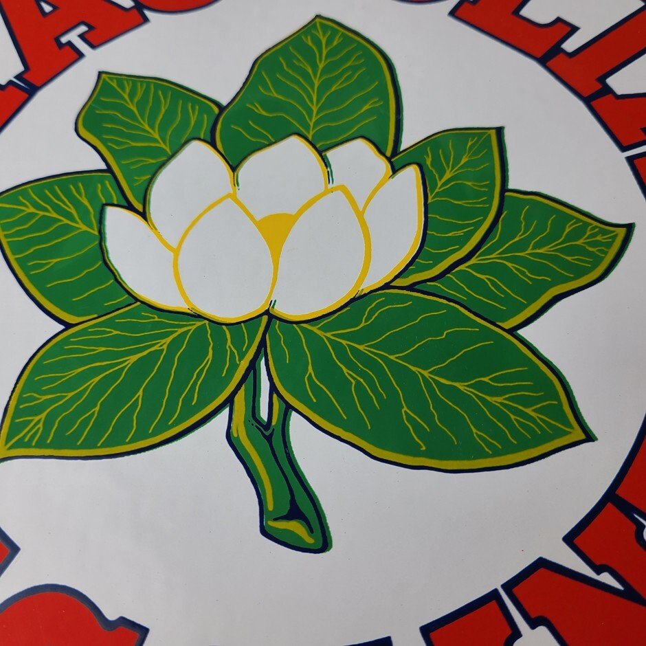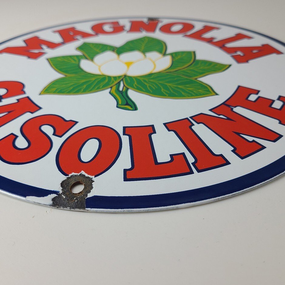 This vintage Magnolia Gasoline porcelain sign features a striking design with bold colors and is made of porcelain material. It is perfect for display in a garage, shop, or man cave. The sign measures 11 3/4″ and is in excellent condition, with no major chips or cracks. It was made in the United States and has excellent porcelain and colors.