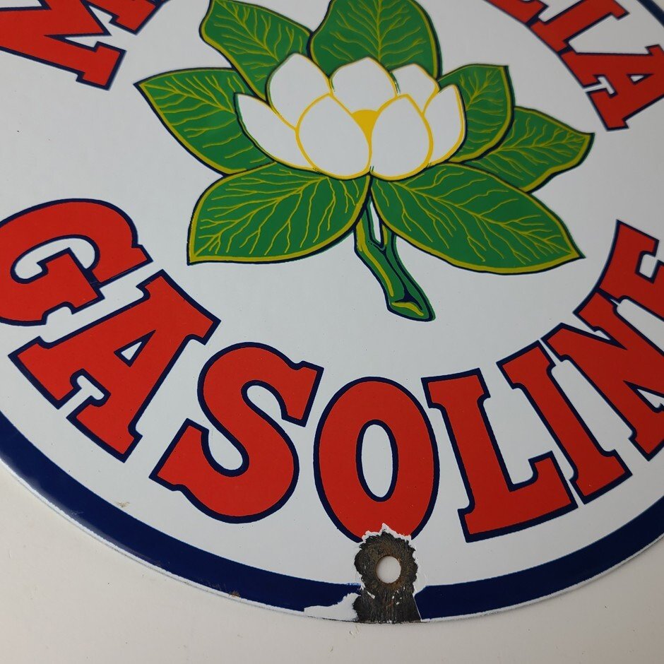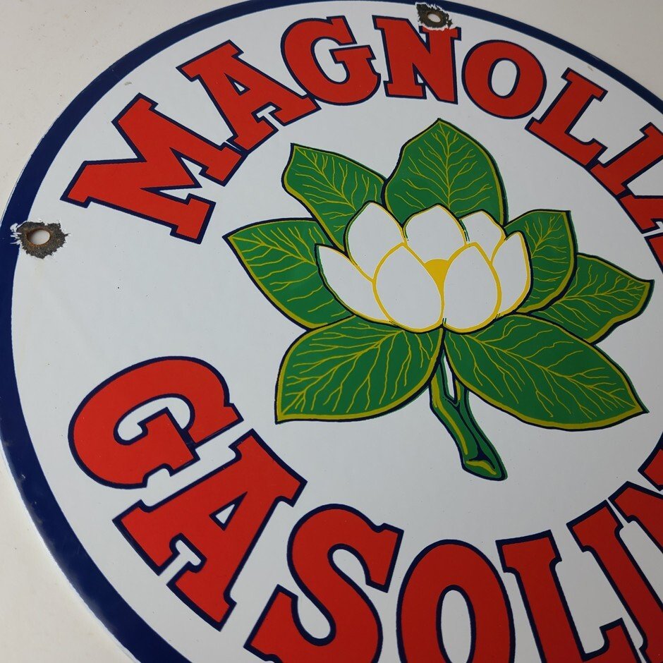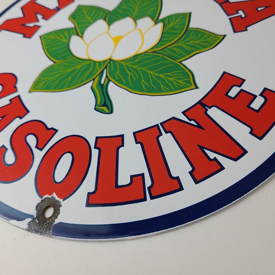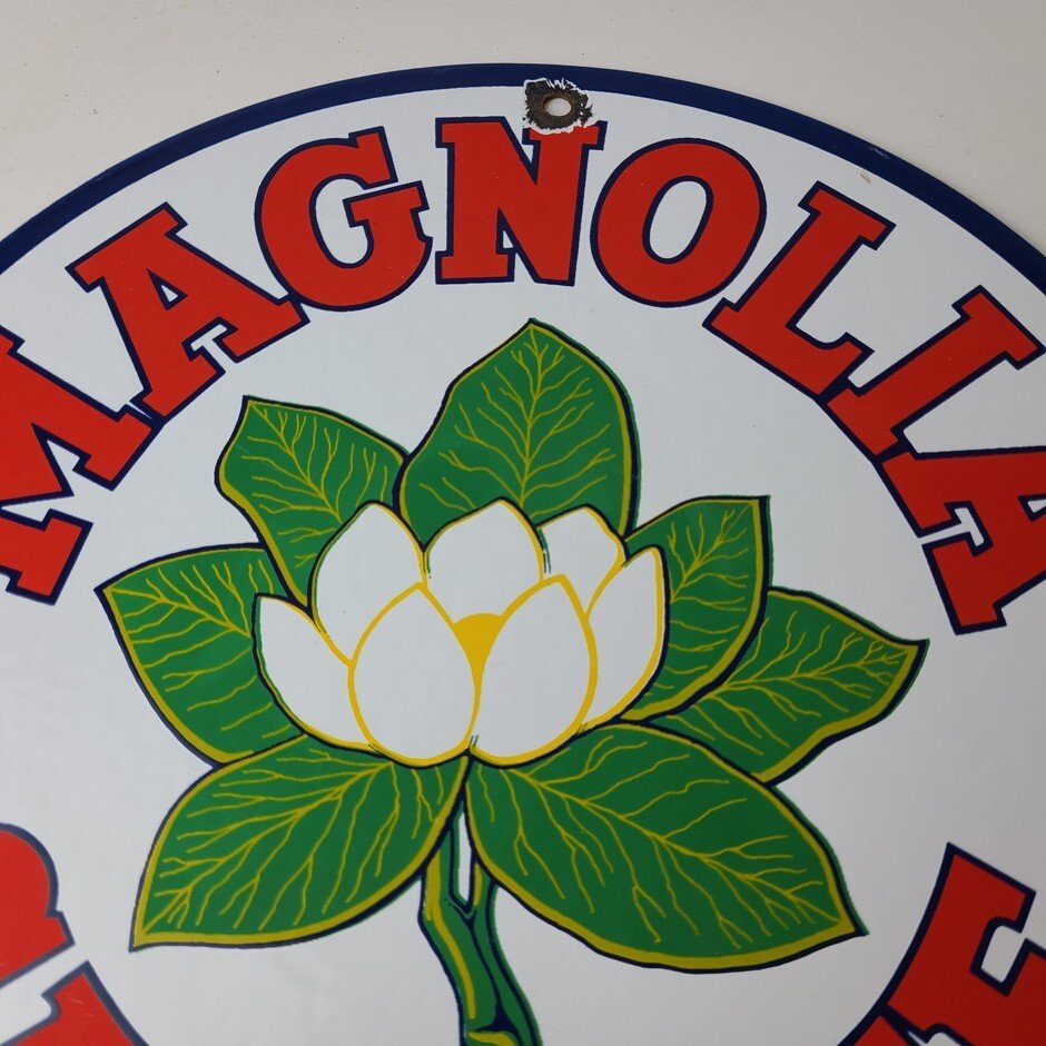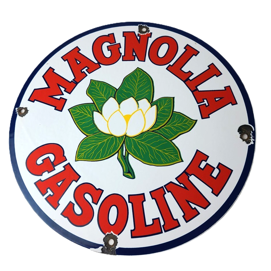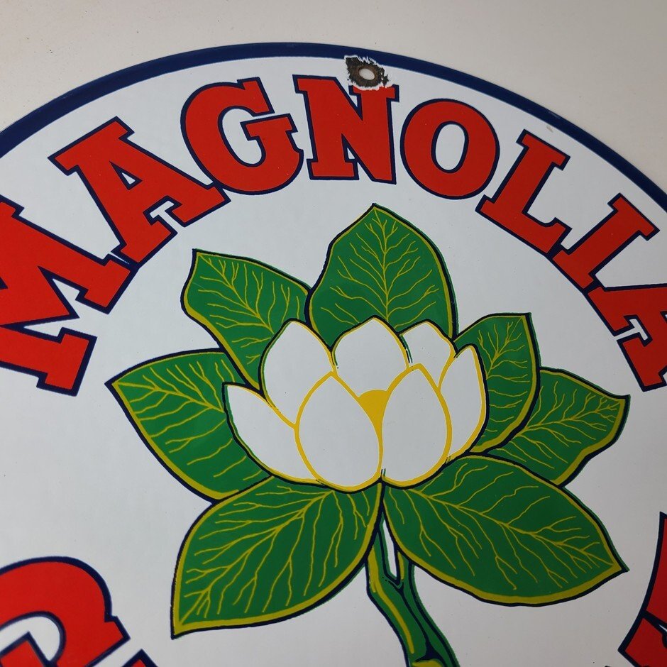 This vintage Magnolia Gasoline porcelain sign features a striking design with bold colors and is made of porcelain material. It is perfect for display in a garage, shop, or man cave. The sign measures 11 3/4″ and is in excellent condition, with no major chips or cracks. It was made in the United States and has excellent porcelain and colors.