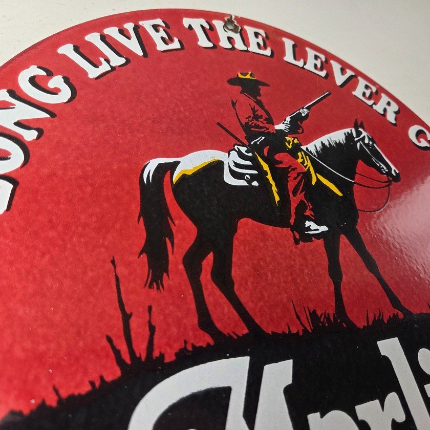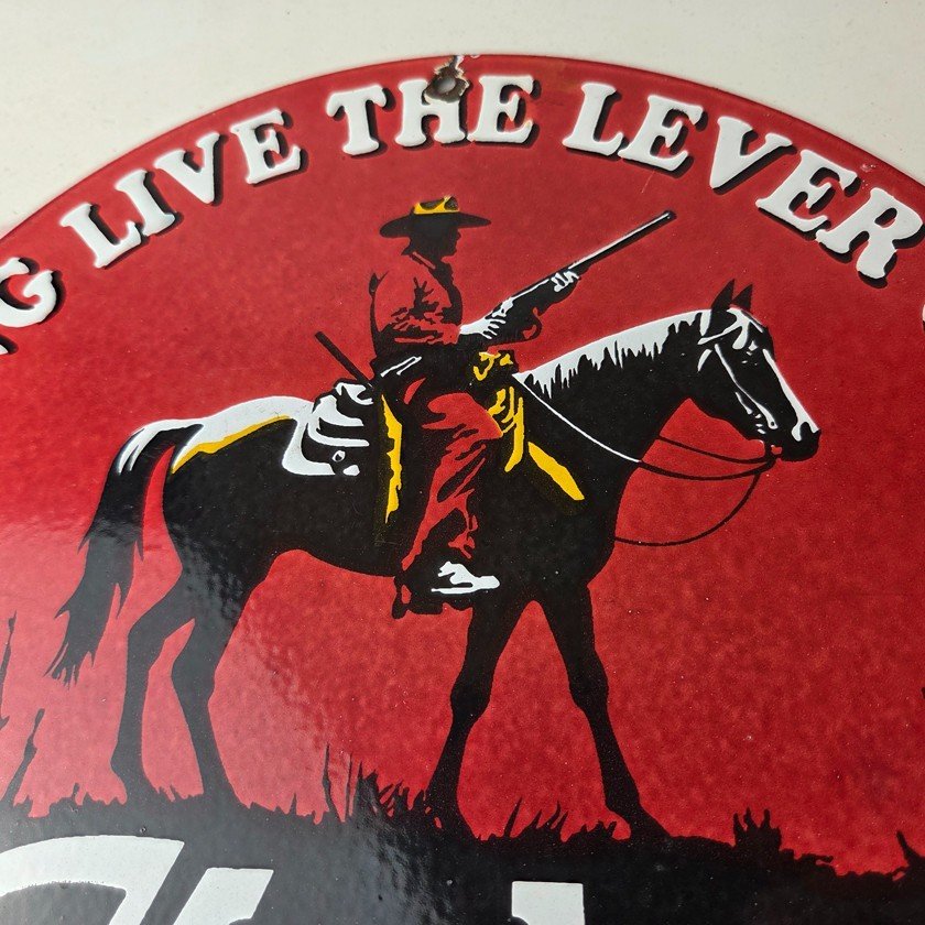 This vintage porcelain sign is a must-have for collectors and fans of Marlin Firearms – Rifles. With its vibrant red colors this sign is sure to catch the eye of anyone in the room. The sign features the iconic Marlin Firearms lettering and the cowboy graphic. Whether you’re a fan of gas and oil memorabilia or a hunting/rifle enthusiast, this sign is the perfect piece to display.