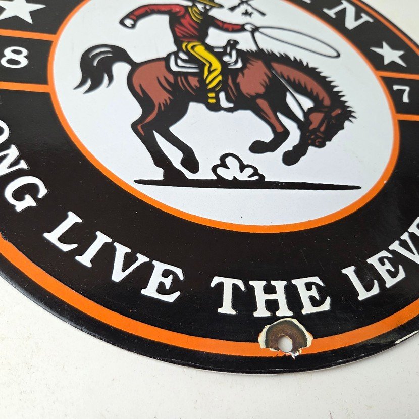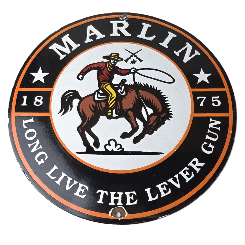 This vintage Marlin lever gun cowboy sign makes a great addition to a garage, shop display, man cave, gun room, or any Marlin memorabilia collection, vintage firearms advertising collection, Western cowboy sign collection, or lever action rifle enthusiast collection.