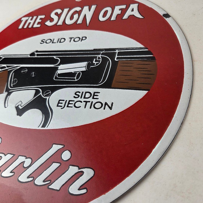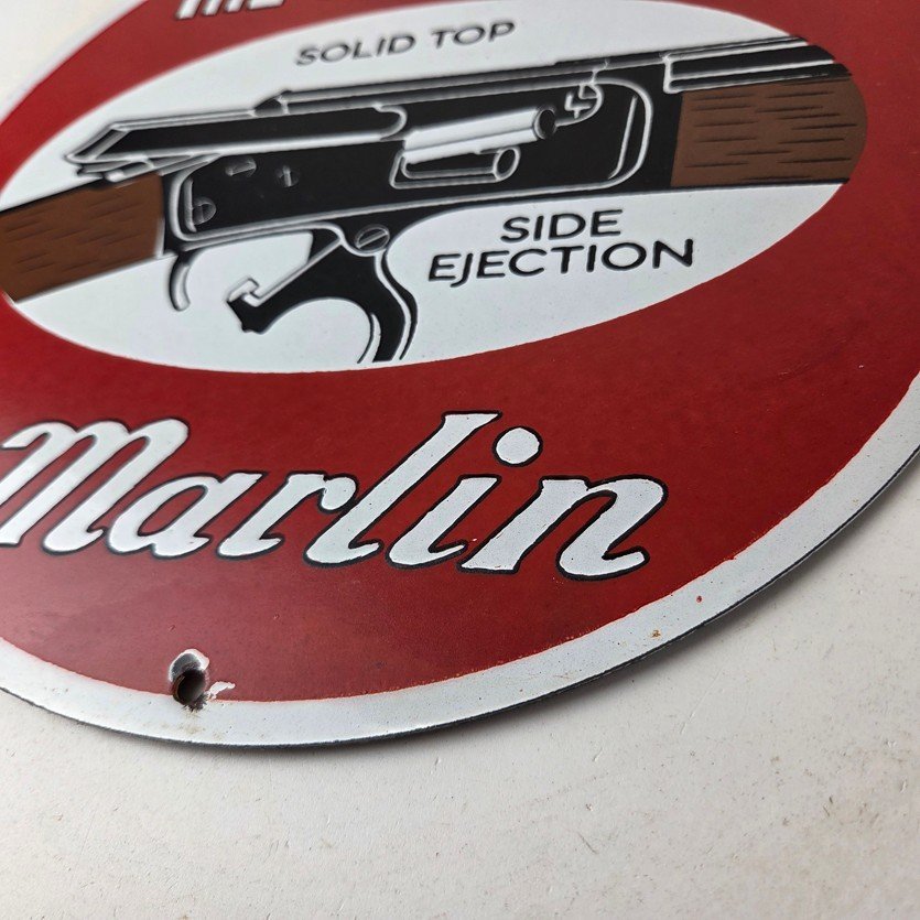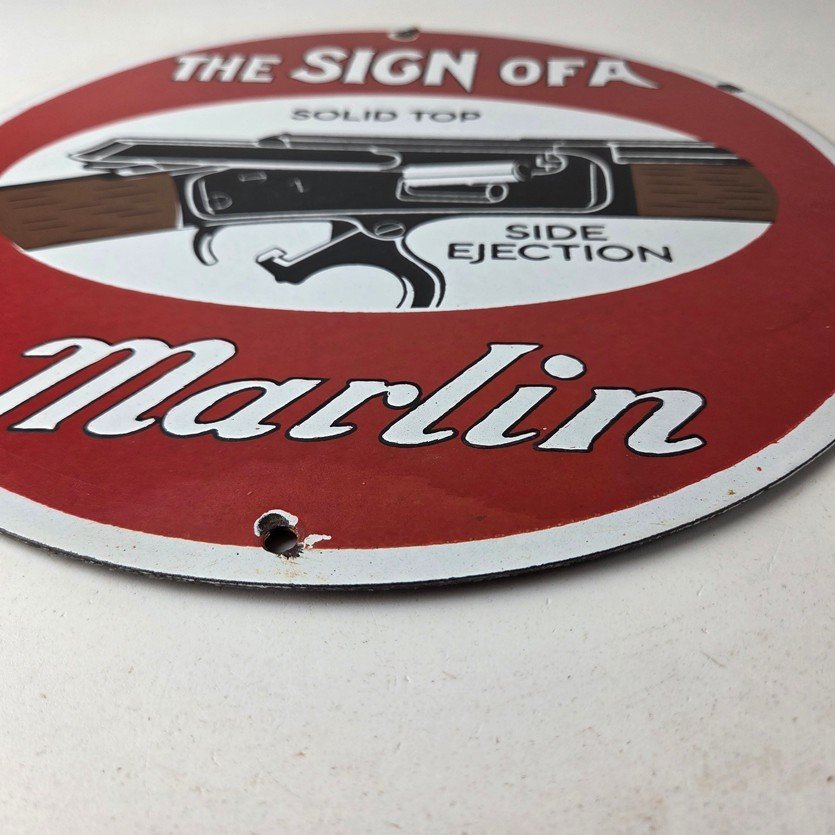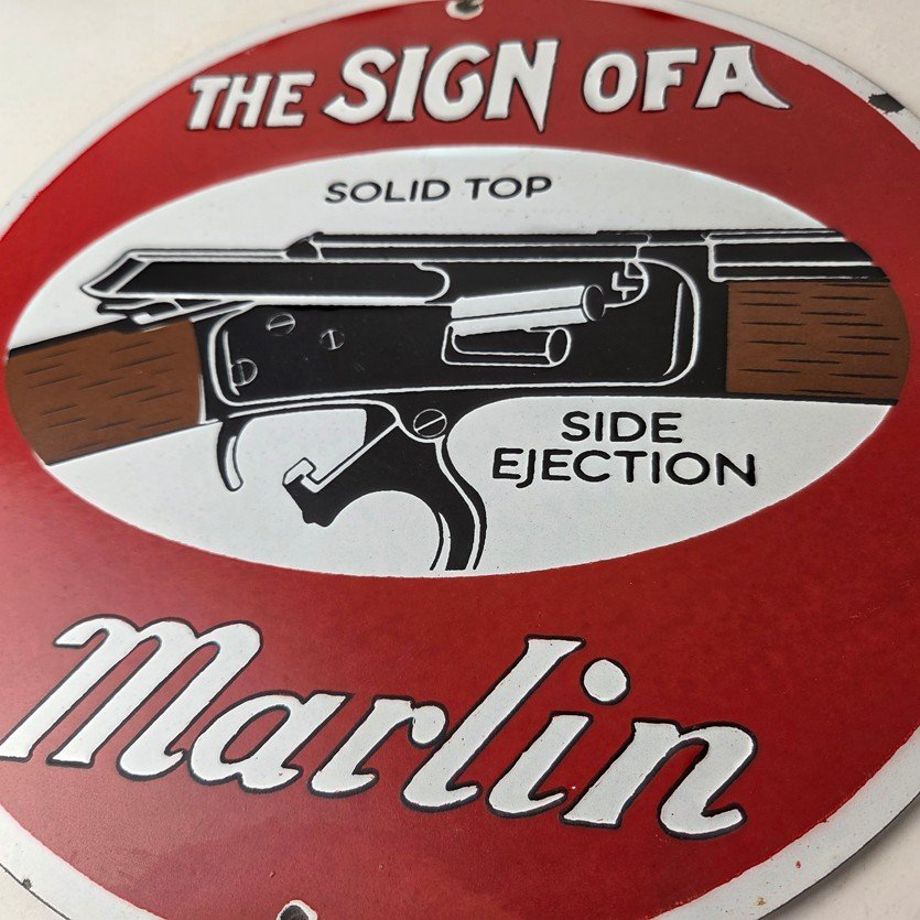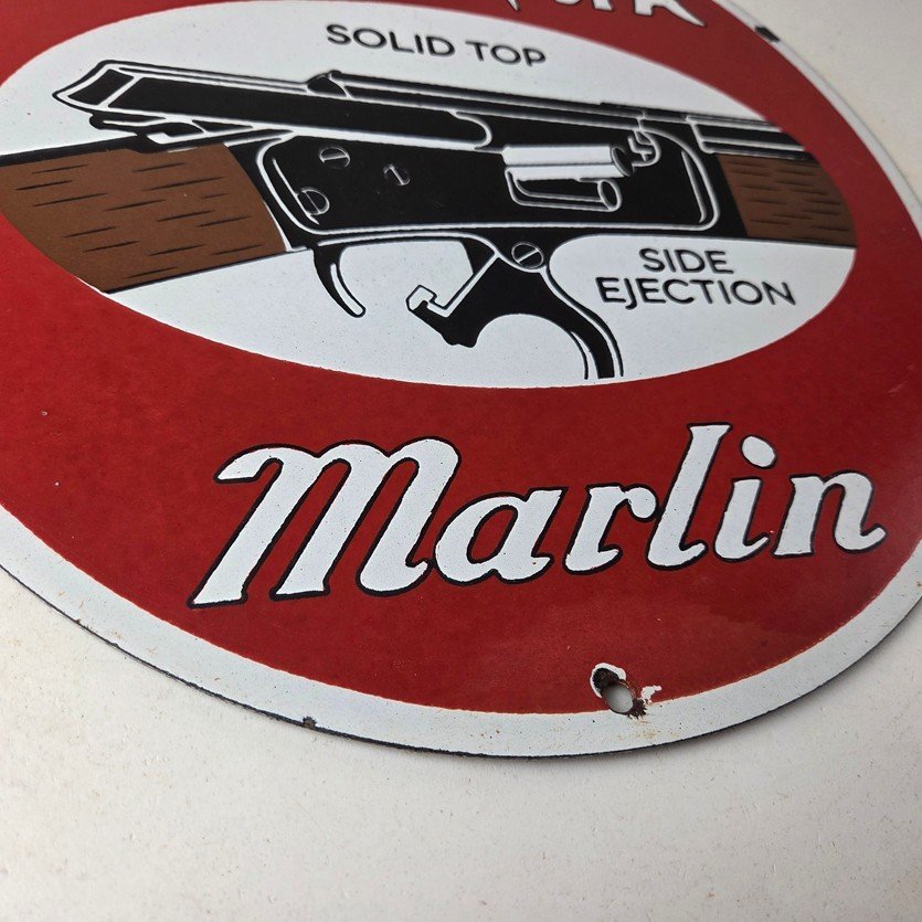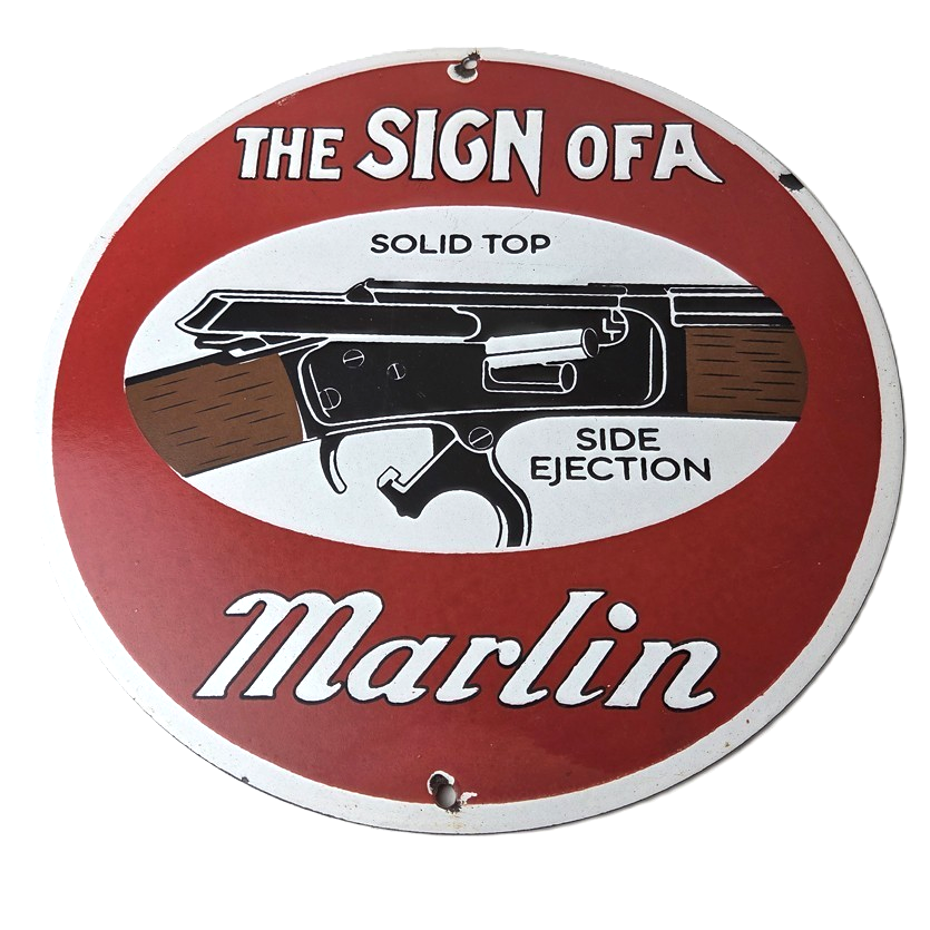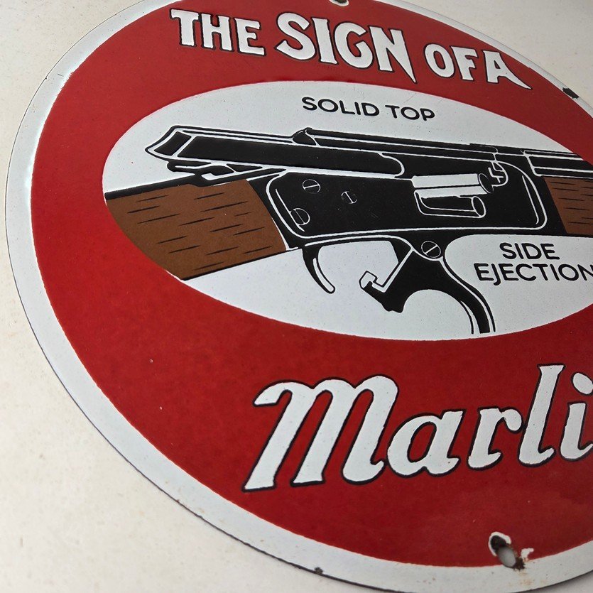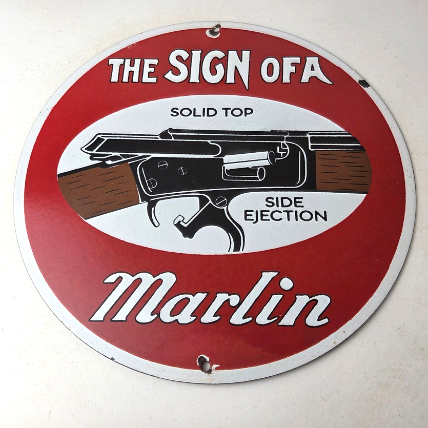 This vintage Marlin rifle solid top sign makes a great addition to a garage, shop display, man cave, gun room, or any Marlin memorabilia collection, vintage firearms advertising collection, or hunting/gun enthusiast collection.