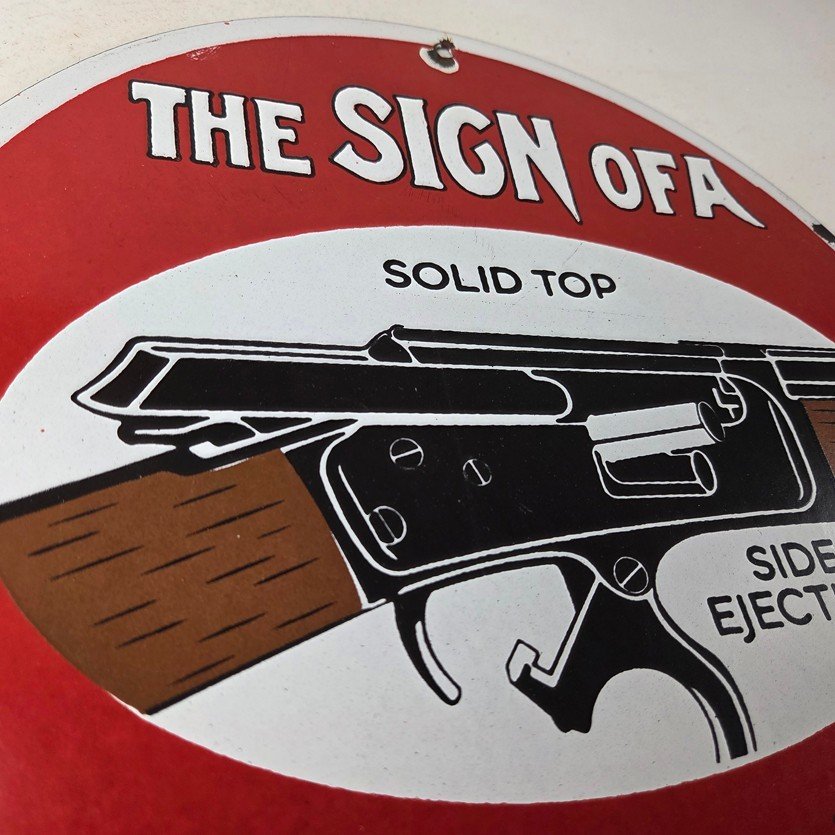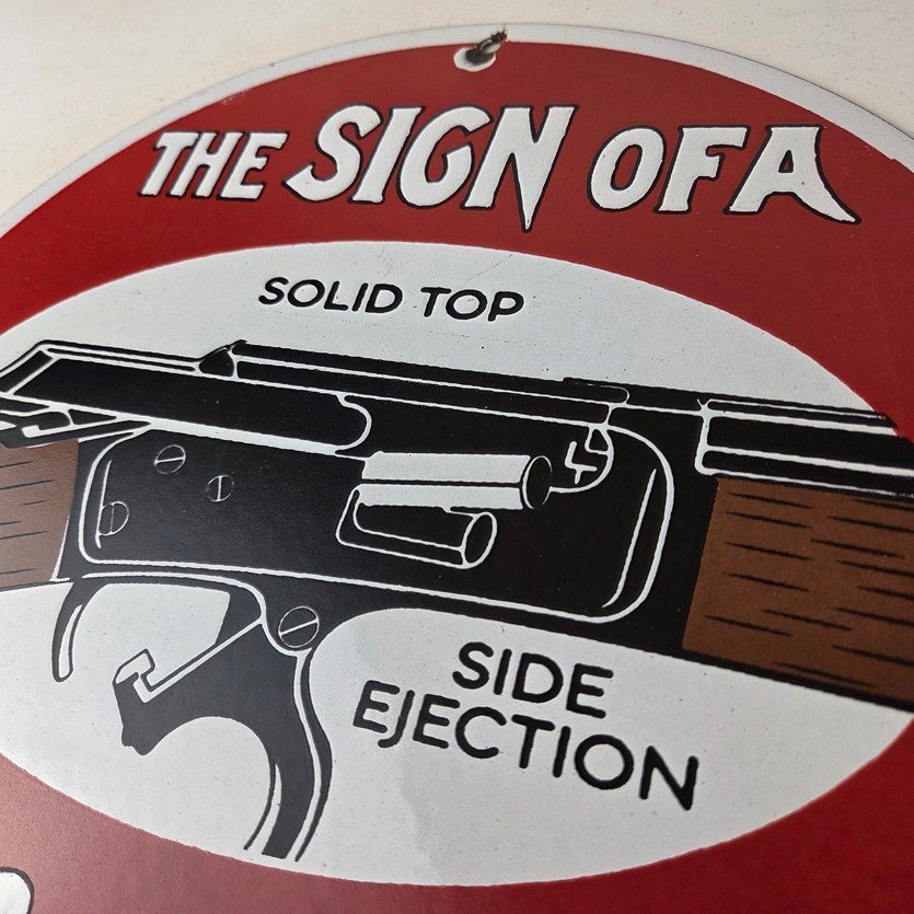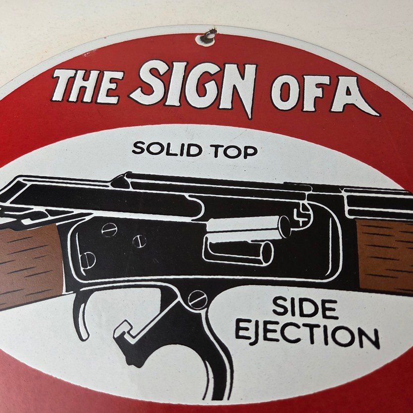 This is a vintage Marlin Solid Top Side Ejection porcelain sign (also known as a Marlin porcelain advertising pump plate sign), measuring 12 inches round. It features the classic firearms advertising theme: “THE SIGN OF A” arched at the top in white on red, a central oval illustration of a Marlin lever-action rifle with “SOLID TOP” and “SIDE EJECTION” labels, “Marlin” in bold script at the bottom — a classic Marlin repeating rifles advertising sign highlighting the solid top receiver and side ejection features.