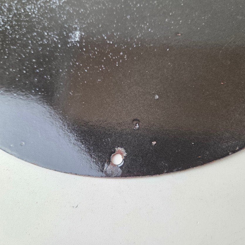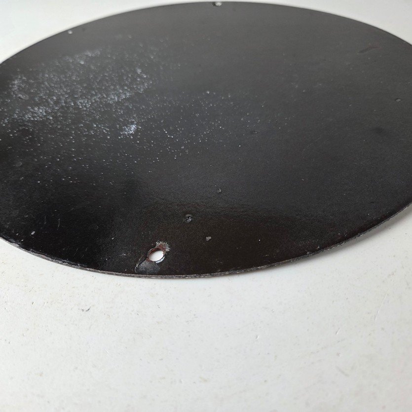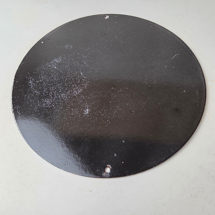 Made of porcelain enamel on steel with patina and wear: rust spotting around the mounting holes, minor edge chips, light surface scratches, and minimal discoloration. This is a porcelain enamel advertising sign in excellent condition, exactly as shown in the photos.