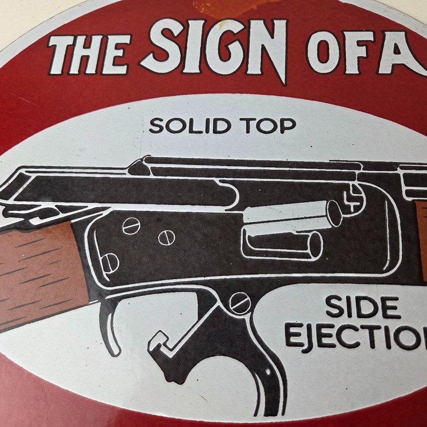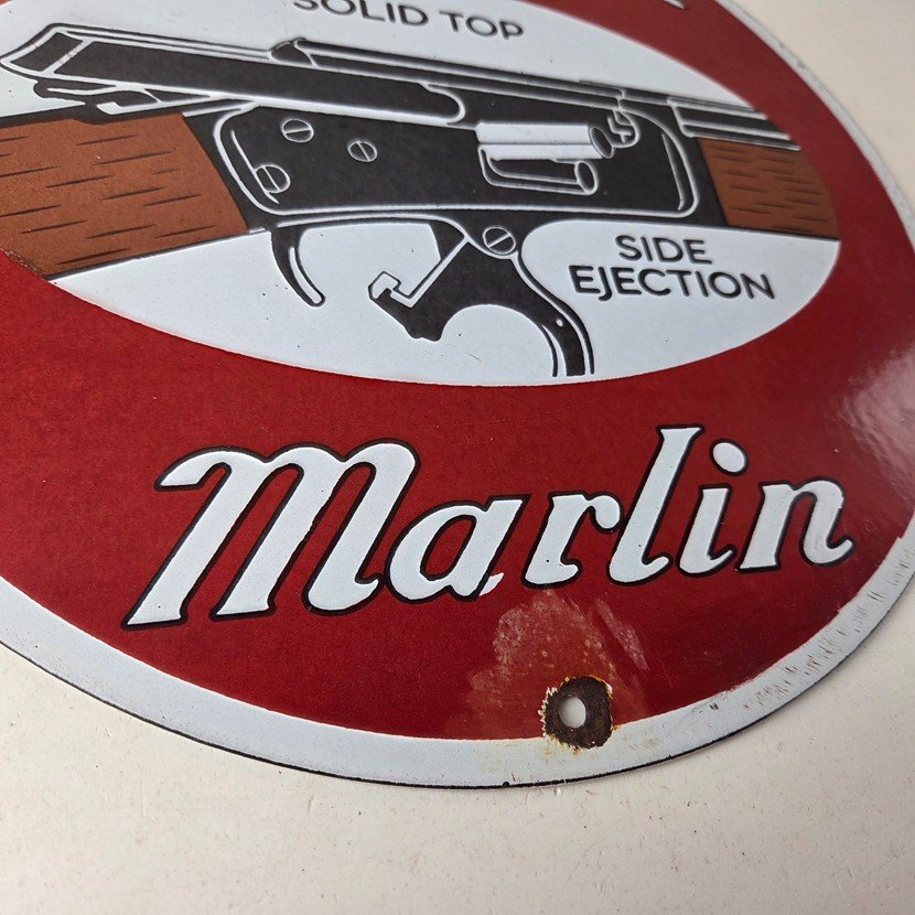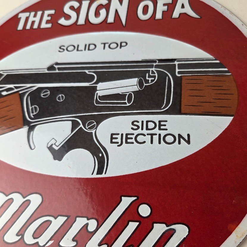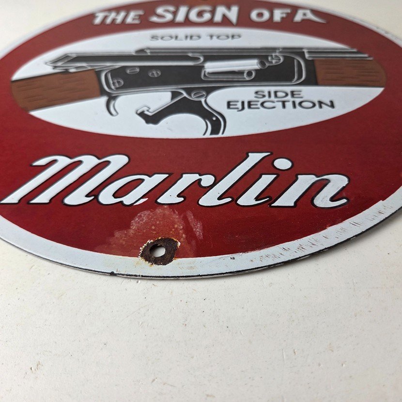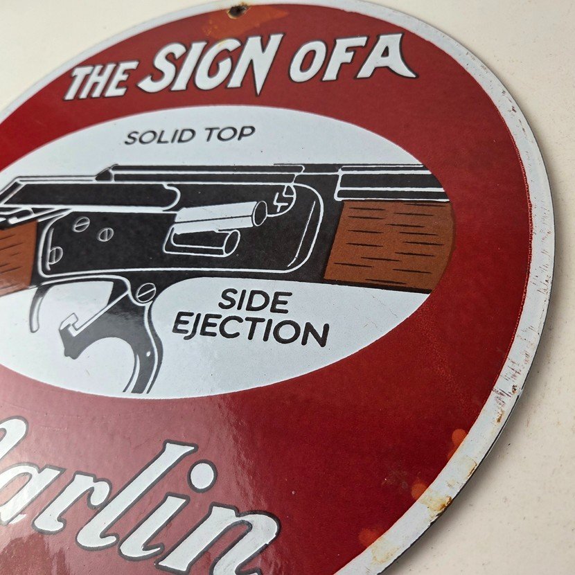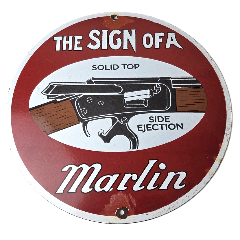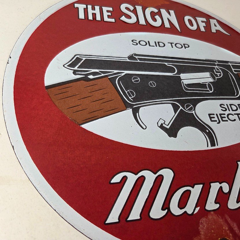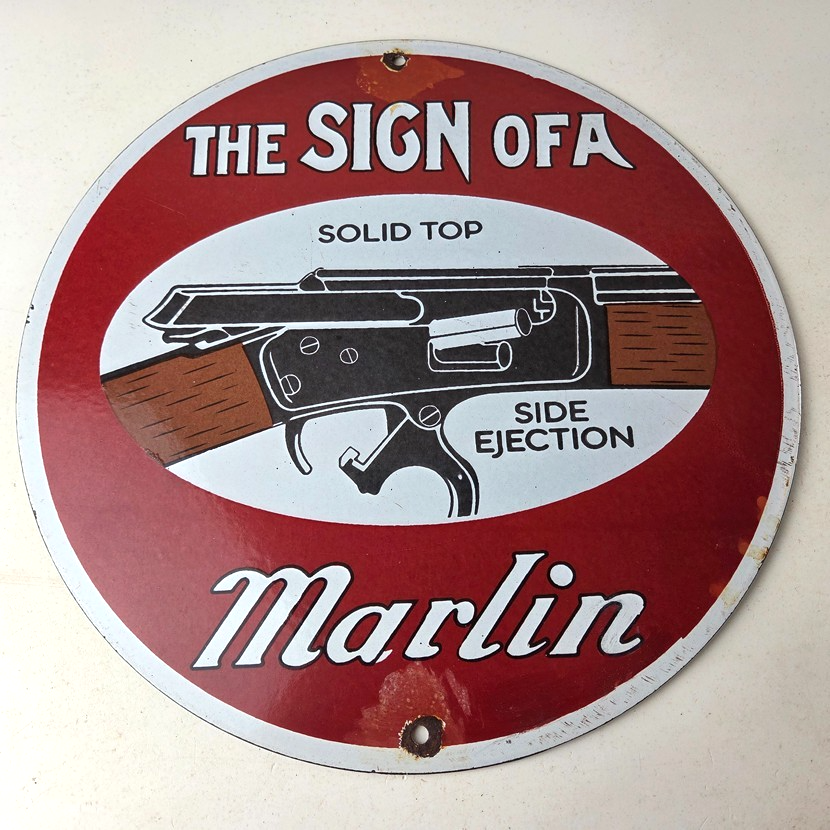 This vintage Marlin rifle solid top sign makes a great addition to a garage, shop display, man cave, gun room, or any Marlin memorabilia collection, vintage firearms advertising collection, or hunting/gun enthusiast collection.
