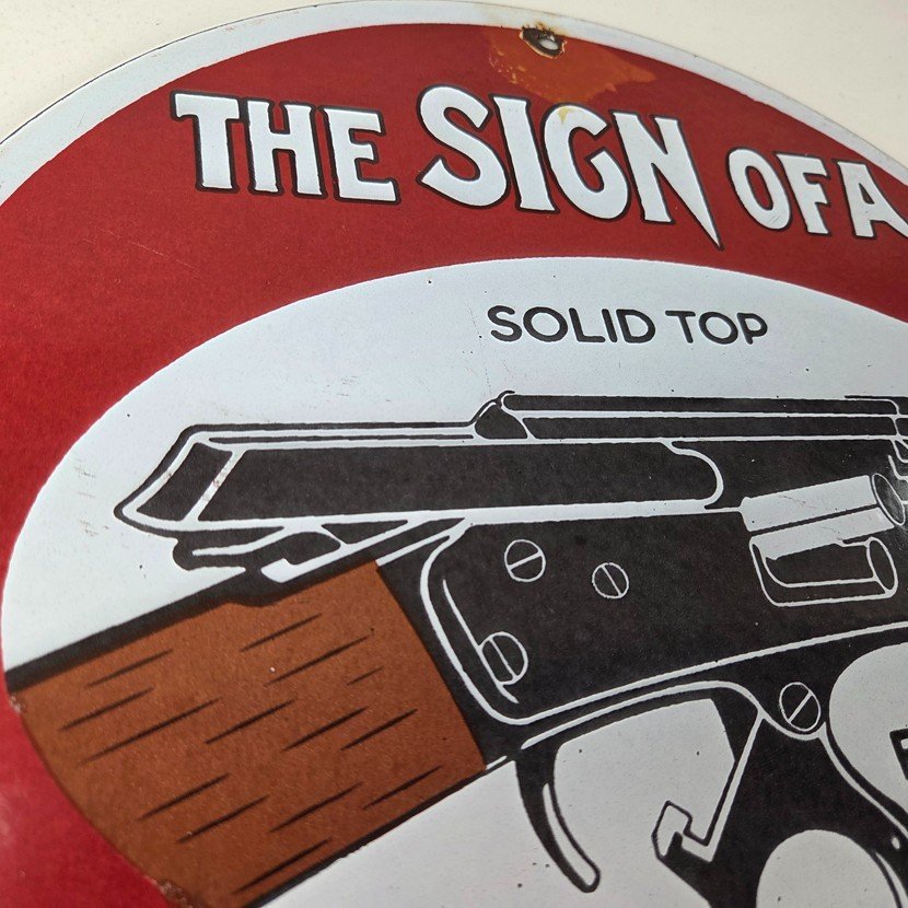 This is a vintage Marlin Solid Top Side Ejection porcelain sign (also known as a Marlin porcelain advertising pump plate sign), measuring 12 inches round. It features the classic firearms advertising theme: “THE SIGN OF A” arched at the top in white on red, a central oval illustration of a Marlin lever-action rifle with “SOLID TOP” and “SIDE EJECTION” labels, “Marlin” in bold script at the bottom — a classic Marlin repeating rifles advertising sign highlighting the solid top receiver and side ejection features.