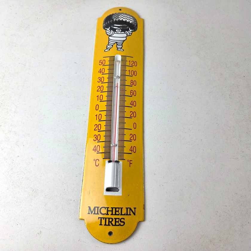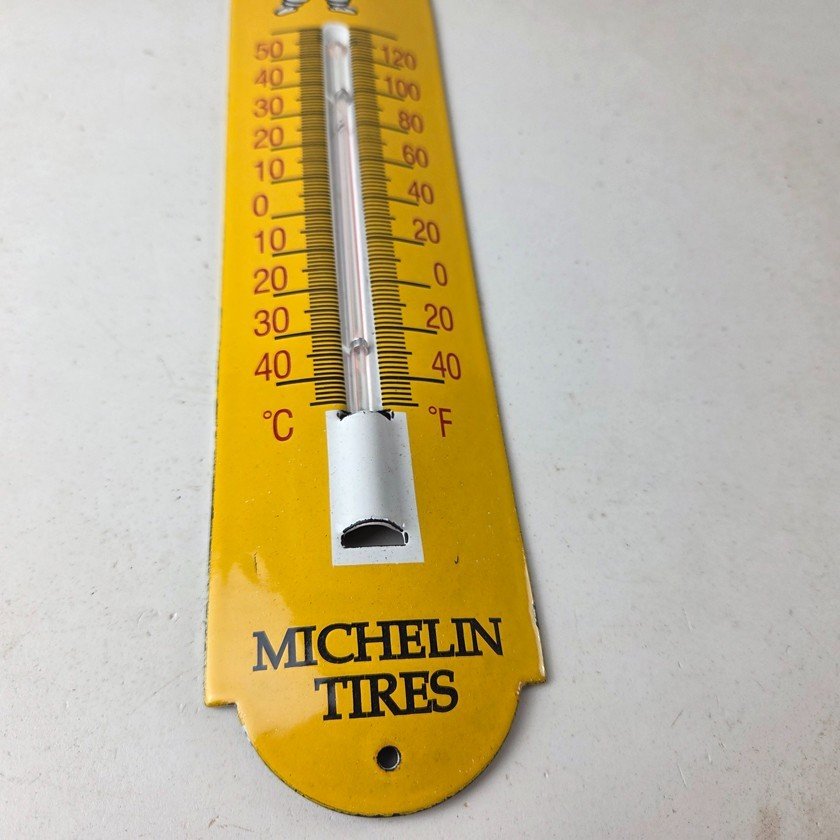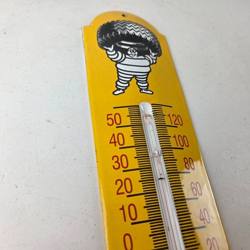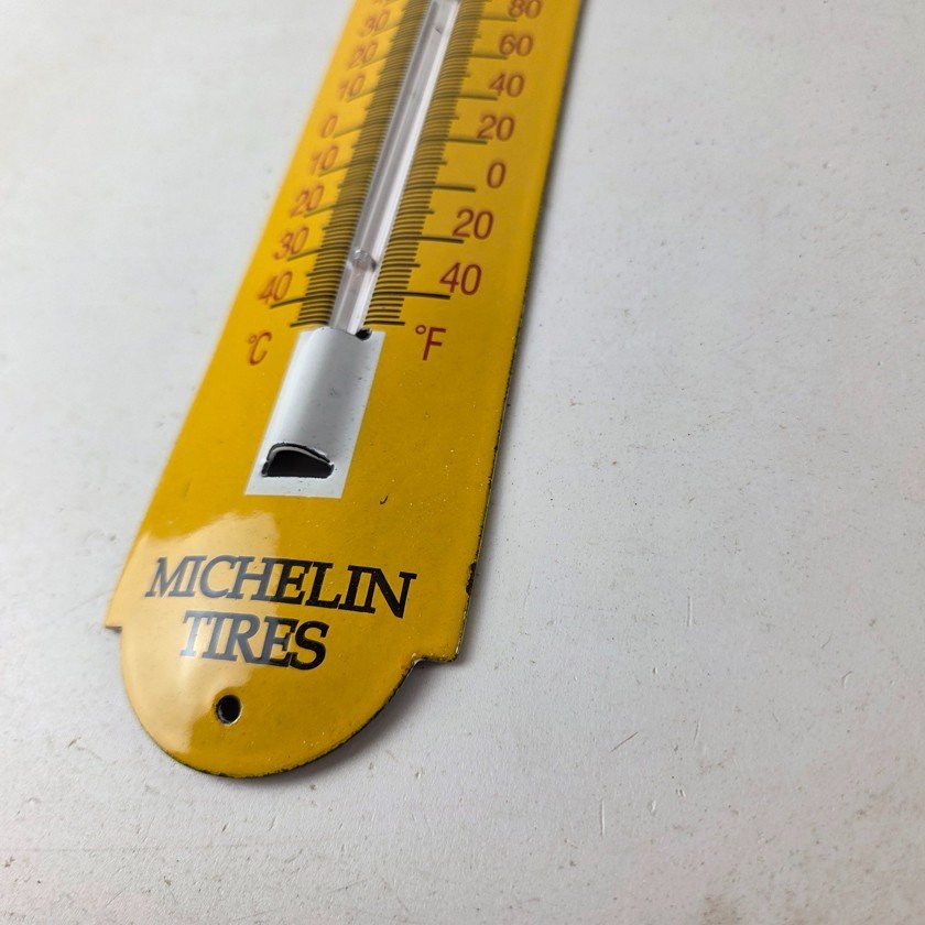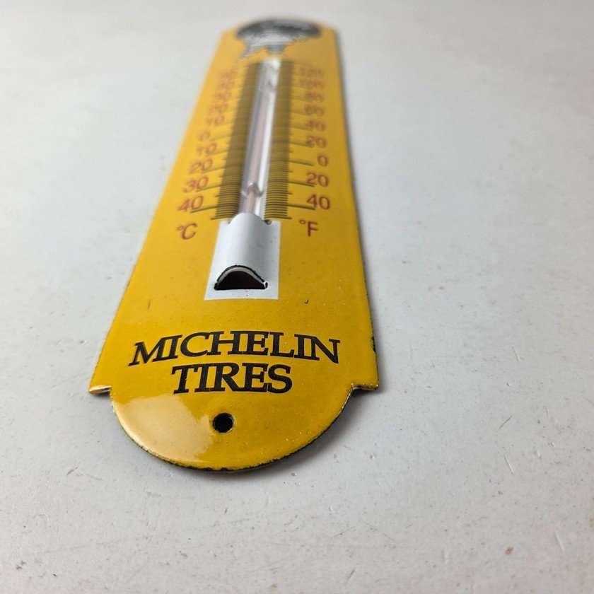 This vintage Michelin Tires porcelain thermometer measures 11 3/4″ x 2 1/2″. This thermometer is a great addition to any collection. It features the iconic Bibendum man graphic and has vibrant yellow colors with excellent gloss.
