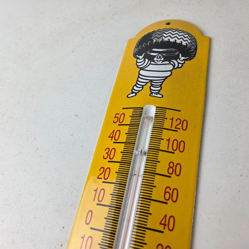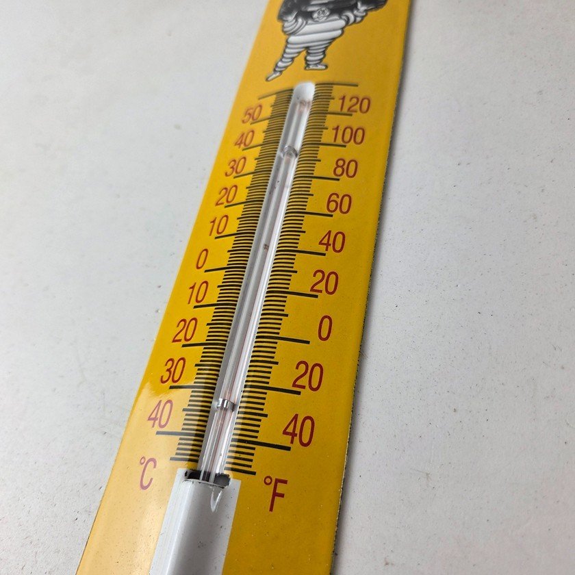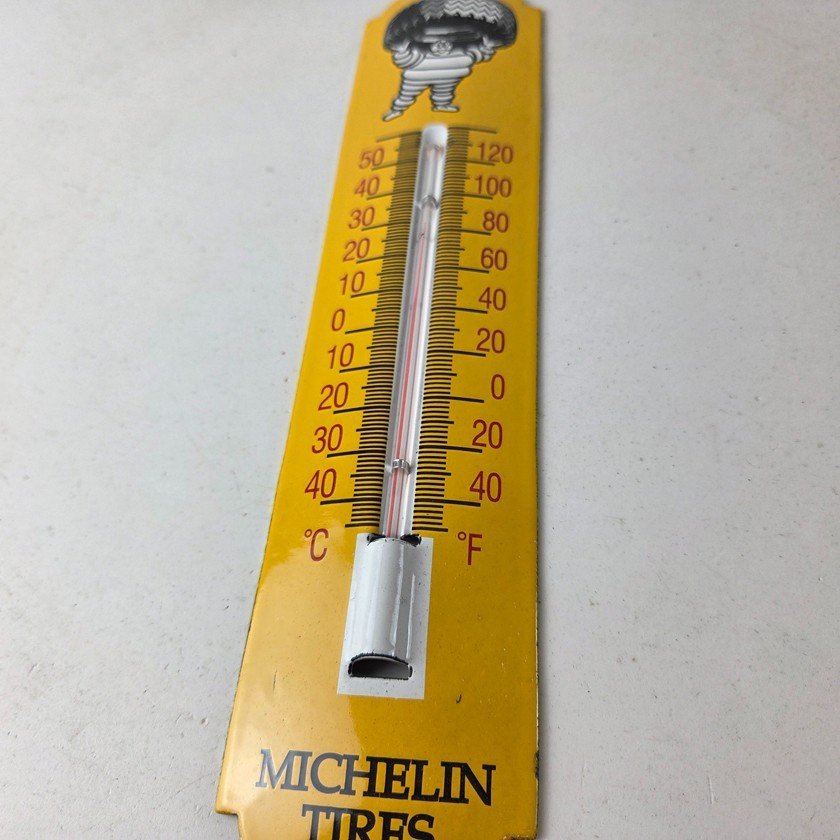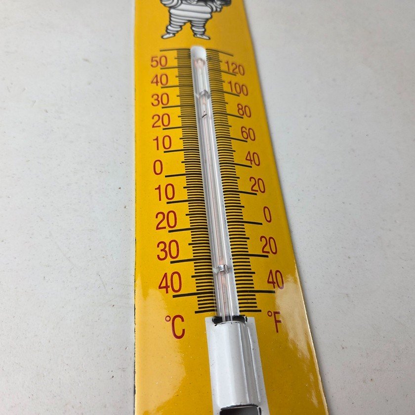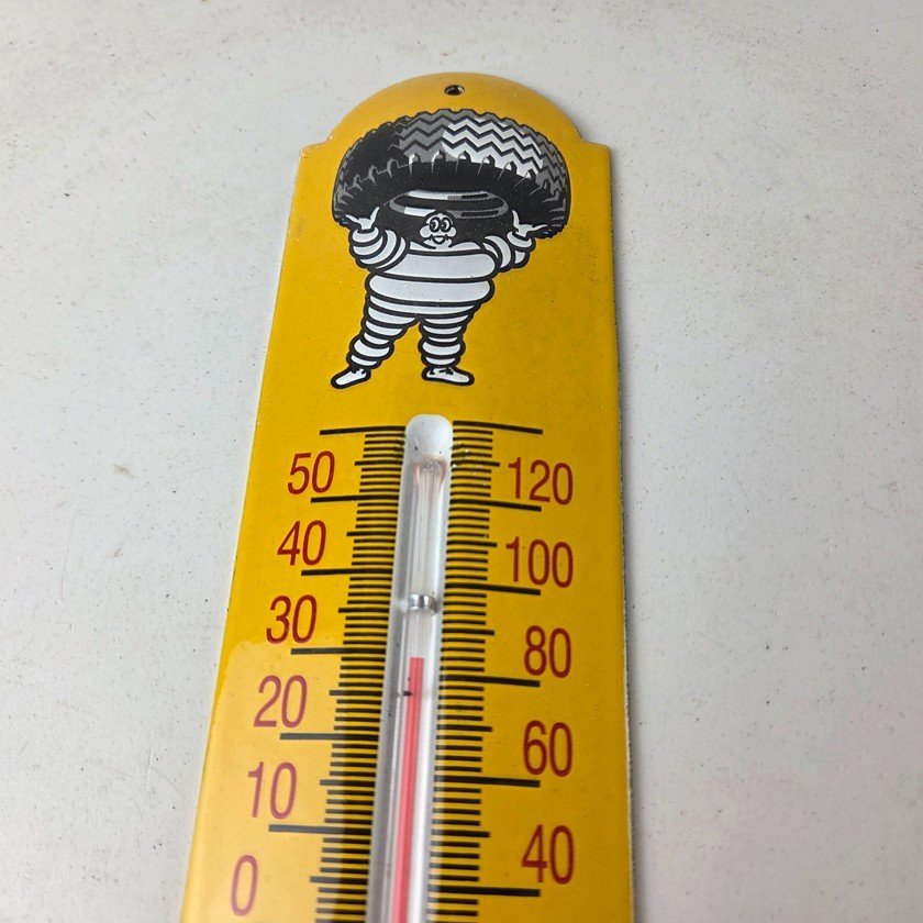 This vintage Michelin Tires porcelain thermometer measures 11 3/4″ x 2 1/2″. This thermometer is a great addition to any collection. It features the iconic Bibendum man graphic and has vibrant yellow colors with excellent gloss.