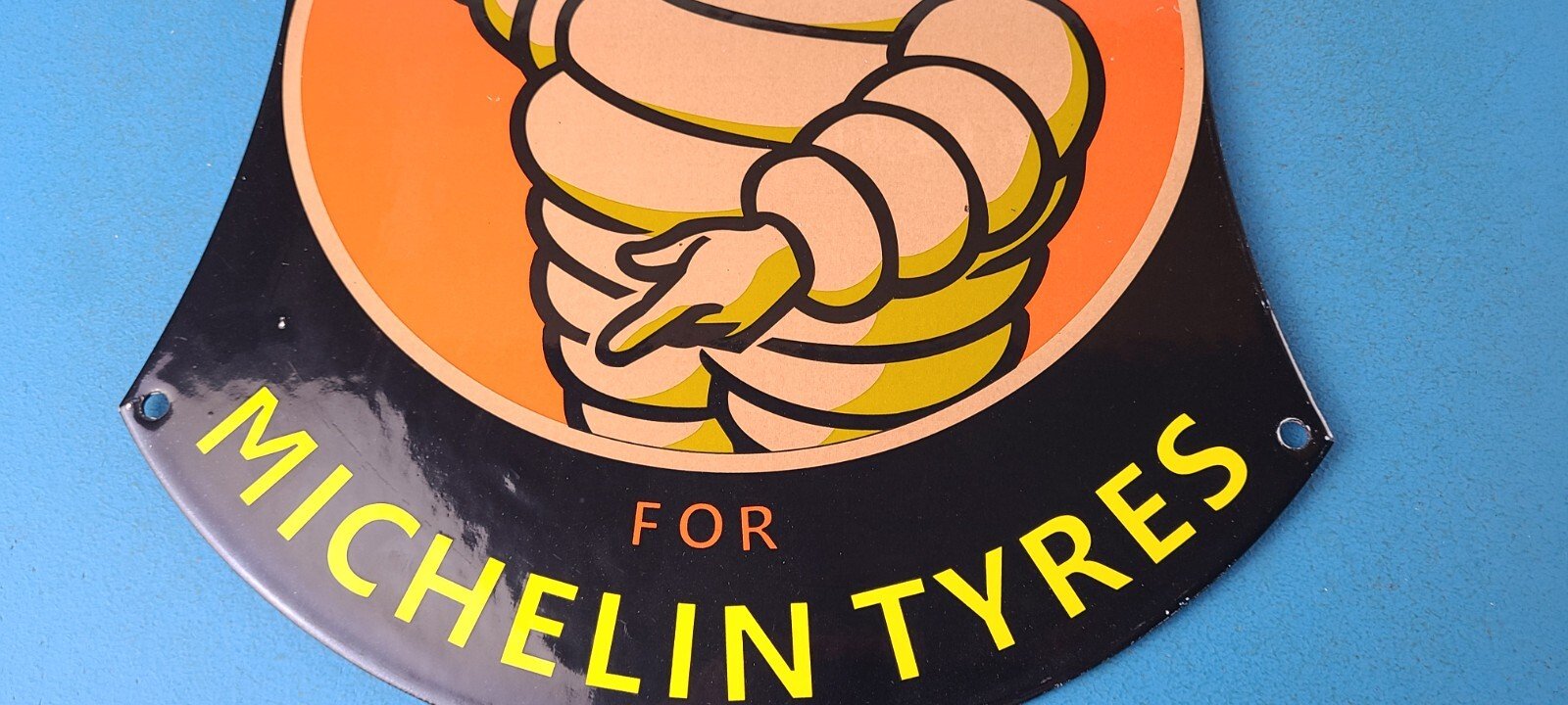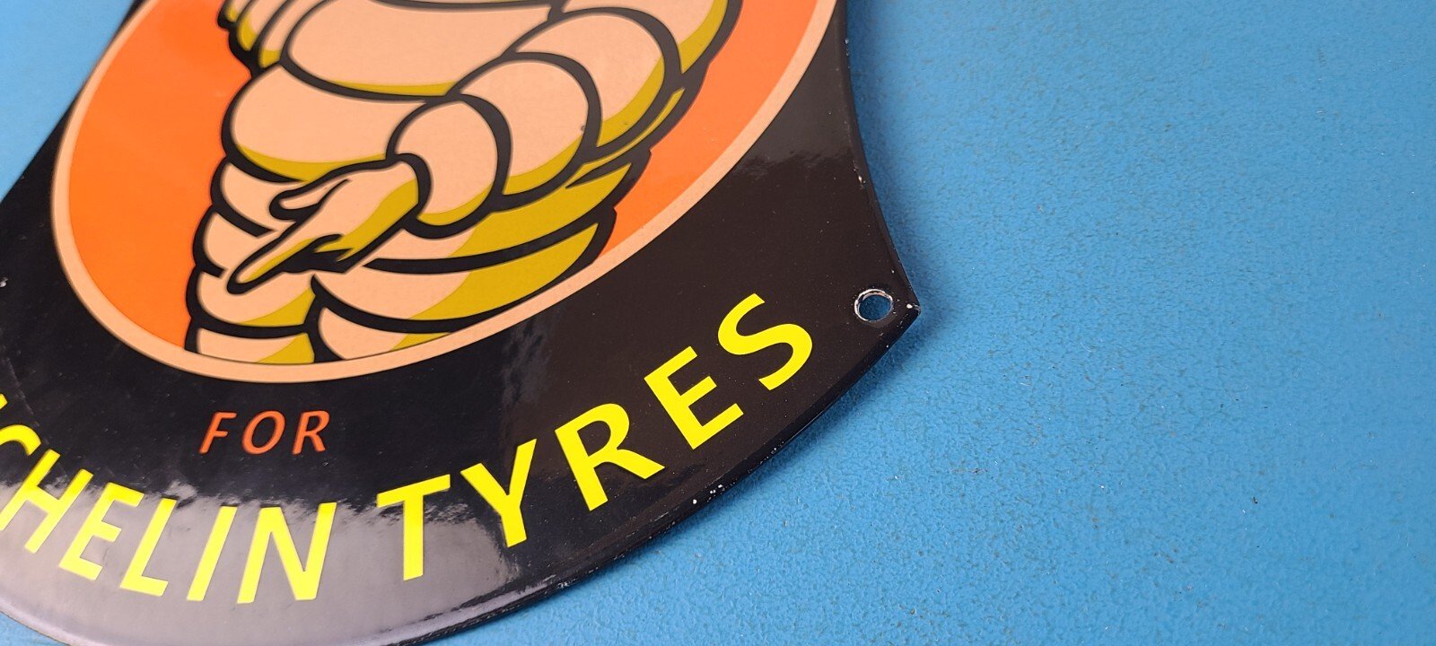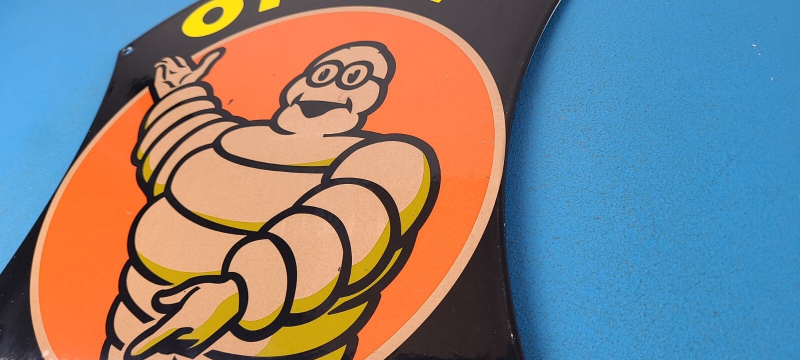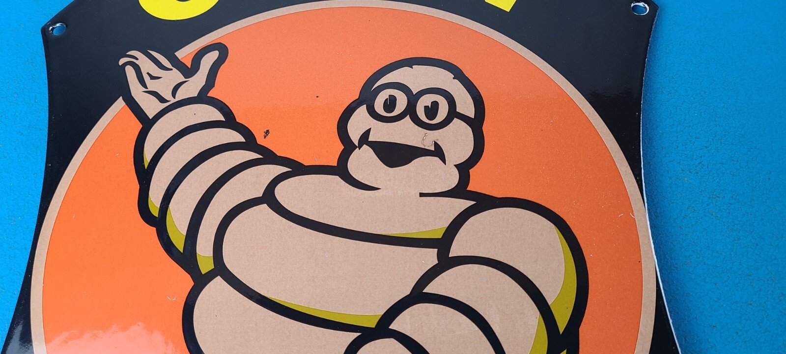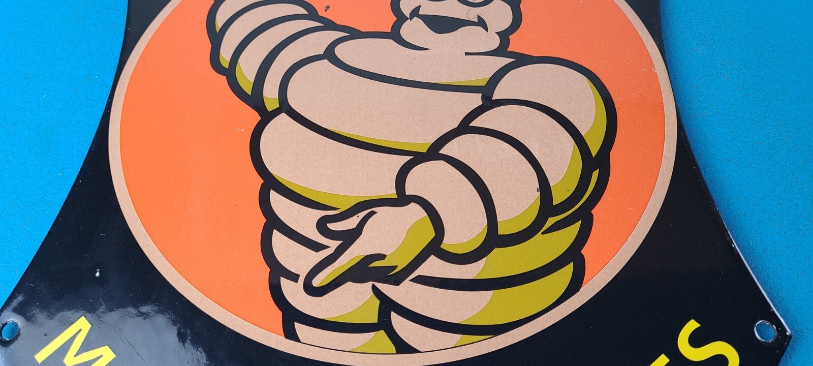 This vintage Michelin Tires porcelain sign features Bibendum man in the center. This porcelain gas sign has excellent gloss and colors.