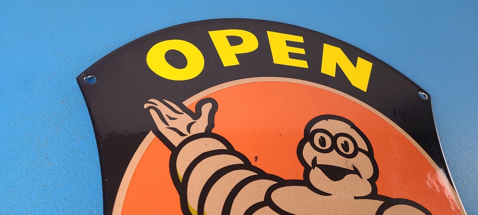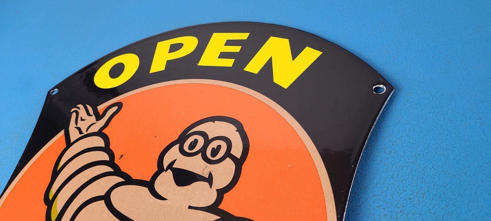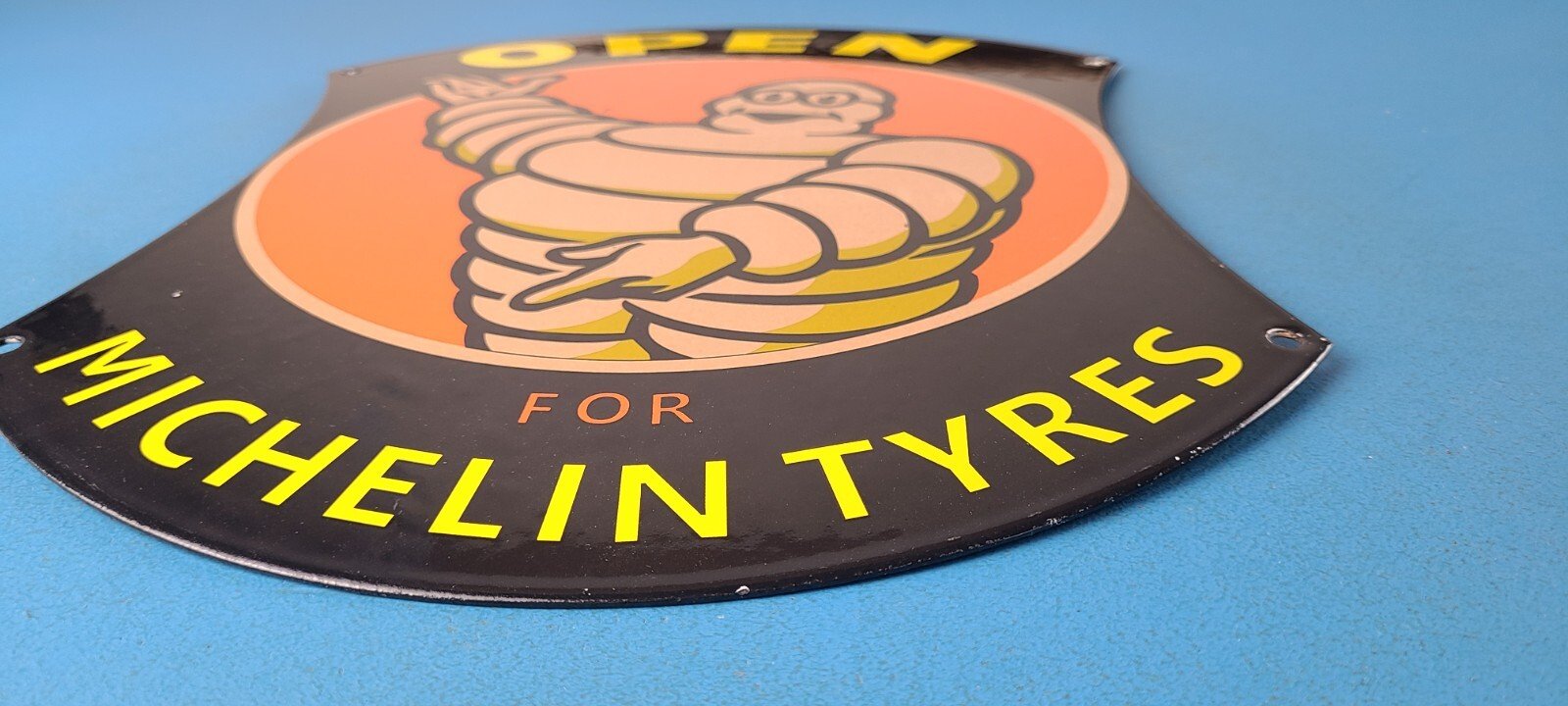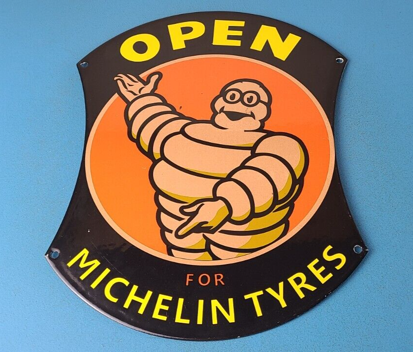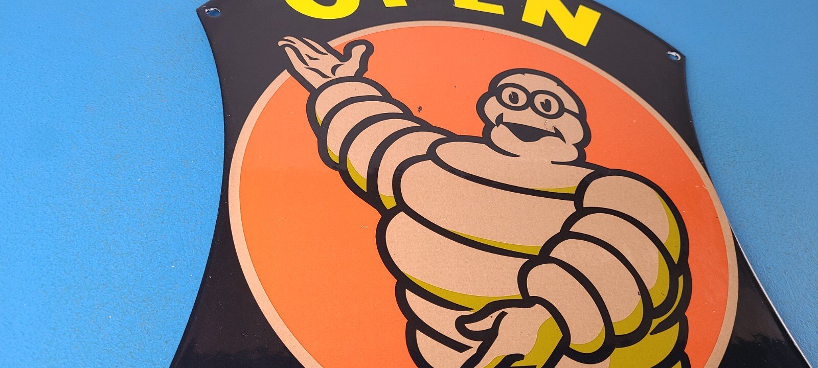 This vintage Michelin Tires porcelain sign features Bibendum man in the center. This porcelain gas sign has excellent gloss and colors.