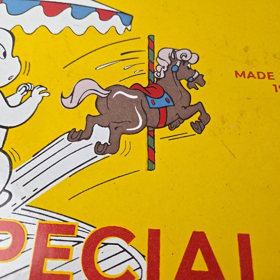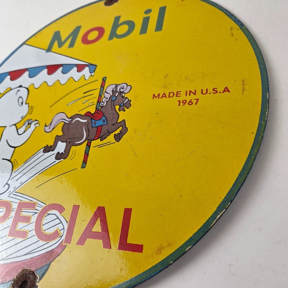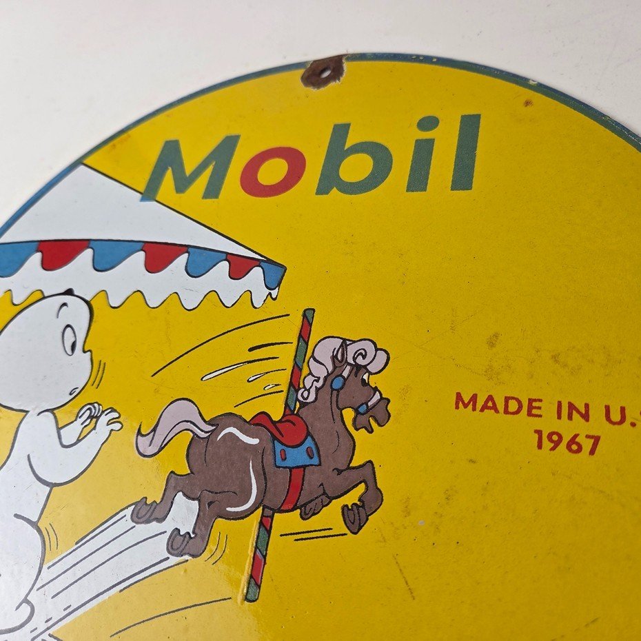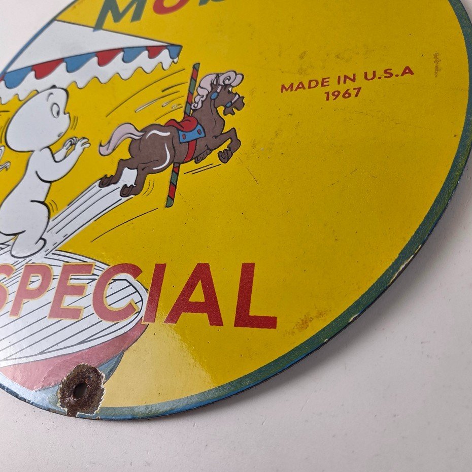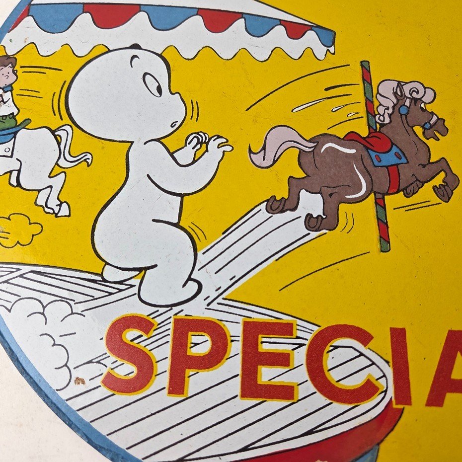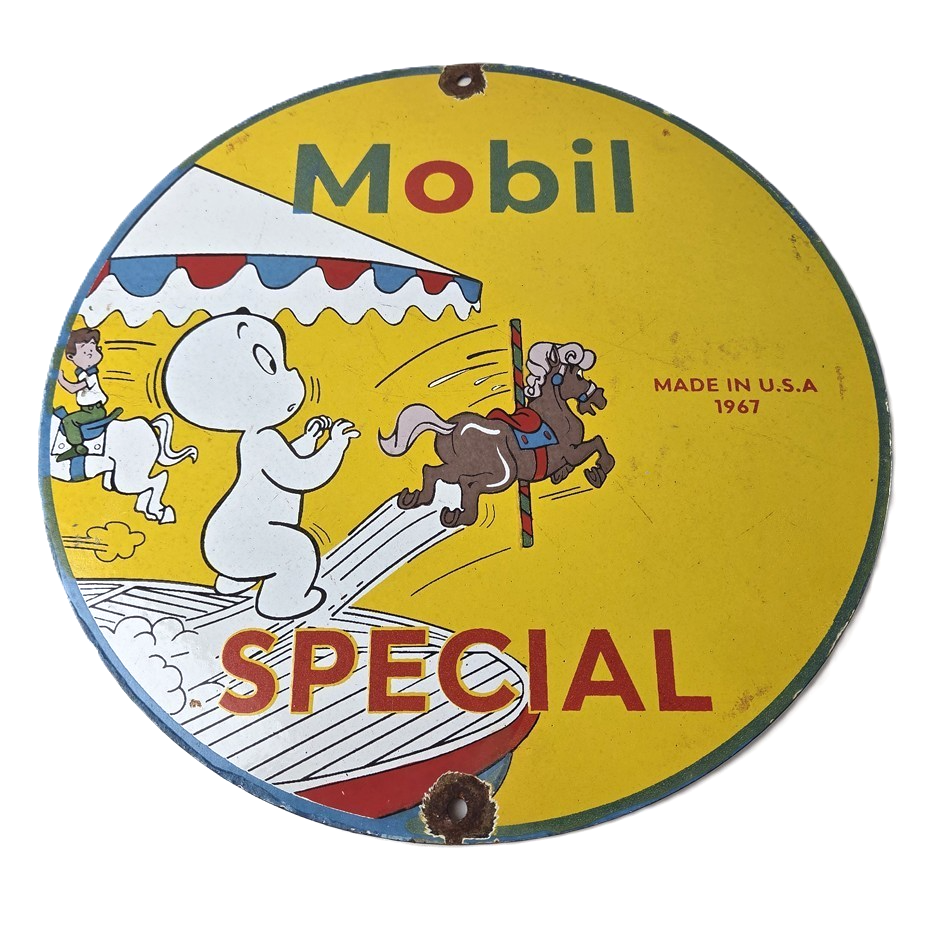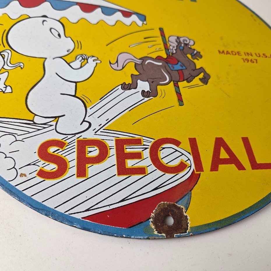 This vintage porcelain sign features Casper. The sign measures 12 inches and has a colorful design with excellent porcelain. It is a great piece of gas and oil advertising memorabilia for collectors, retro man cave decor or your shop or garage. Collectors of vintage gas and oil advertising signs, as well as fans of Nostalgic man cave themes, will appreciate this amazing find.