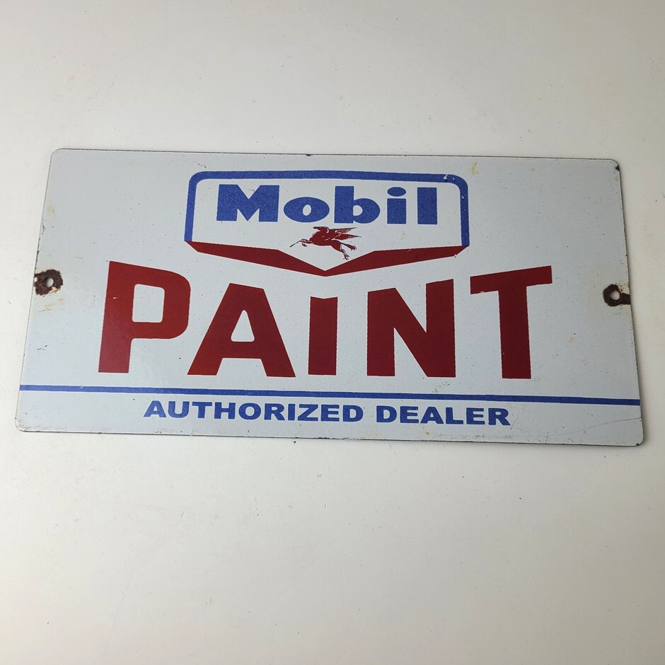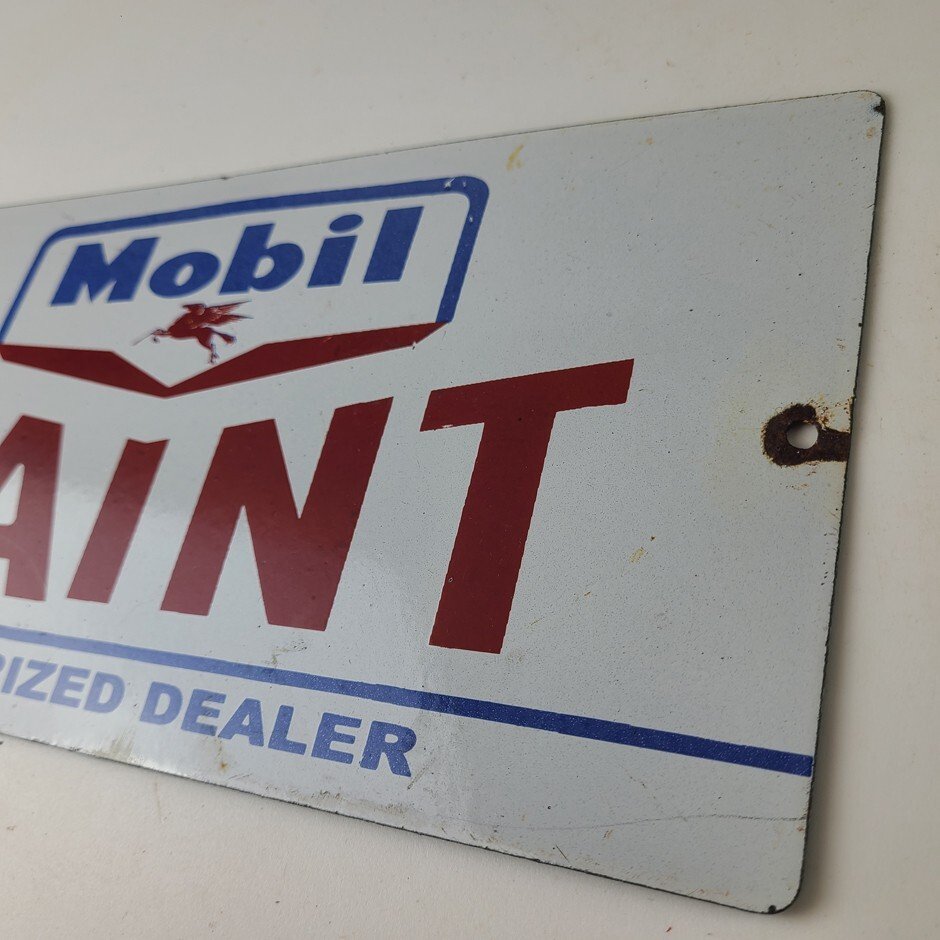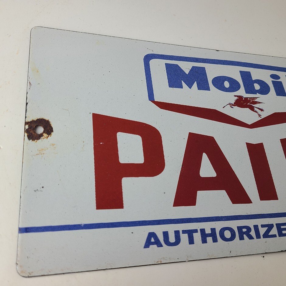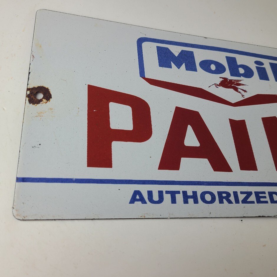 This vintage Mobil oil porcelain sign features the iconic Mobil Pegasus in the center and is made of durable porcelain, ensuring it will withstand the test of time. The sign measures 12″ x 6″ and boasts vibrant red and blue colors that will catch the eye of any collector or admirer.