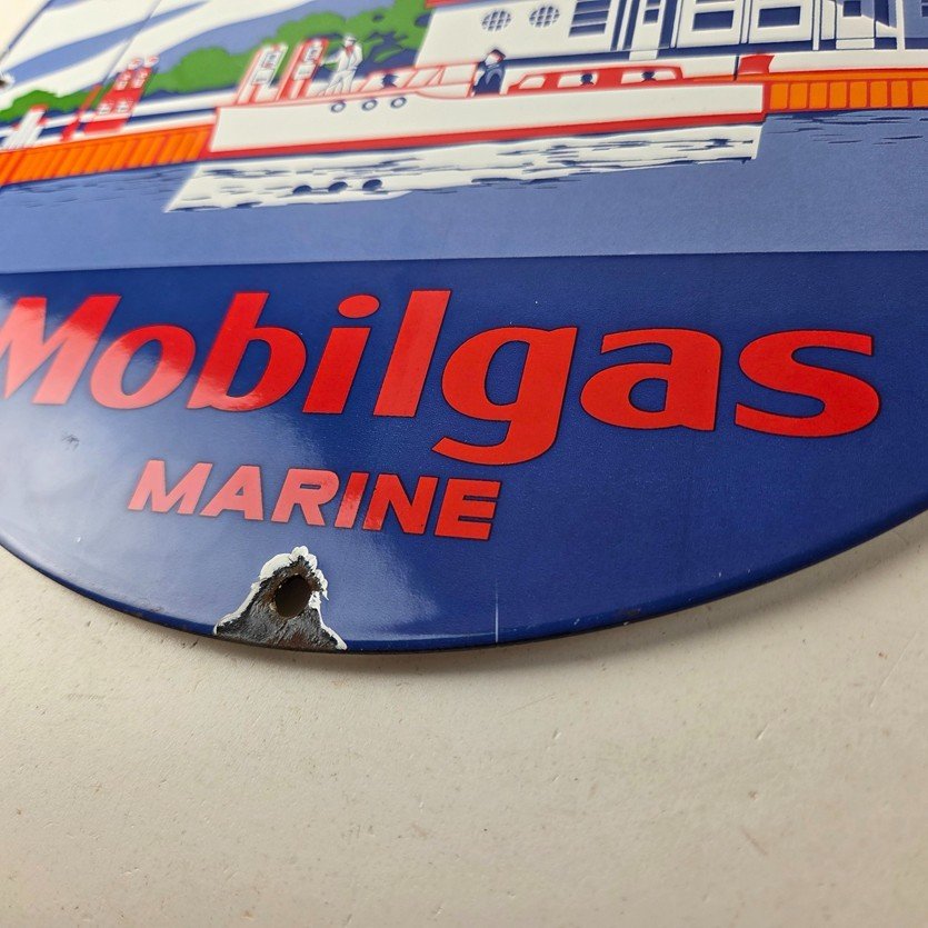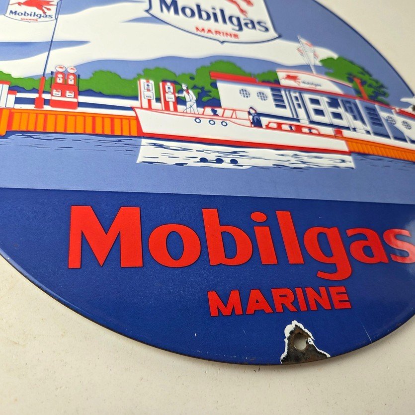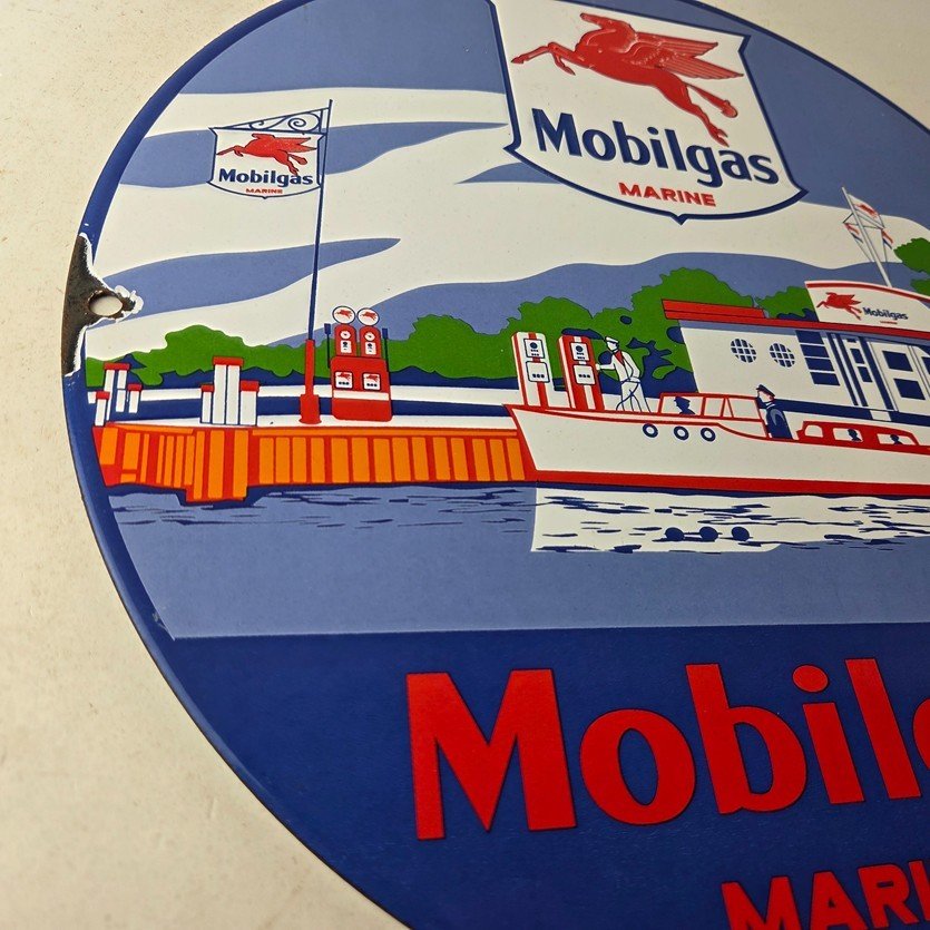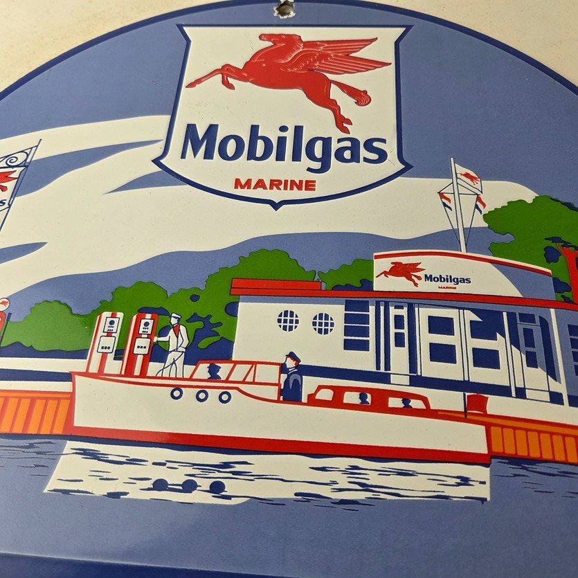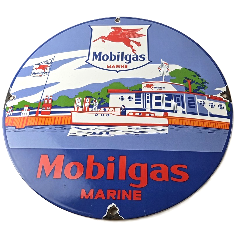This vintage Mobilgas porcelain sign features the iconic Marine Mobil advertisement. The sign is predominantly red and blue, with the Mobil brand name prominently displayed. It measures 11 3/4″ and has excellent porcelain.
