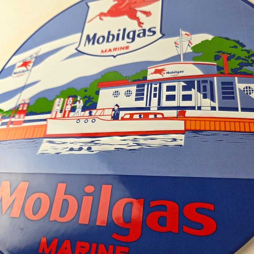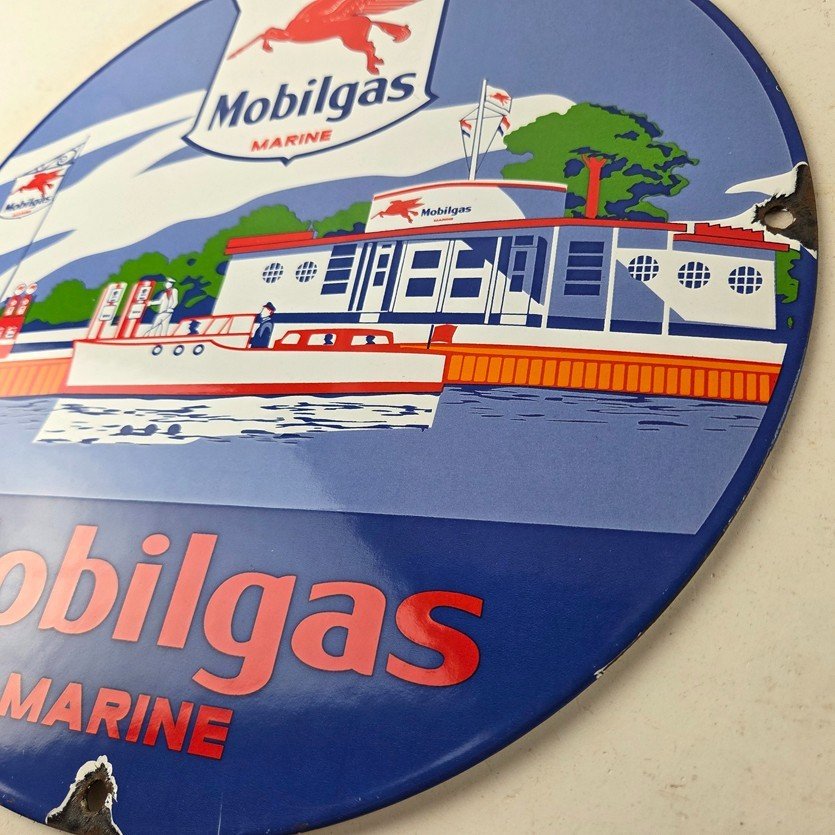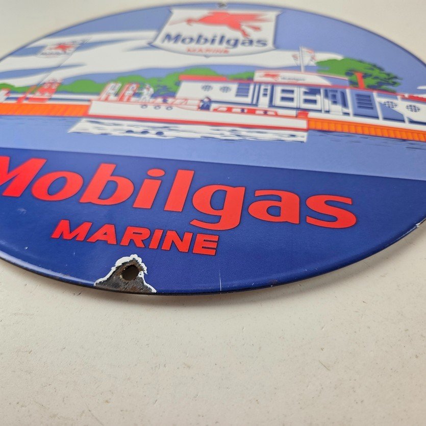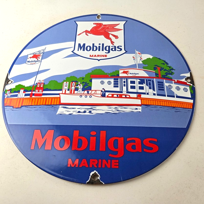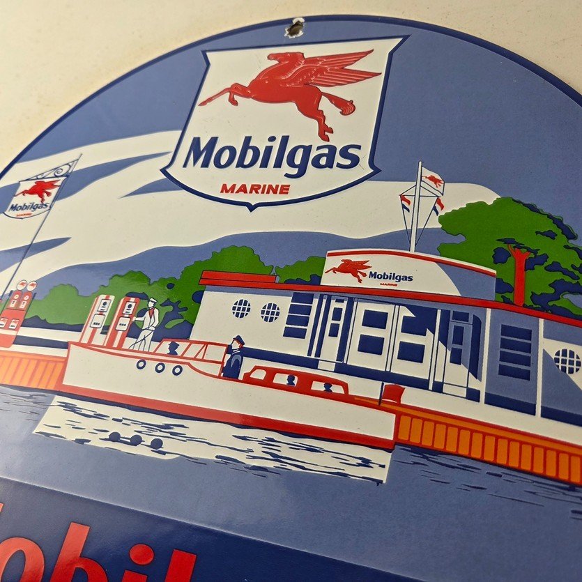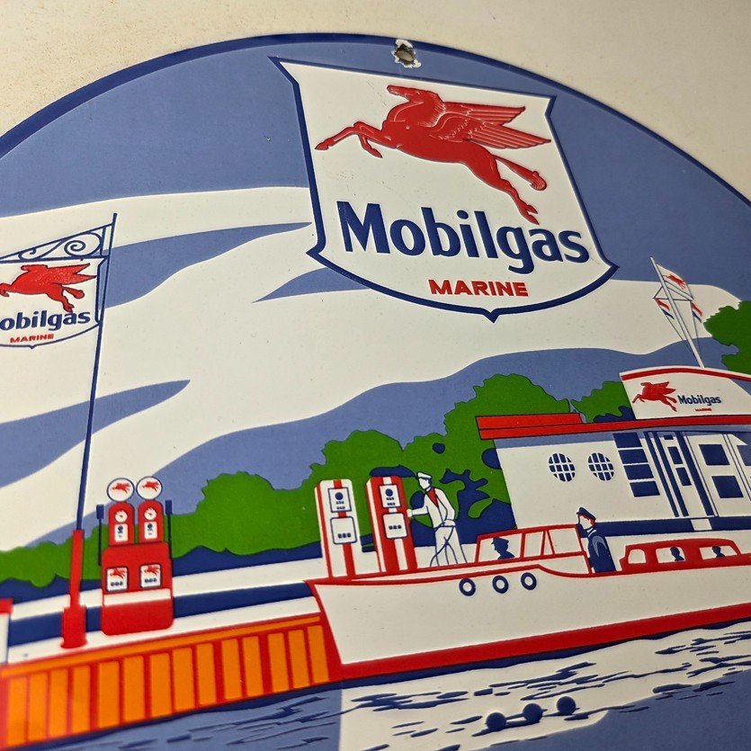 This vintage Mobilgas porcelain sign features the iconic Marine Mobil advertisement. The sign is predominantly red and blue, with the Mobil brand name prominently displayed. It measures 11 3/4″ and has excellent porcelain.