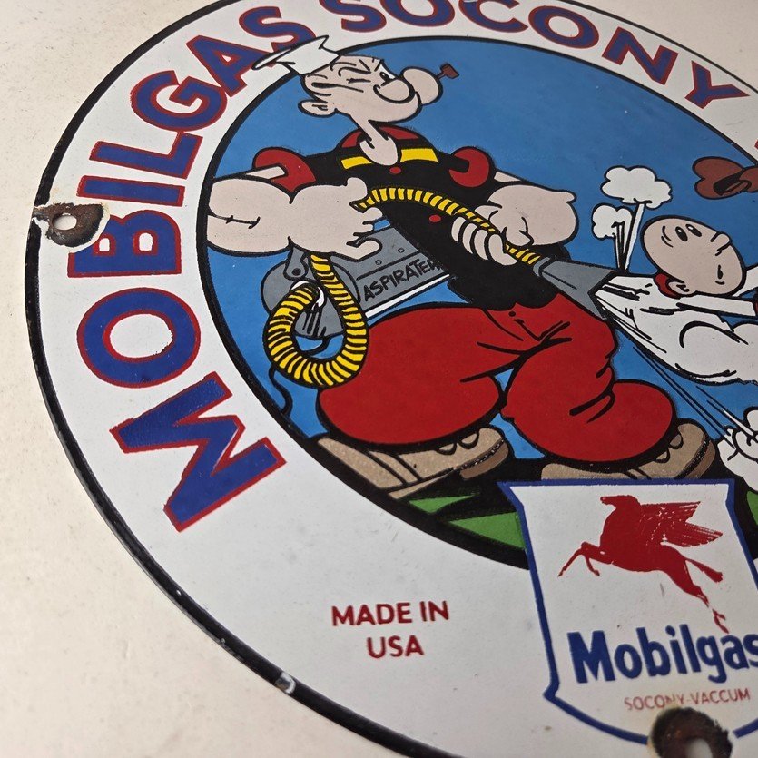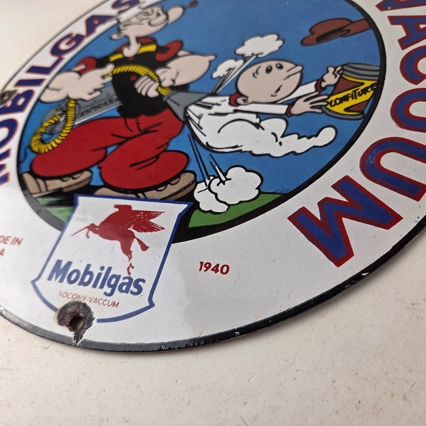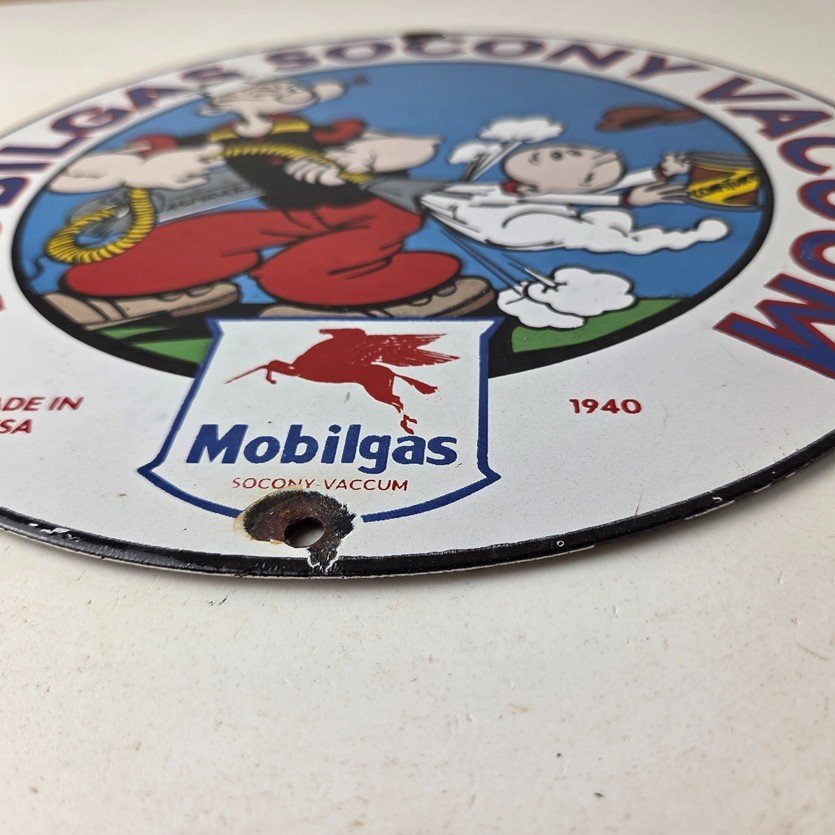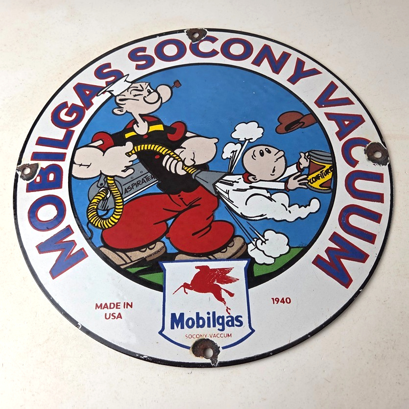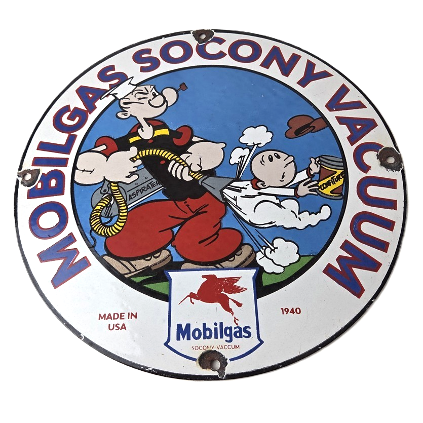 This vintage Mobilgas porcelain sign features the iconic Popeye the Sailor from Mobil Gasoline. The sign has excellent vibrant colors with the Mobil brand name prominently displayed. It measures 12″ and has excellent porcelain.