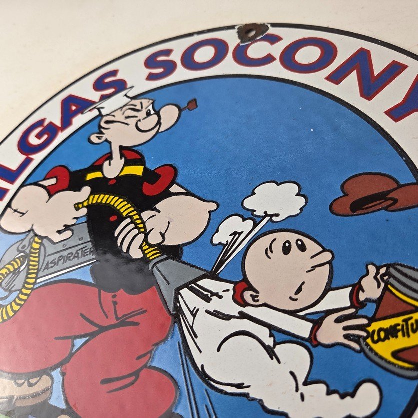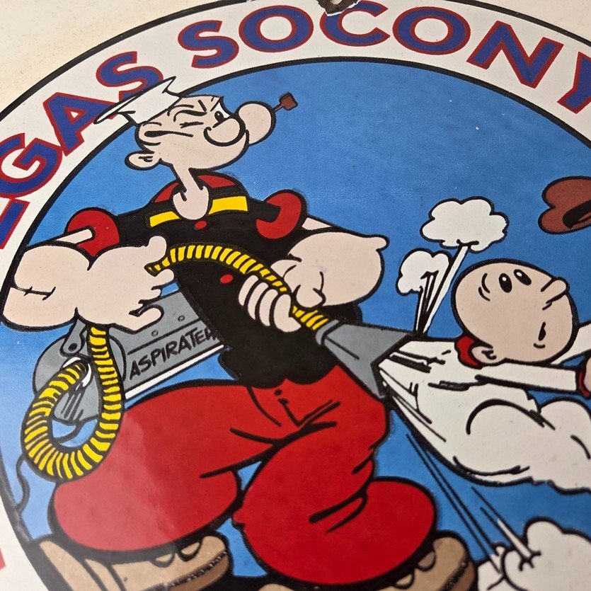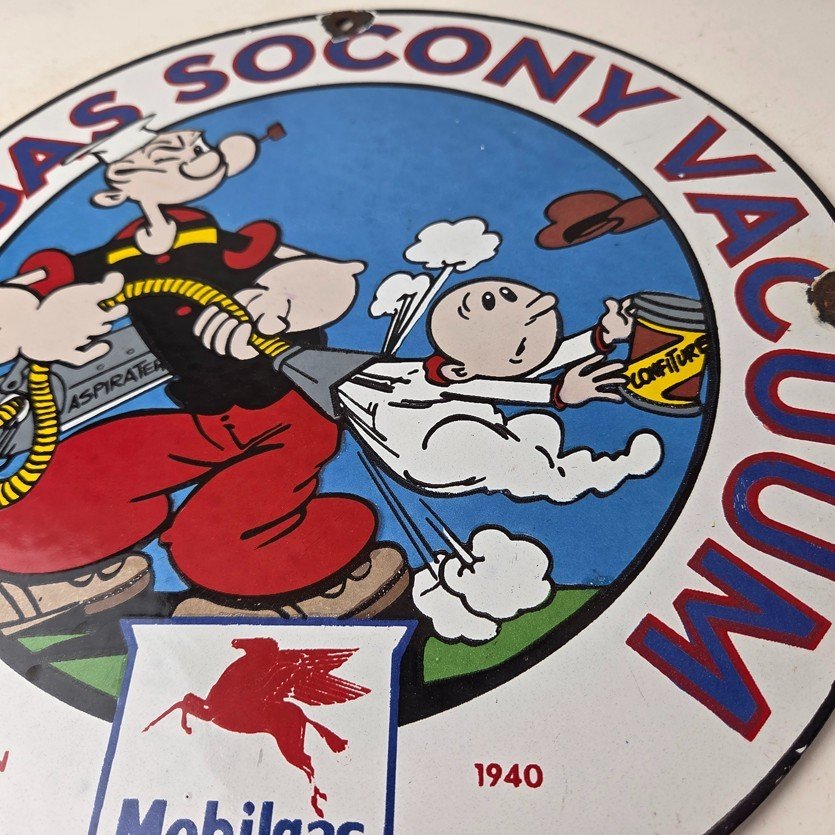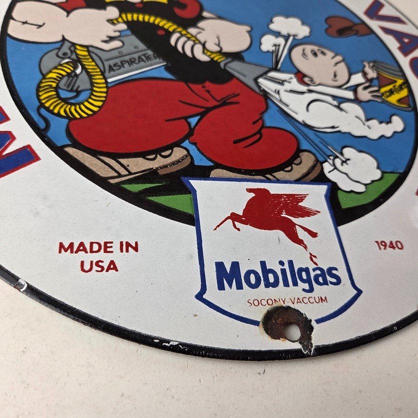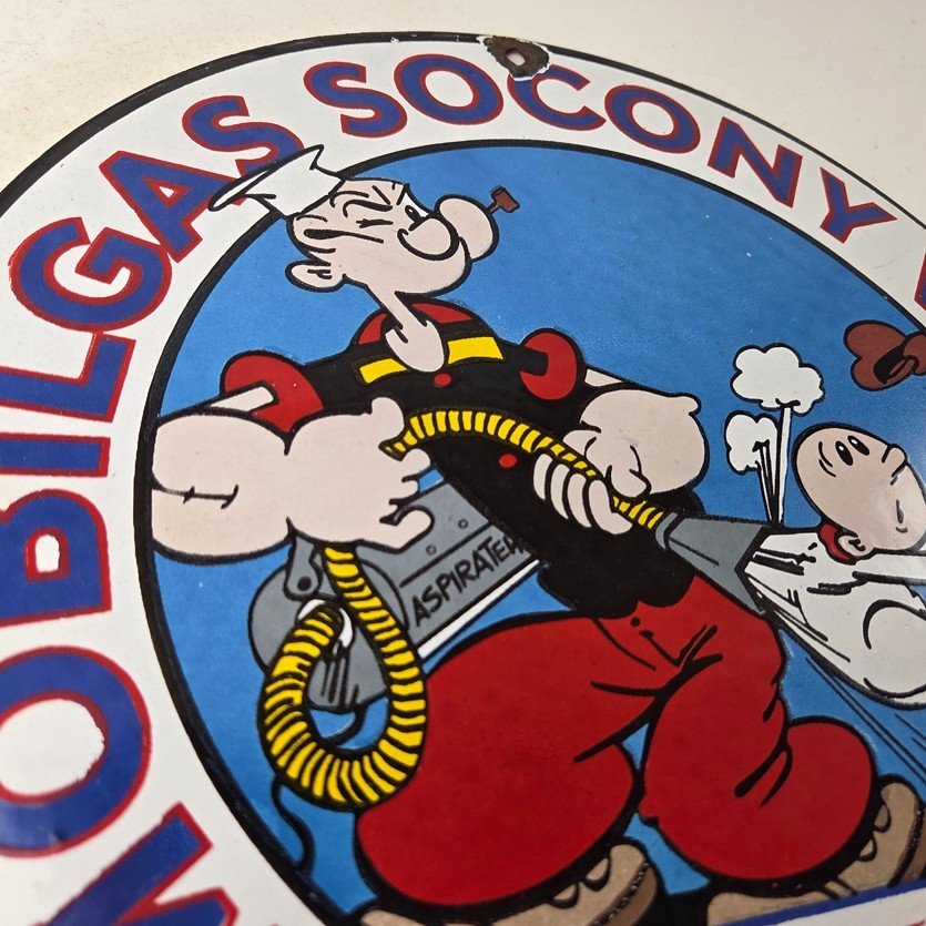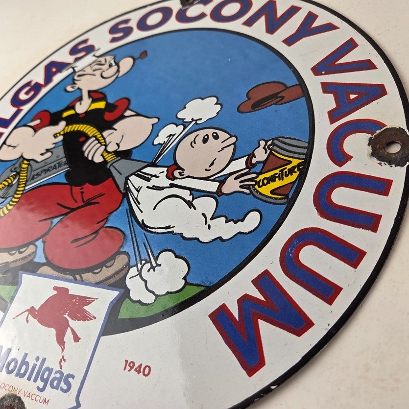 This vintage Mobilgas porcelain sign features the iconic Popeye the Sailor from Mobil Gasoline. The sign has excellent vibrant colors with the Mobil brand name prominently displayed. It measures 12″ and has excellent porcelain.