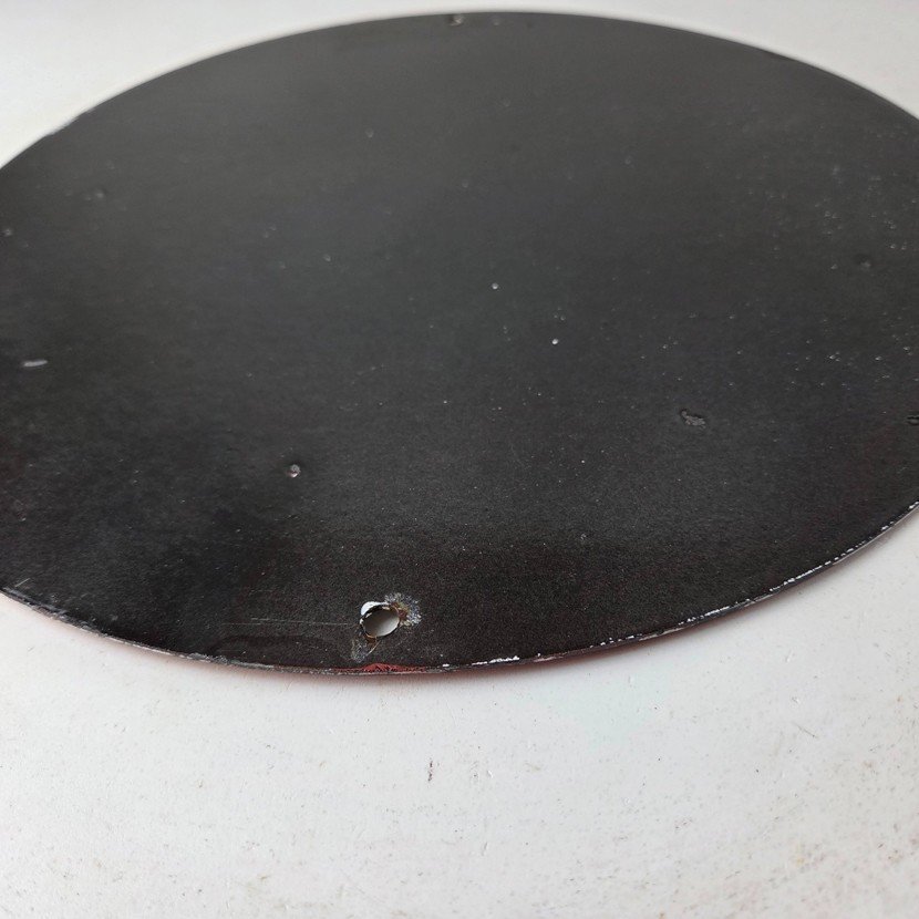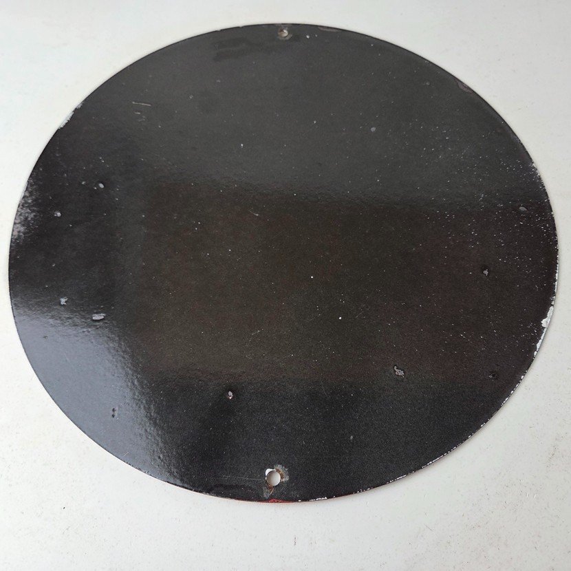 Made of porcelain enamel on steel with patina and wear: rust spotting around the mounting holes, minor edge chips, light surface scratches, and minimal discoloration. This is a porcelain enamel advertising sign in excellent condition, exactly as shown in the photos.