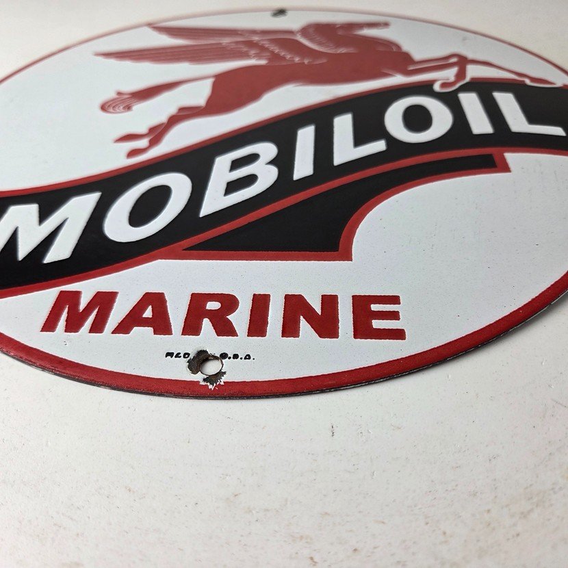This vintage Mobiloil Pegasus Marine sign makes a great addition to a garage, shop display, man cave, boathouse, or any Mobiloil memorabilia collection, vintage marine oil advertising collection, or petroliana collection.