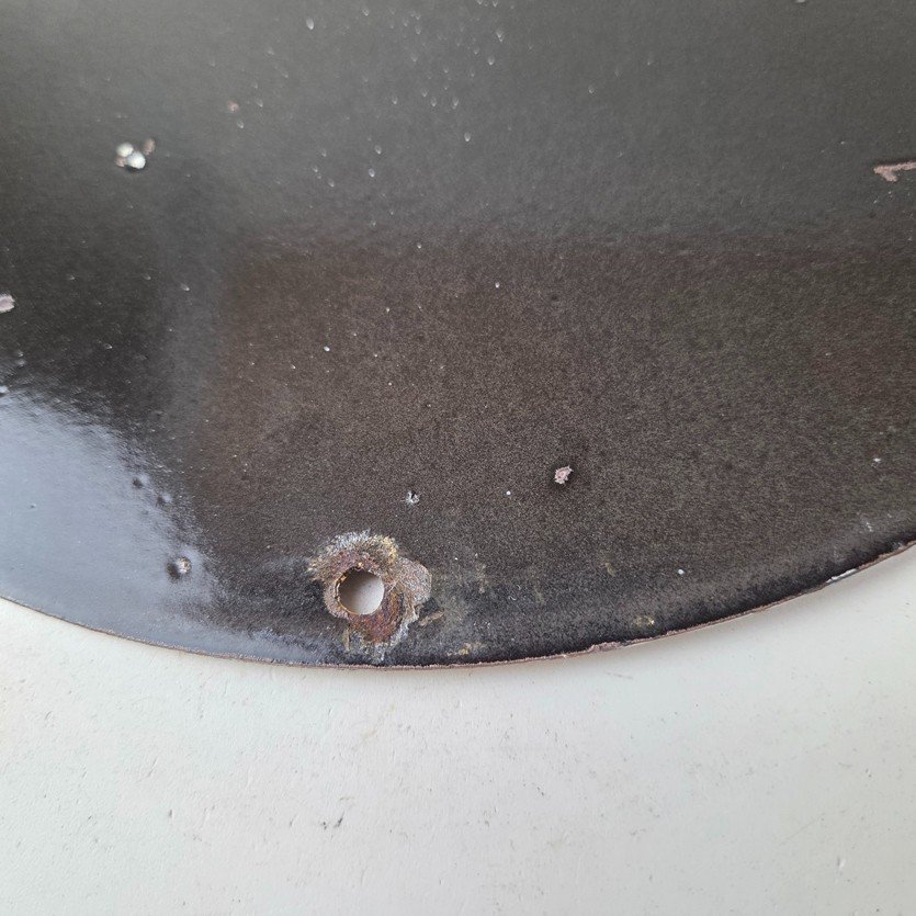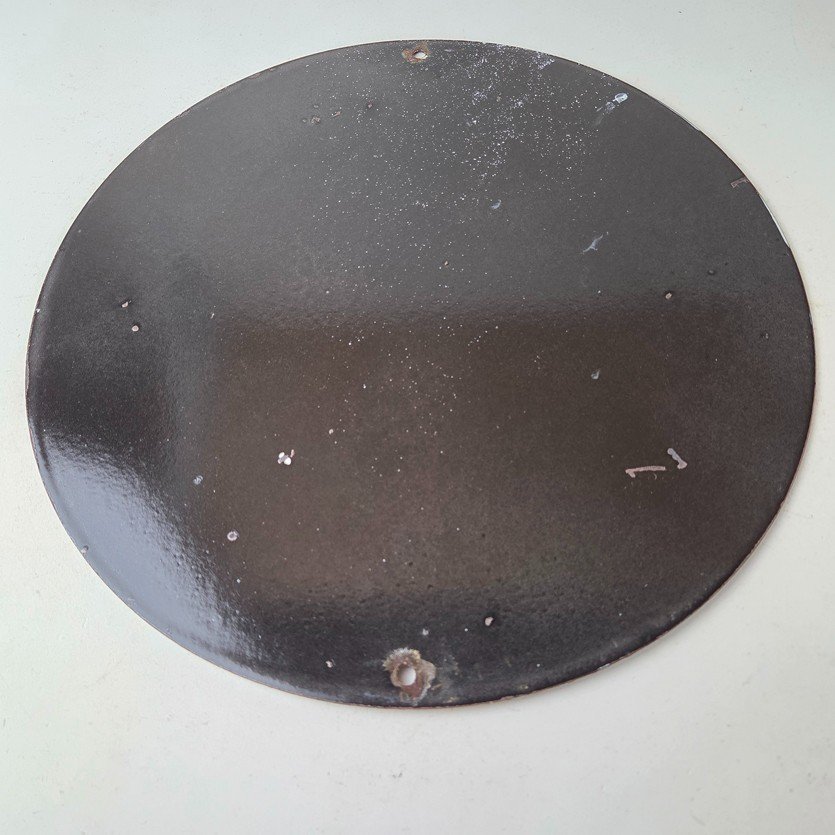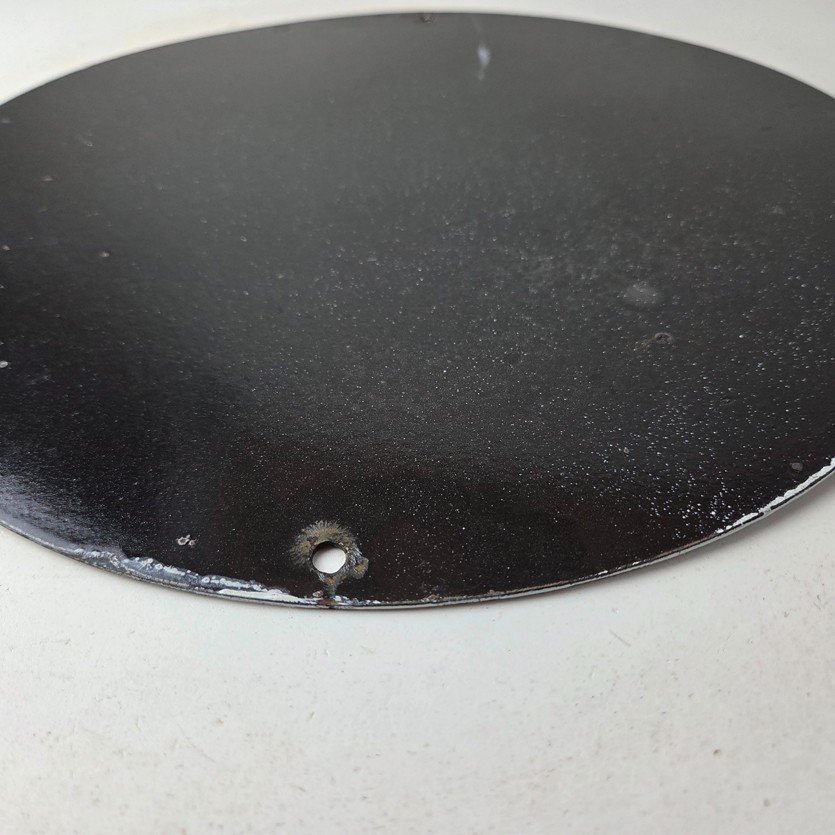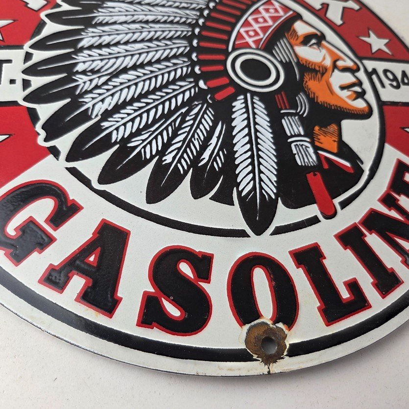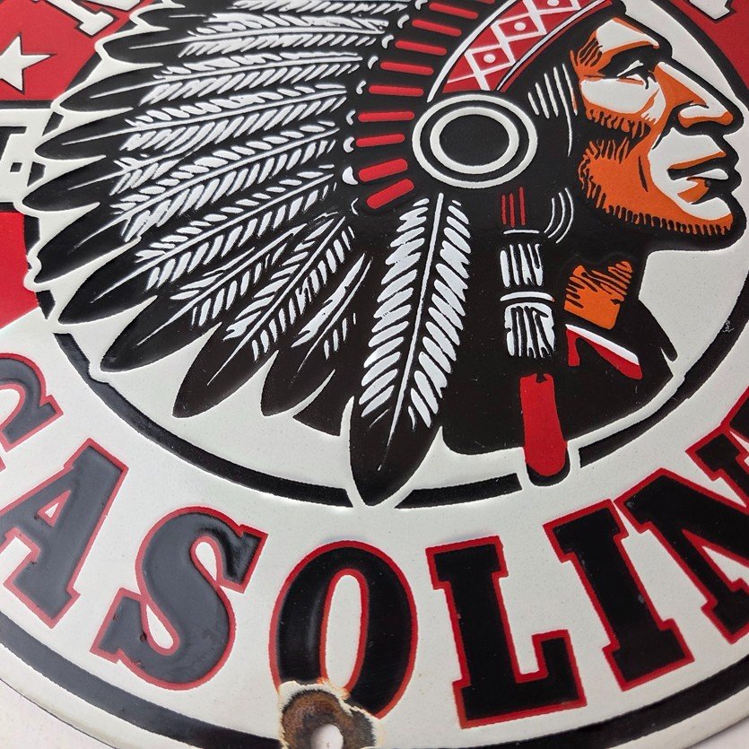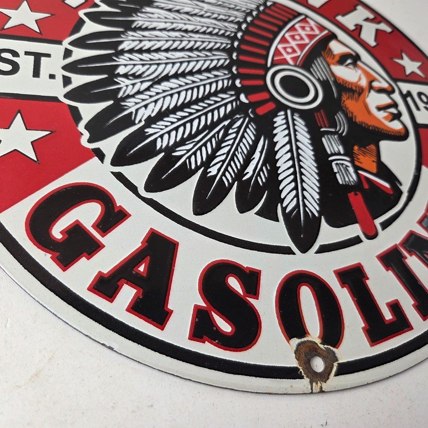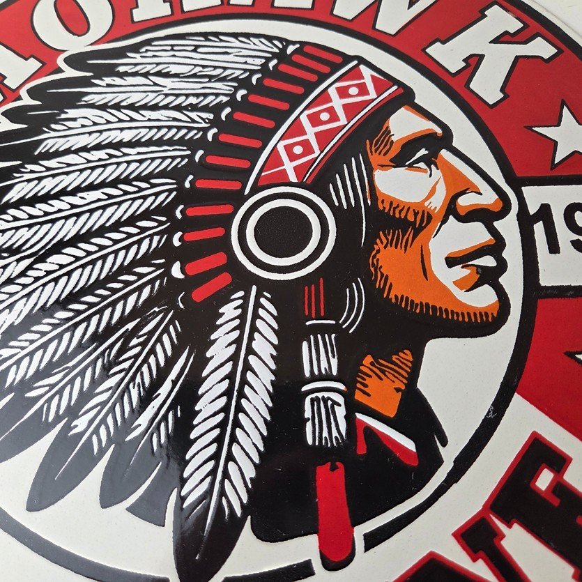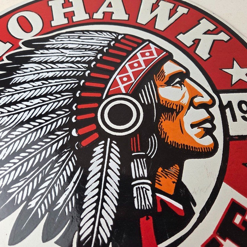 This vintage porcelain sign features the iconic Mohawk Gasoline brand lettering at the top and bottom. The sign is in vibrant colors and is perfect for collectors of gas and oil memorabilia or anyone who appreciates vintage advertising. The sign is made of porcelain and measures 12″ across.
