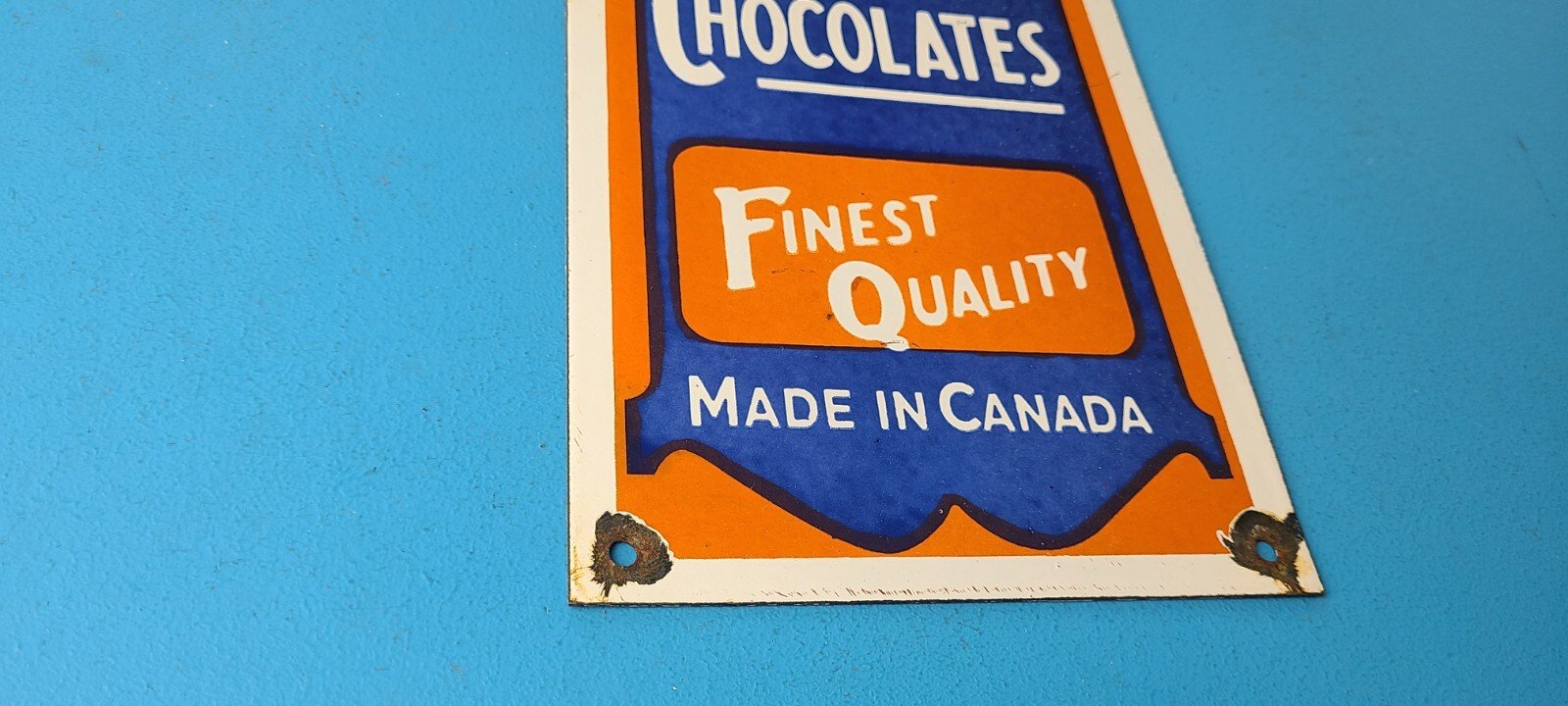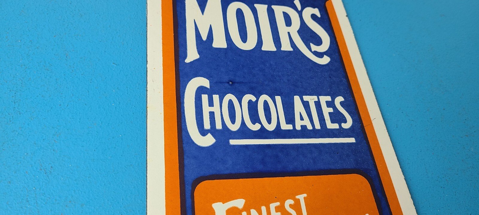 For sale is a vintage Moir’s Chocolate porcelain, gas service station & grocery store sign. Please view the pictures as they are part of the description (a picture is worth a thousand words)! I try my best to take pictures of all the angles of this sign. This sign has excellent colors and gloss. Sign measures 12” x 6″. Check out my other auctions, and feel free to ask questions. Perfect for gas collectors, automobile enthusiasts, sign collection, man cave, restaurant, bar, garage, displays anywhere. See my other gas & motor oil, aviation, automotive, soda & beverage signs. $10 for shipping anywhere in the U.S. with Priority Mail. Shipping will be $5.00 for each additional item! Thank you!
