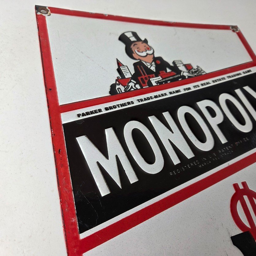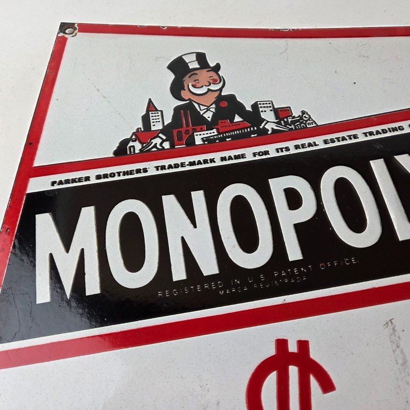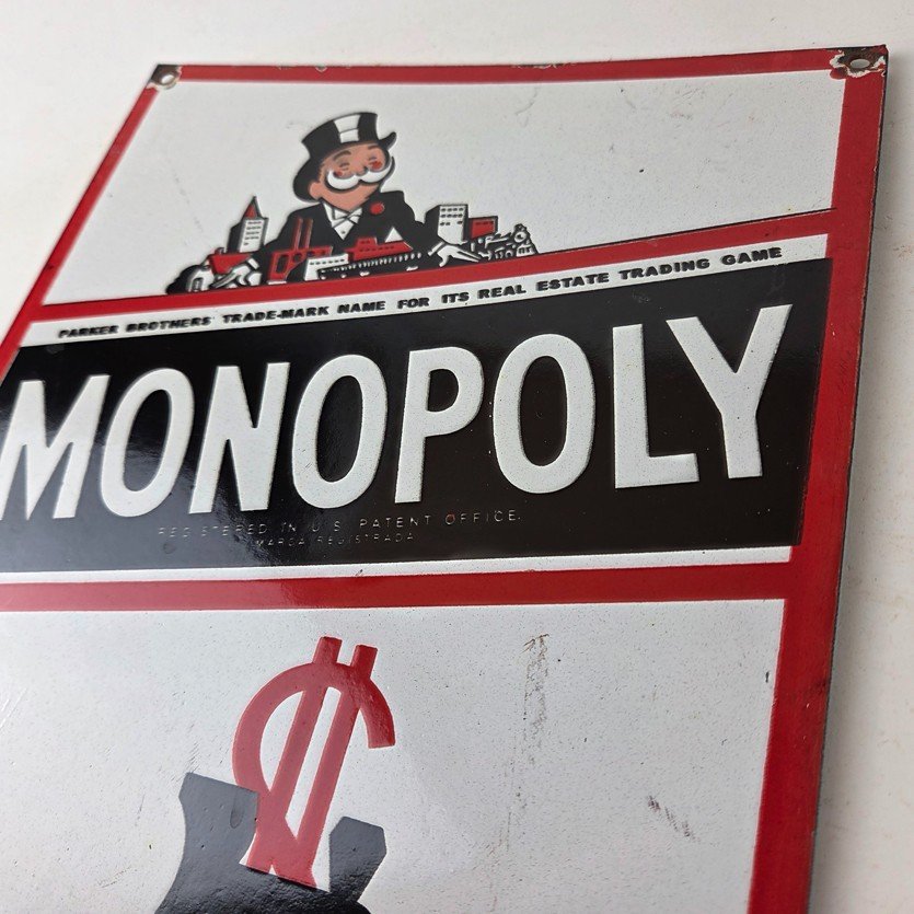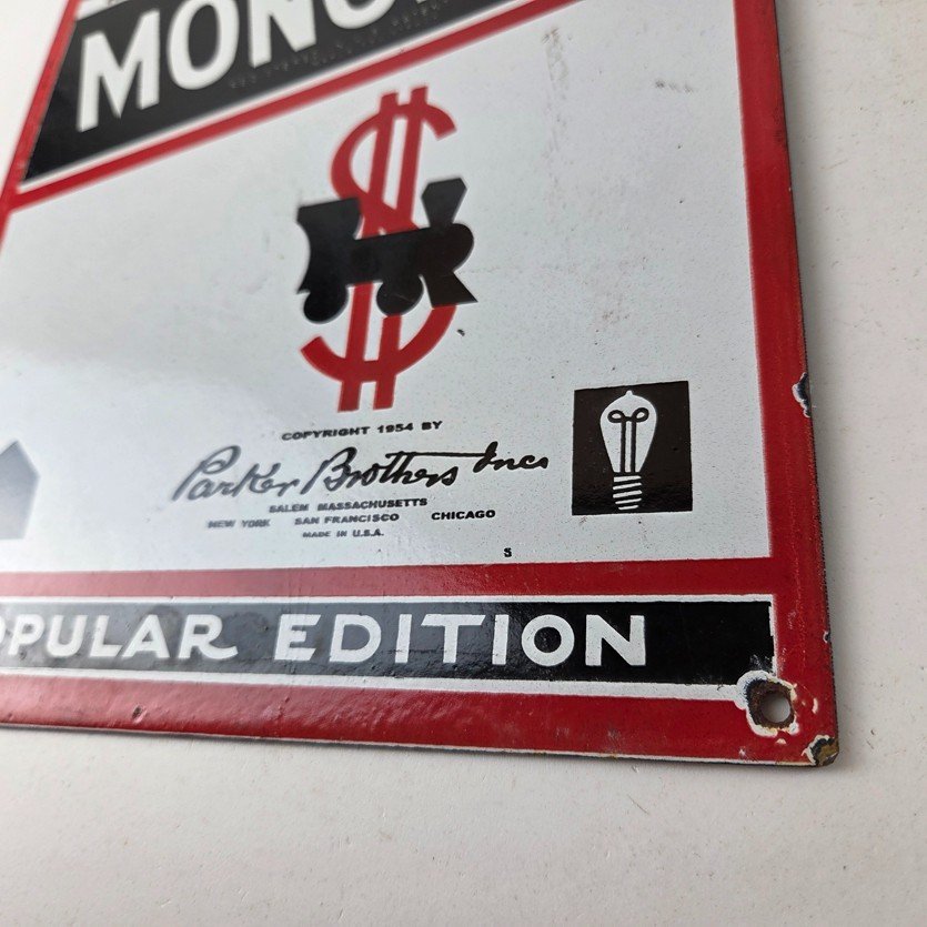 This vintage Monopoly Board Game porcelain sign features the iconic Board Game cover and showcases Mr. Monopoly at the top. Measuring at 12 inches by 8 inches, this porcelain gas sign is perfect for collectors and enthusiasts of gas & oil themed merchandise and memorabilia.