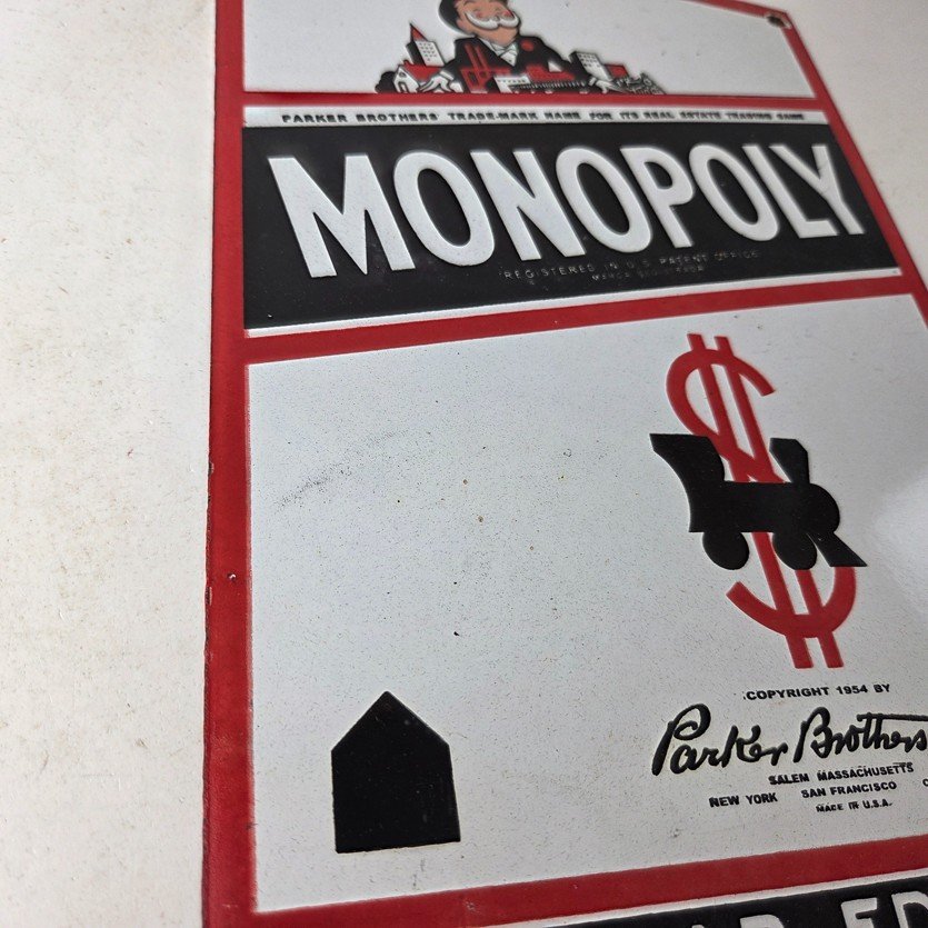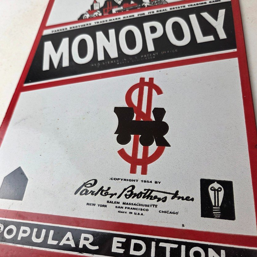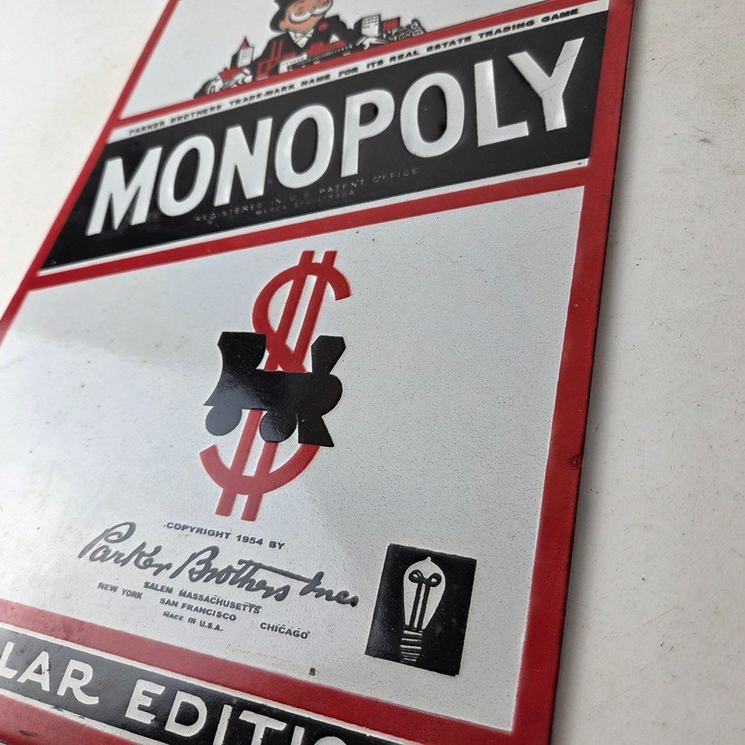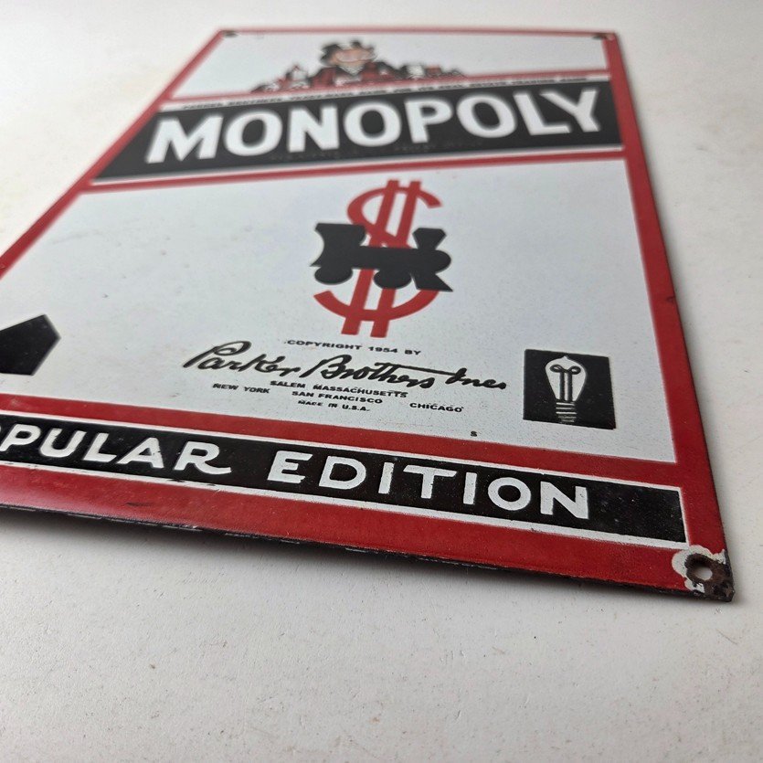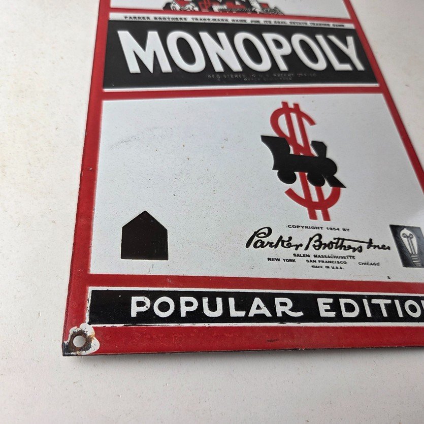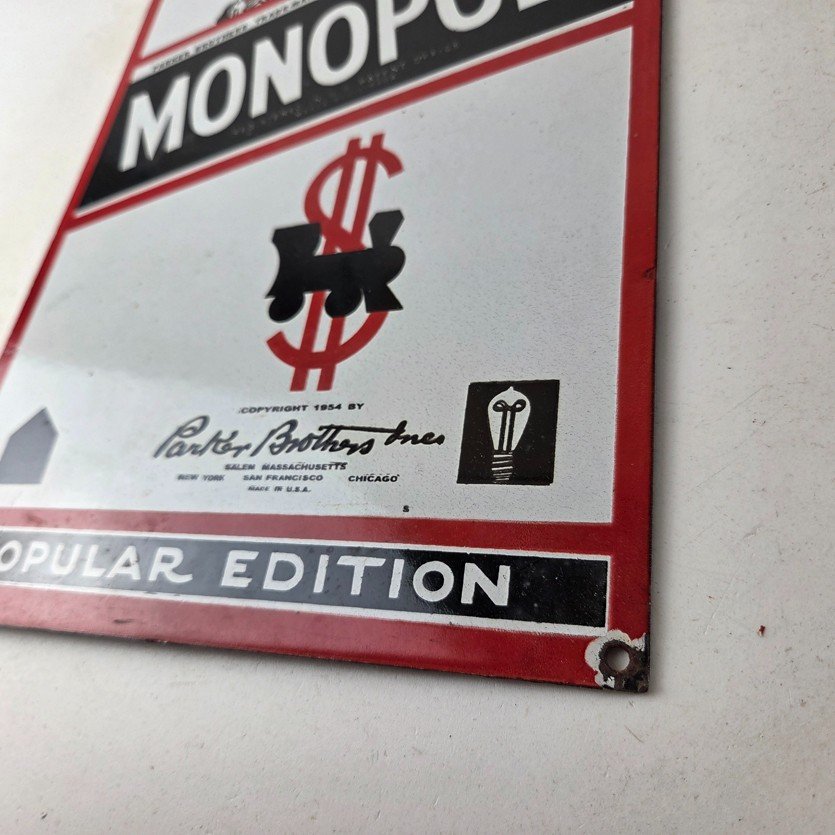 This vintage Monopoly Board Game porcelain sign features the iconic Board Game cover and showcases Mr. Monopoly at the top. Measuring at 12 inches by 8 inches, this porcelain gas sign is perfect for collectors and enthusiasts of gas & oil themed merchandise and memorabilia.