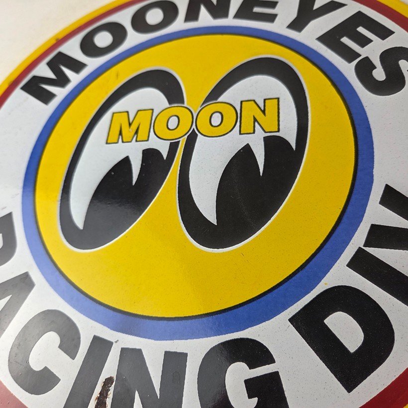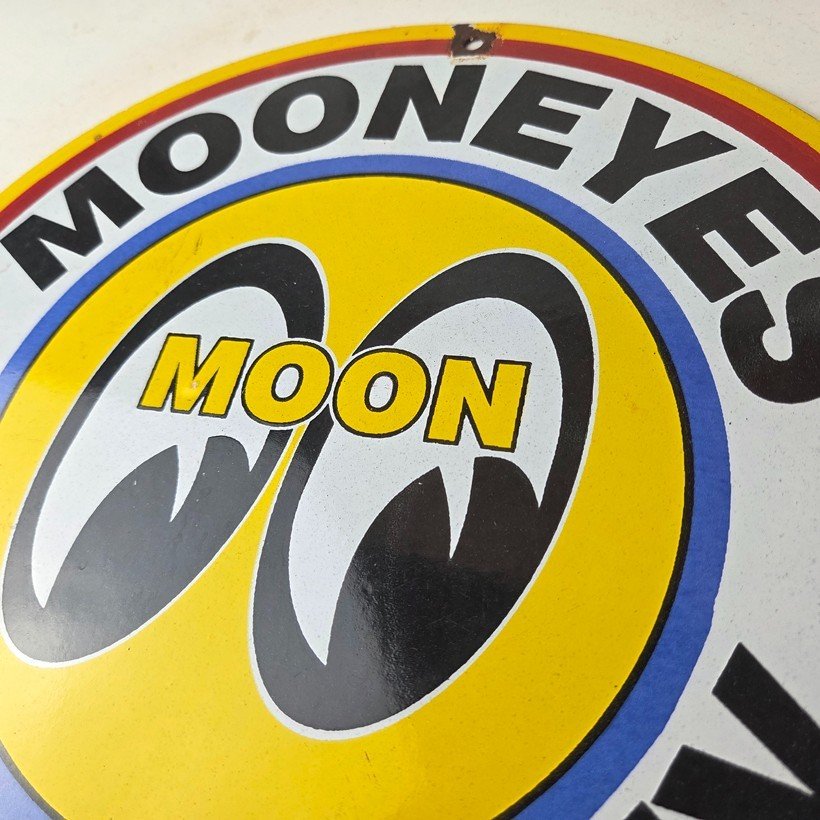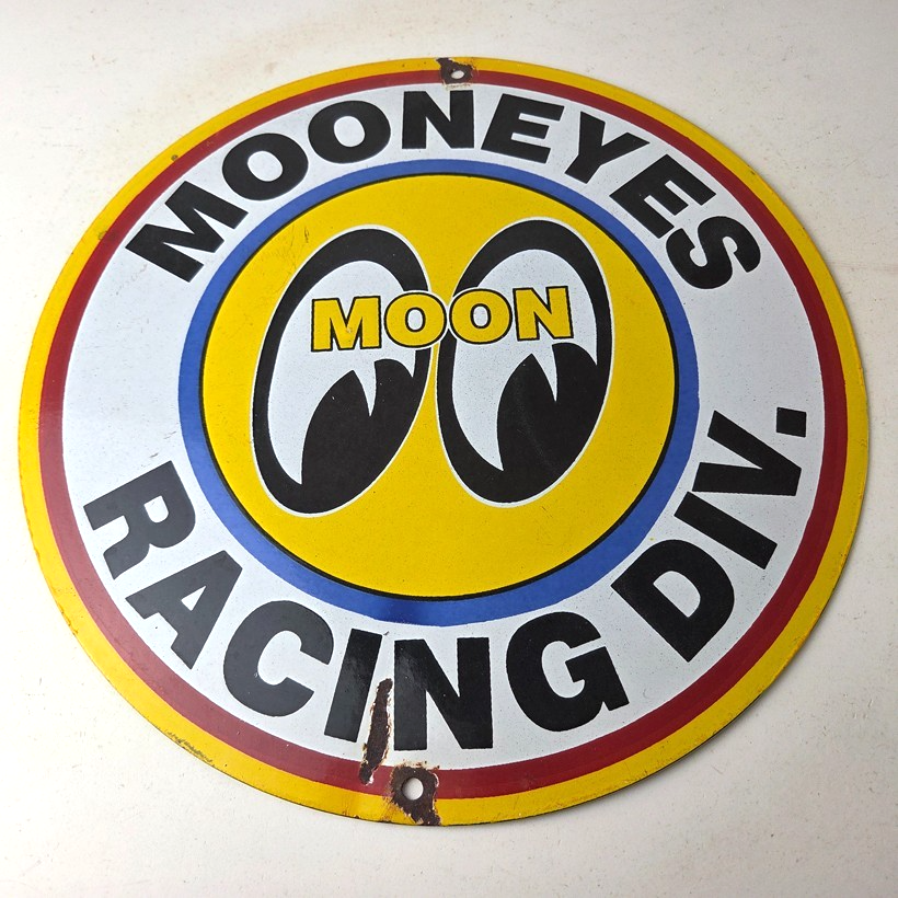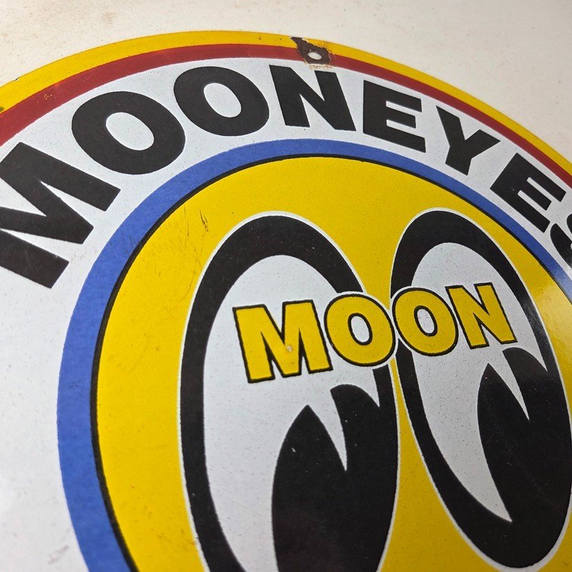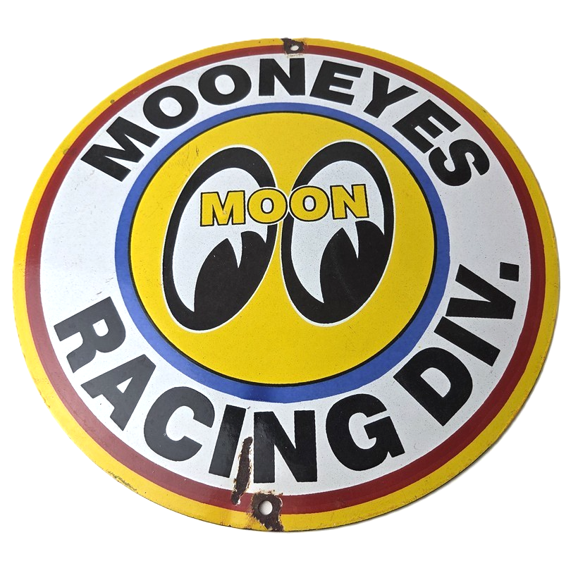 This vintage Moon Eyes Speed Equipment porcelain sign features large eyes in the center. The sign is made of high-quality porcelain and measures 12″ across.