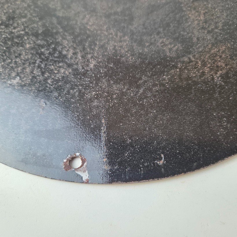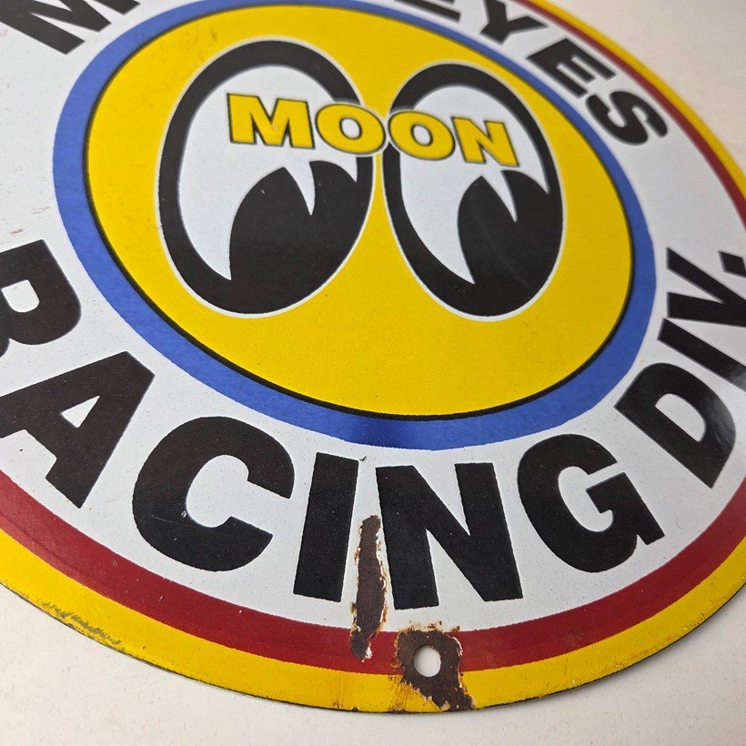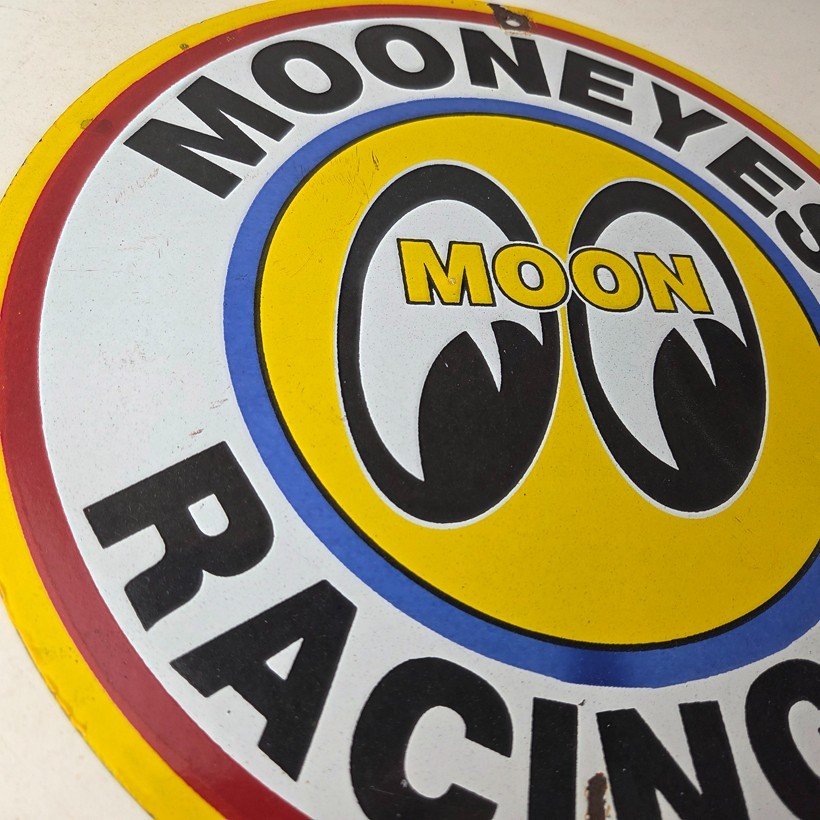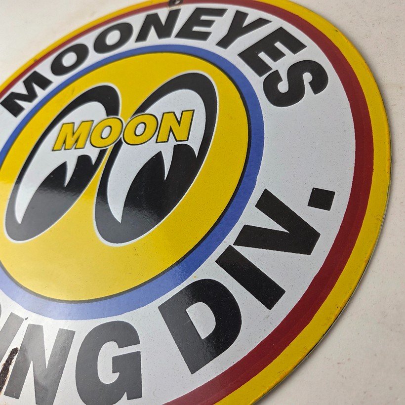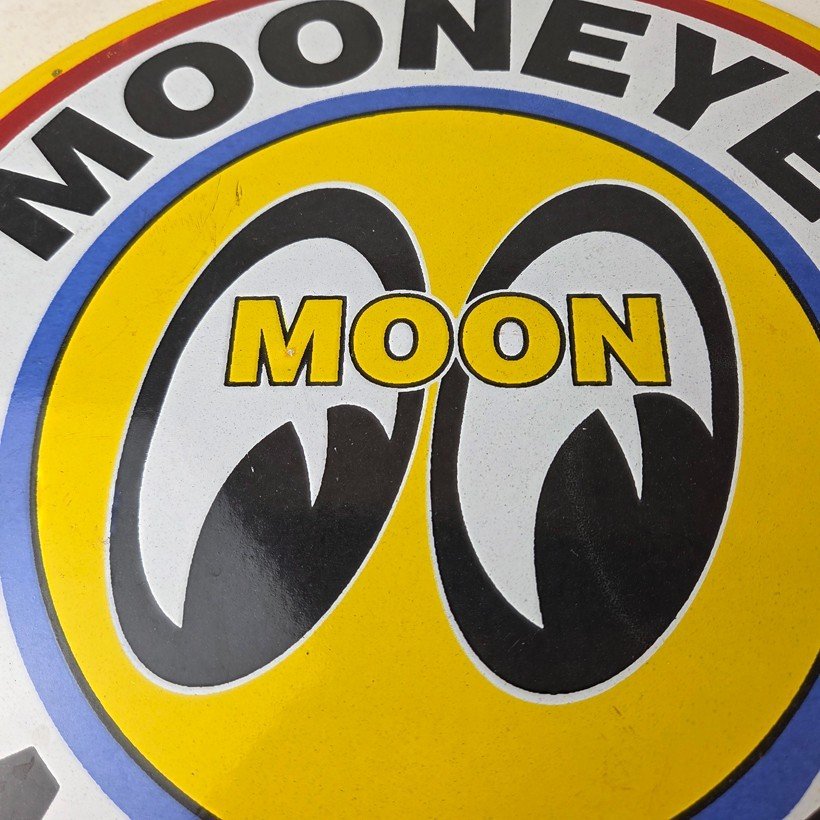 This vintage Moon Eyes Speed Equipment porcelain sign features large eyes in the center. The sign is made of high-quality porcelain and measures 12″ across.
