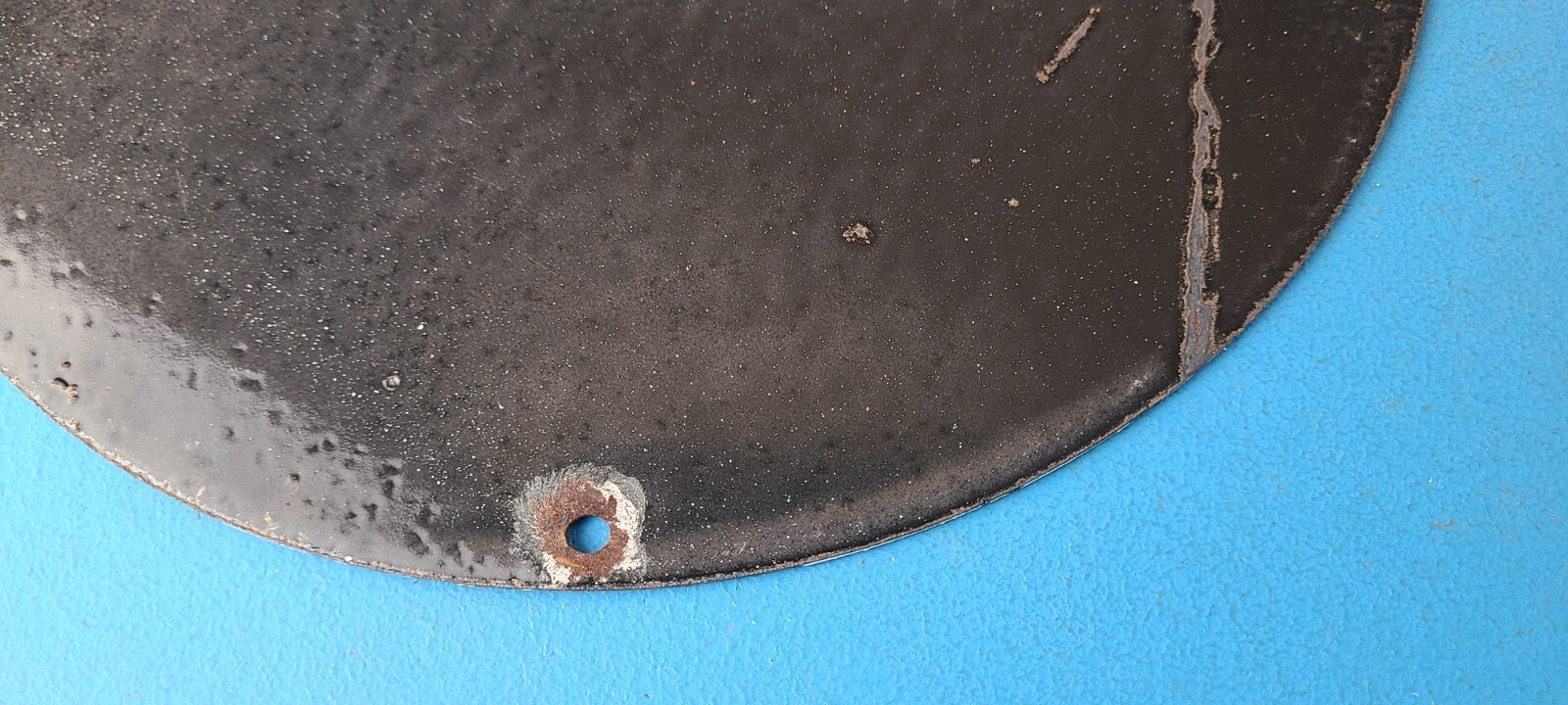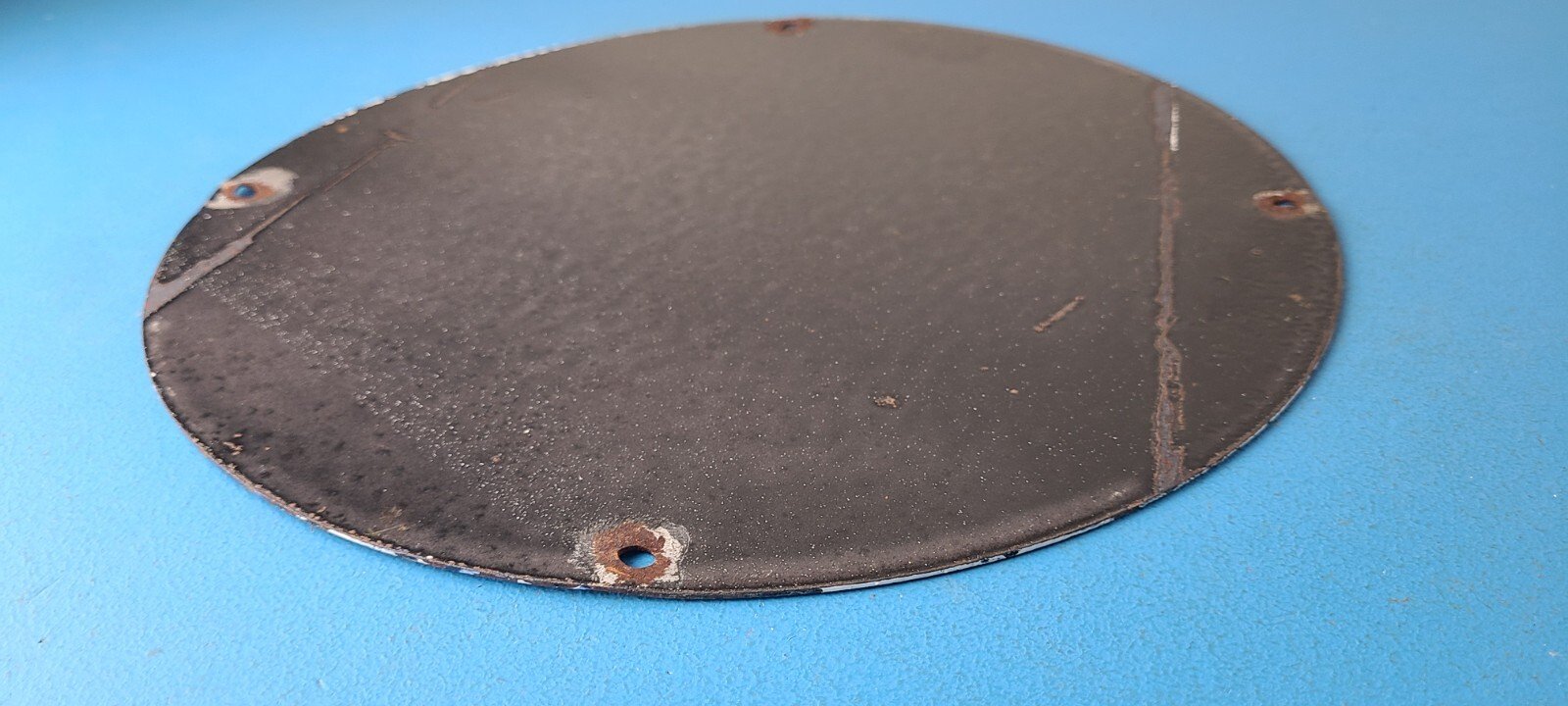 This vintage Moon Eyes Speed Equipment porcelain sign features large eyes in the center. The sign is made of high-quality porcelain and measures 12″ across.